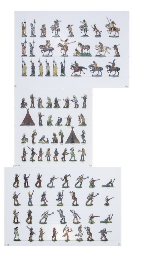 Huron and Mohican Indians /1. Chiefs, Warriors on foot and on horseback, Camp with Teepes and Calumets. Amateur painting. 83 Pieces in 3 plates. T.B.E.