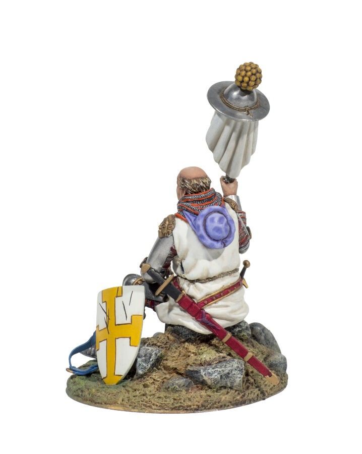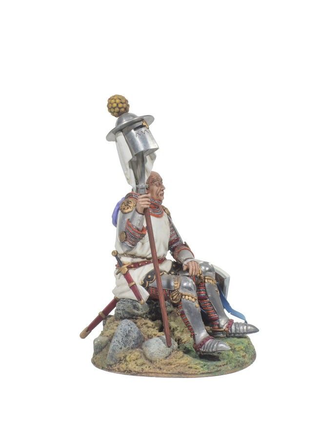 Middle Ages. In 90 mm. German knight. In 1340, seated with his sun helmet. Fine painting by : Jean Pascal Merlotti, on a base: Aitna. (1 Fig.). T.B.E.