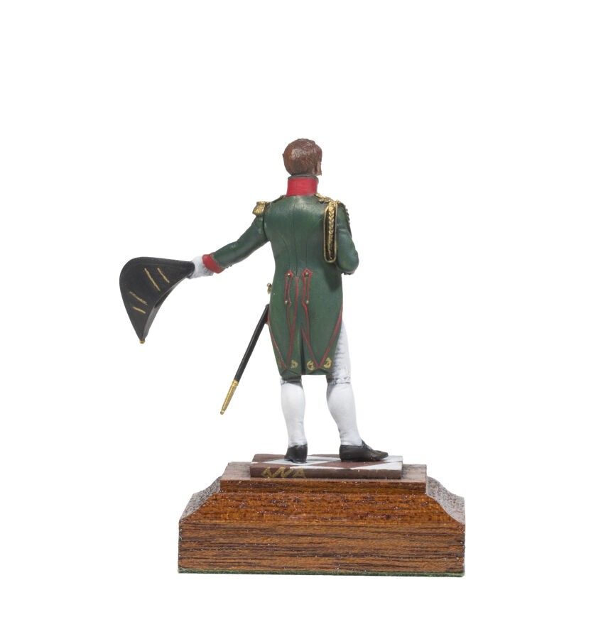 Fine painting by Anne-Paule André. 1st Empire. Officer of the Chasseurs de la Garde 1806. On a Métal Modèles base. Michel Saez sculpture. Beautifully signed, on a wooden base (1 Fig.). T.B.E.