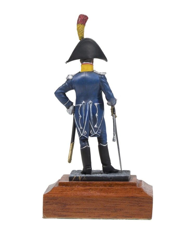 Fine painting by Anne-Paule André. 1st Empire. Officer of Voltigeurs Light Infantry 1809. On a Métal Modèles base. Michel Saez sculpture. Beautifully signed, on a wooden base (1 Fig.). T.B.E.