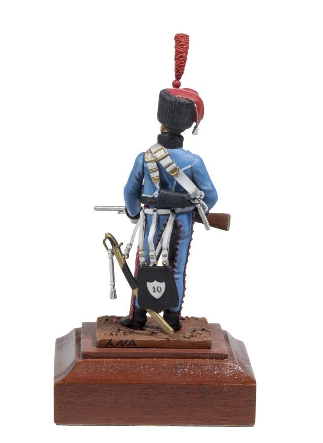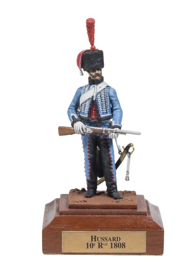 Fine painting by Anne-Paule André. 1st Empire. Hussar of the 10th Regiment 1808. On a Métal Modèles base. Bruno Leibovitz sculpture. Beautifully signed, on a wooden base (1 Fig.). T.B.E.