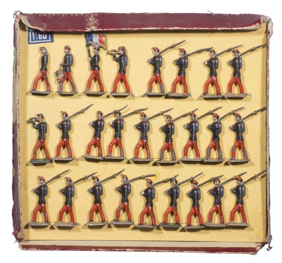 C.B.G. Mignot. 1914-18. Line infantry at the march. 1st Grandeur. With Flag, Drum and Bugle. Old manufacture before 1920. In original used box. (26 Fig.). B.E.