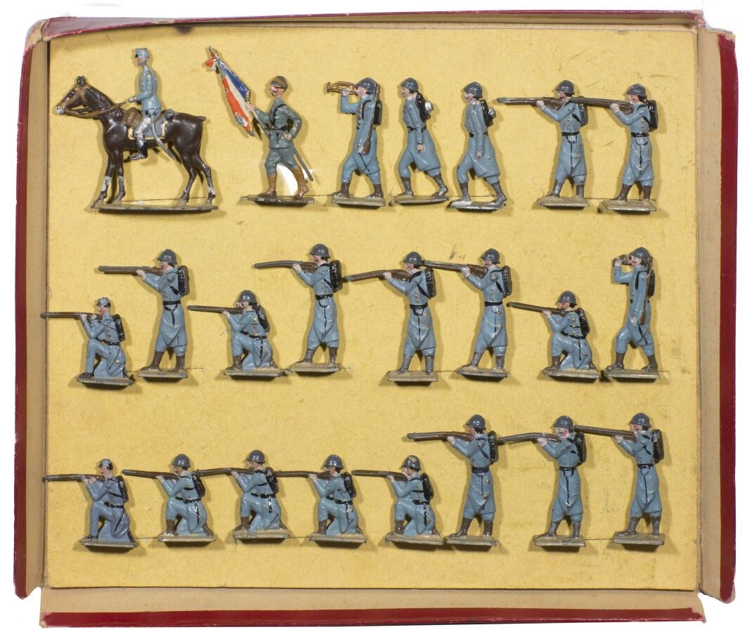 C.B.G. Mignot. 1914-18. Line infantry under fire. 2nd magnitude. With Officer on horseback, Flag and Bugler. Old manufacture before 1940. In original used box. (23 Fig.). Misses. GOOD CONDITION.
