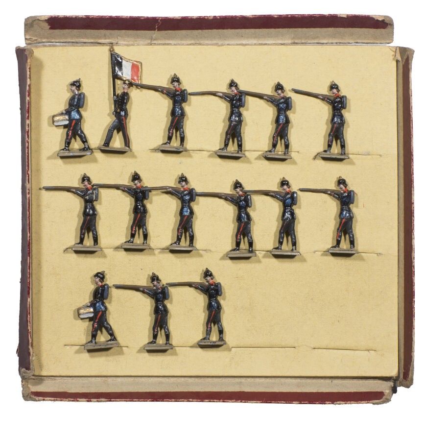 C.B.G. Mignot. Circa 1870. Prussians at Fire. 1st Size. With Flag and 2 Drums. Old manufacture before 1920. In original used box. (15 Fig.). B.E.
