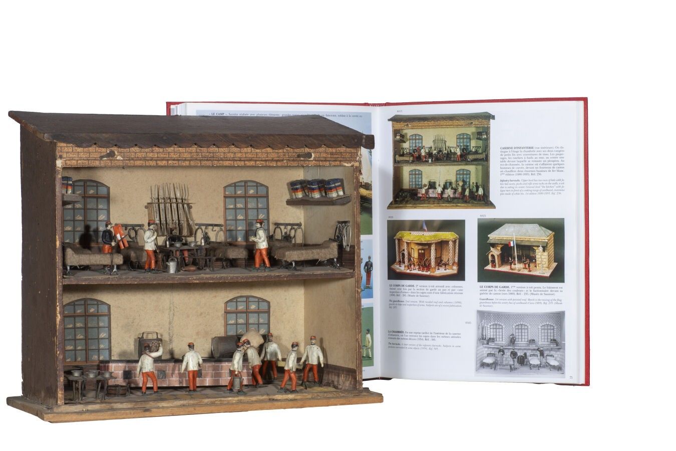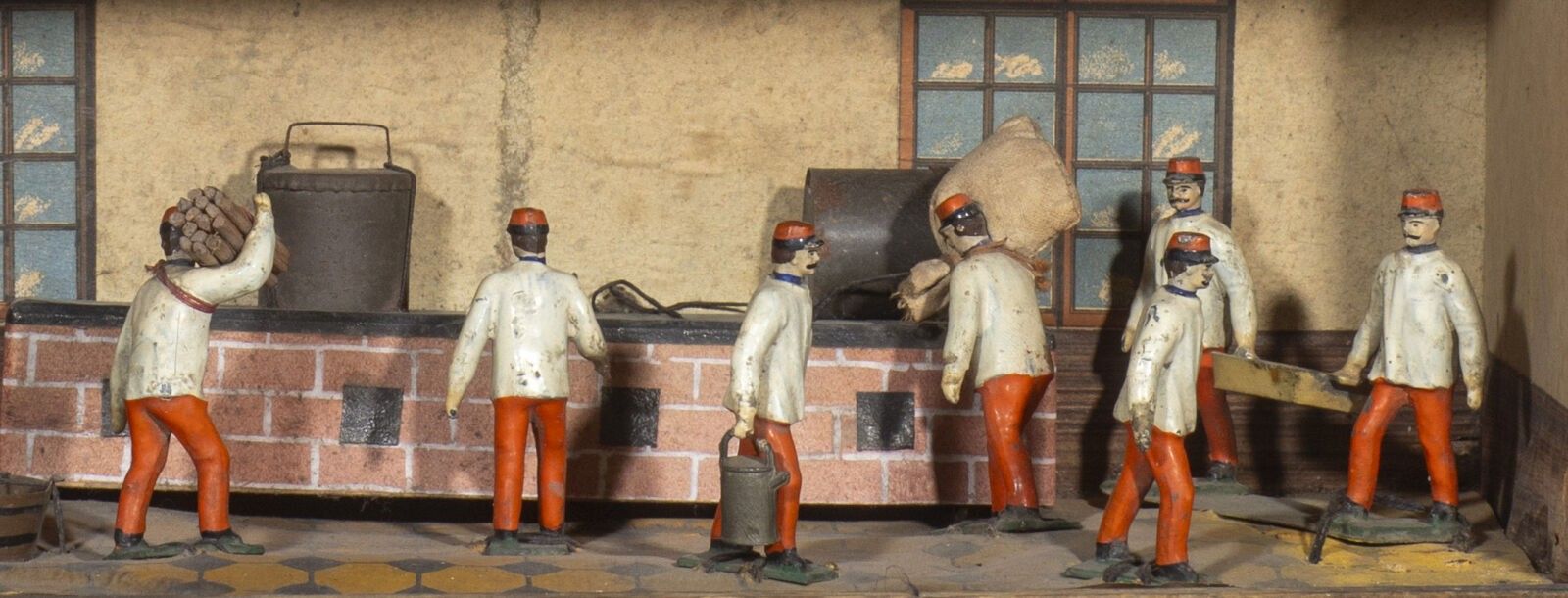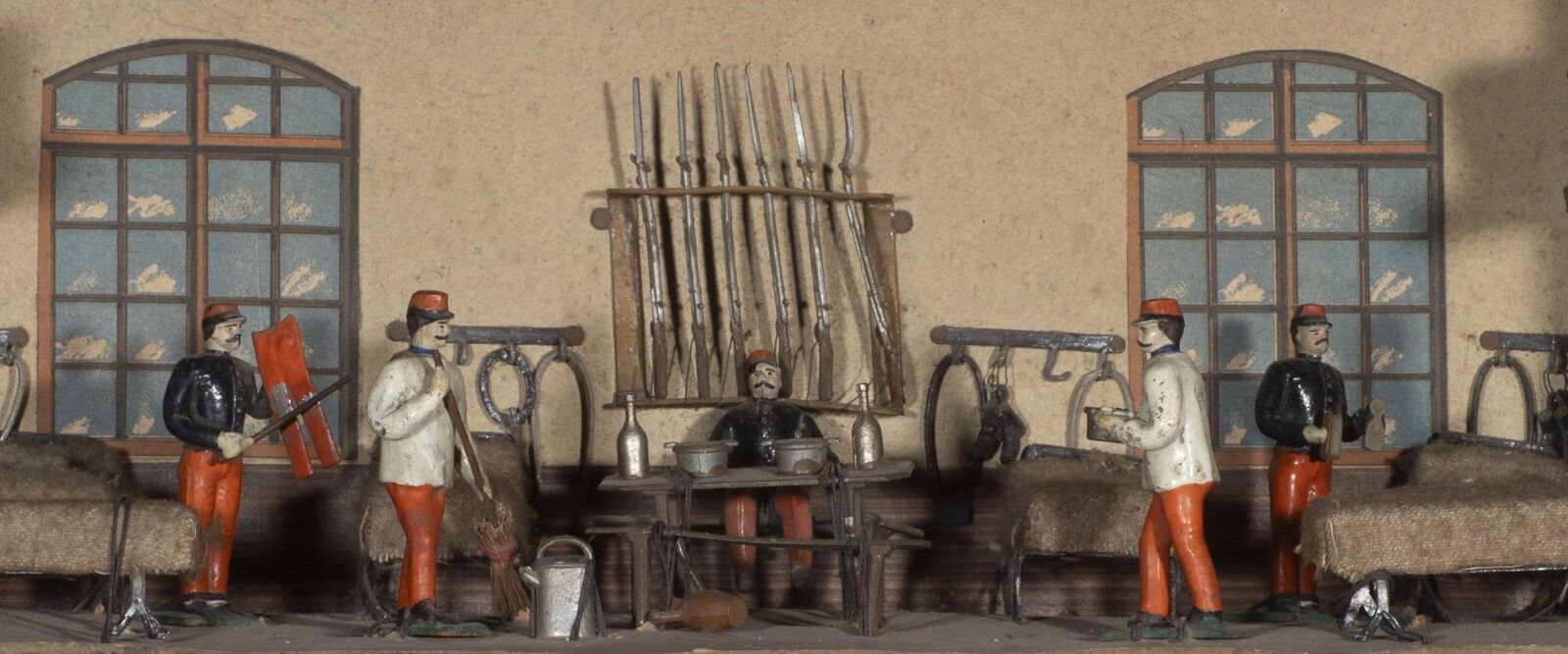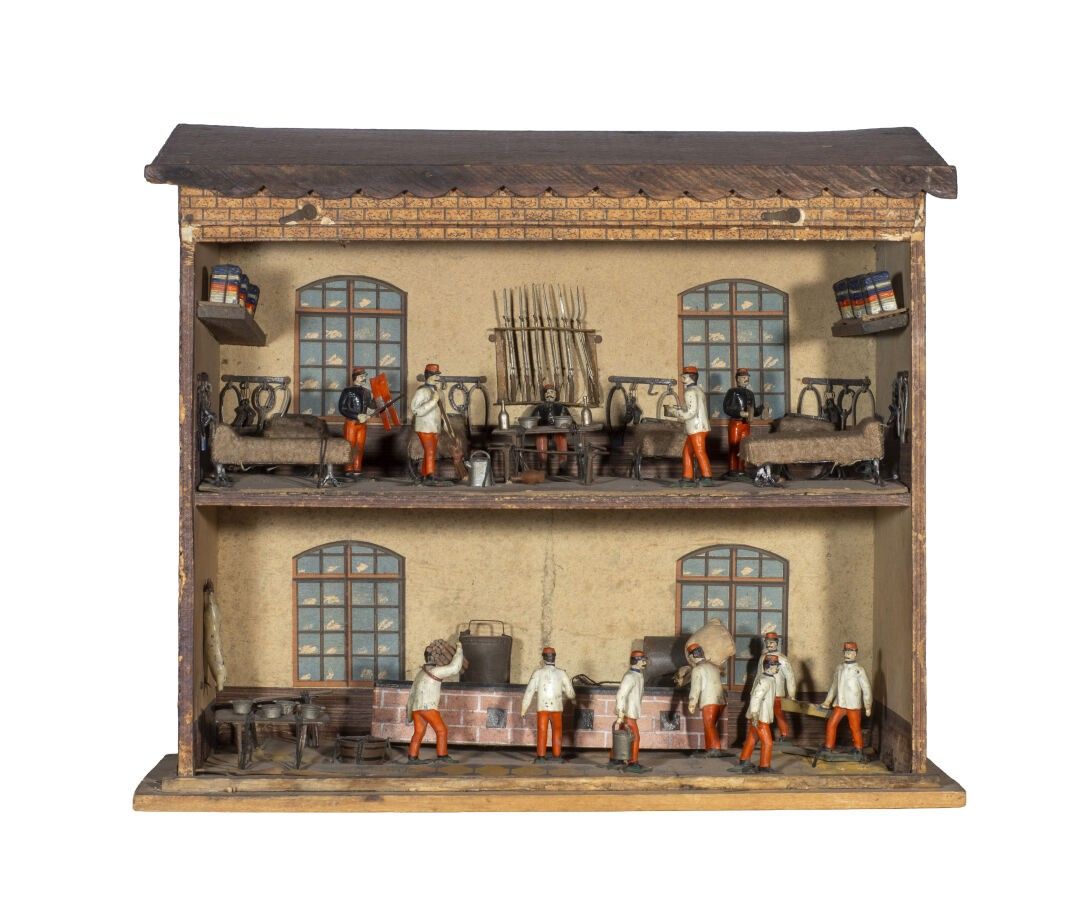 C.B.G. Mignot. Circa 1880. Infantry barracks. 1st Edition 1880-1893. This barracks has been photographed and appears in the excellent book: C.B.G. Mignot by Christian Blondieau, on page 75. With barrack room and kitchen filled with bowls and accessories as well as beds, gun racks and packs. With 12 figures held in their original attachments.