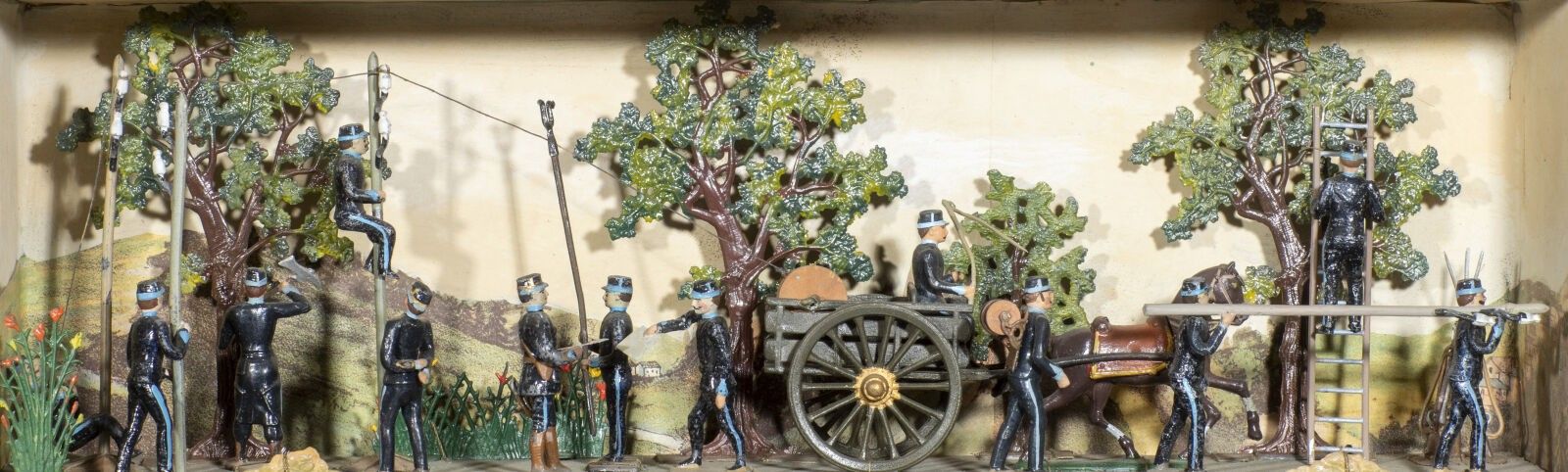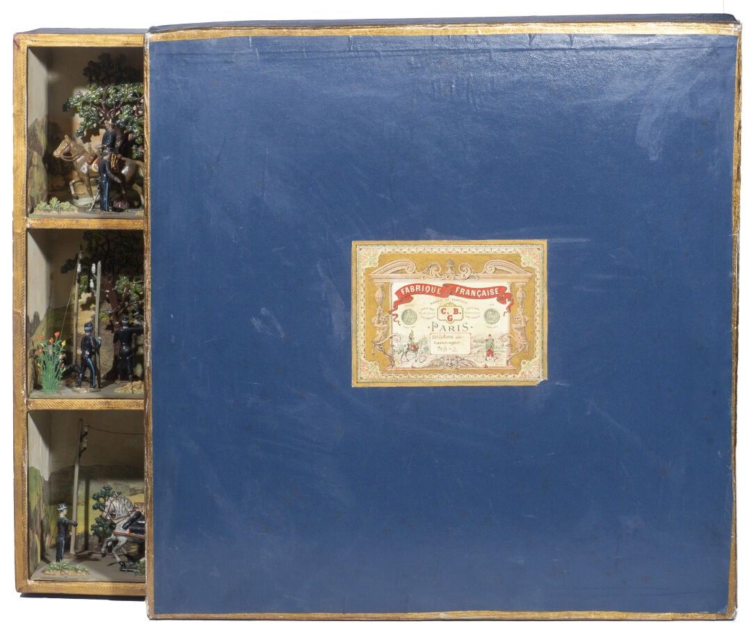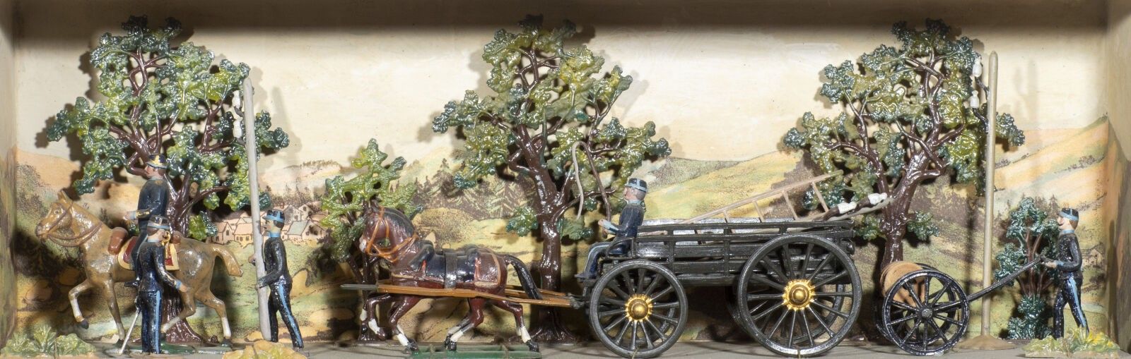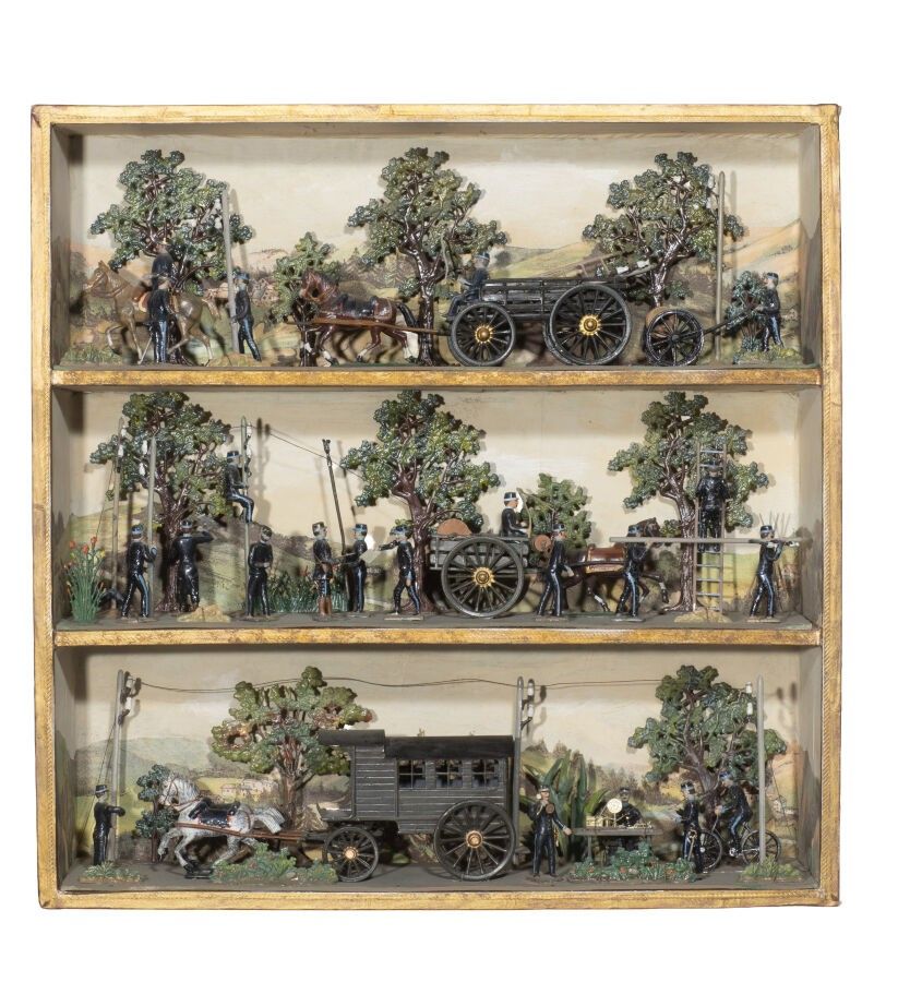 C.B.G. Mignot. 1914-18. Military telegraphers. 3-row diorama box entitled "Field Telephone". Telegraph poles, trees and accessories accompanied by 23 figures and 6 horses. Early edition circa 1915. Cover present. Exceptional condition for its age.
