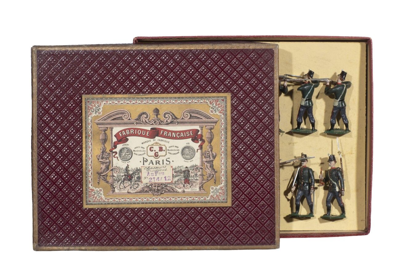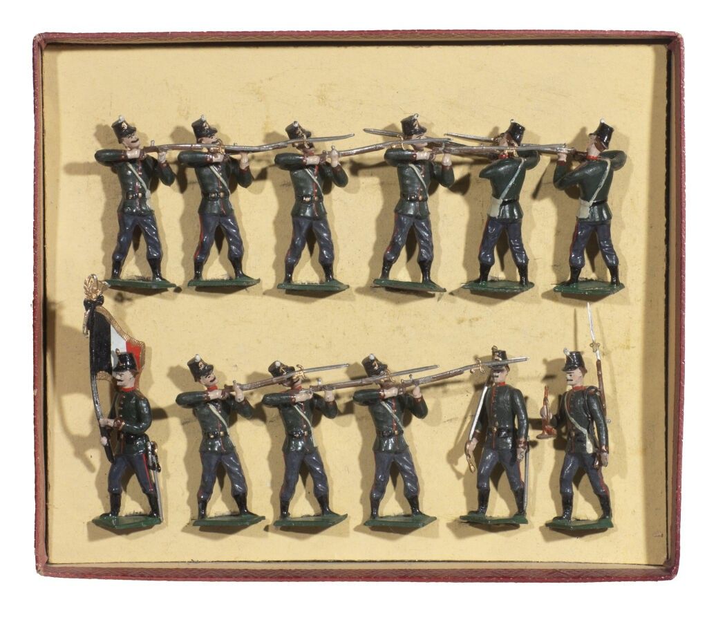 C.B.G. Mignot. Third Republic. Prussian Chasseurs under fire. Officer, Flag, Bugler and 9 Soldiers. Early edition circa 1900. In their box (12 pieces). One arm missing. B.E.