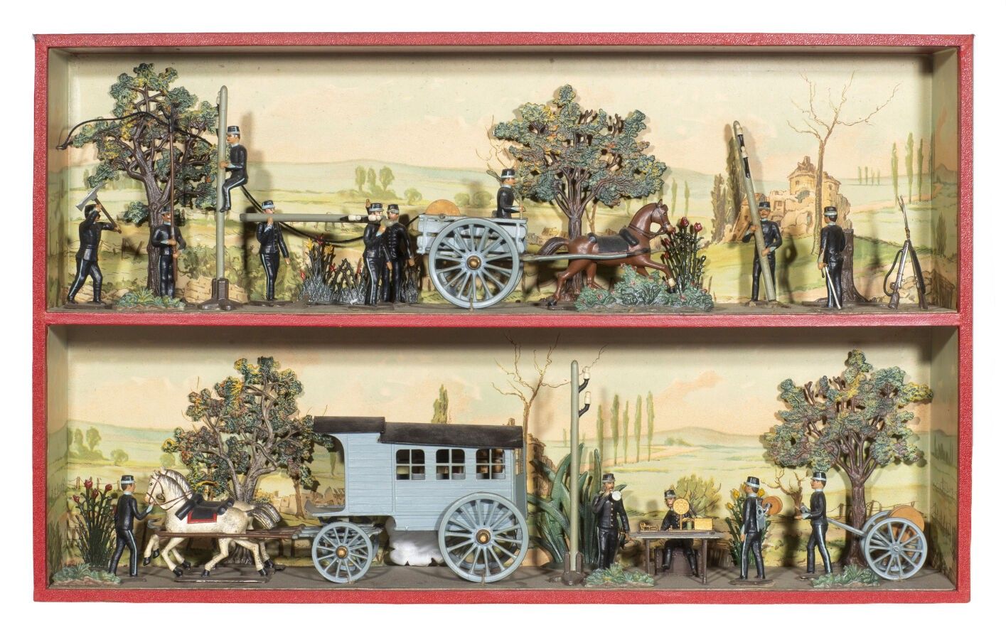 C.B.G. Mignot. 1914-18. Military telegraphy. 2 rows diorama box. Ref. 448. Telegraph poles, trees and accessories accompanied by 14 figures and 3 horses. Circa 1980. Lid present. T.B.E.