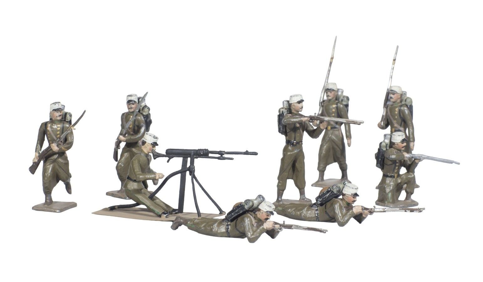 C.B.G. Mignot. Circa 1925. Foreign Legion under fire with white kepi and khaki uniform. Machine gun and 8 Soldiers in action. Old edition. (9 Fig.). B.E.