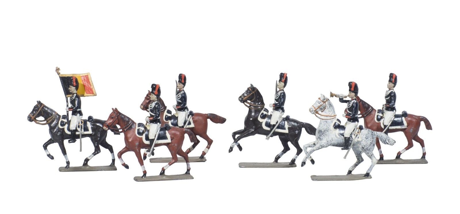 C.B.G. Mignot. Circa 1880. Belgian Army on horseback. A Flag, a Bugler and 4 riders with sabres. Editions circa 1970-80 (6 Fig.). B.E. to T.B.E.