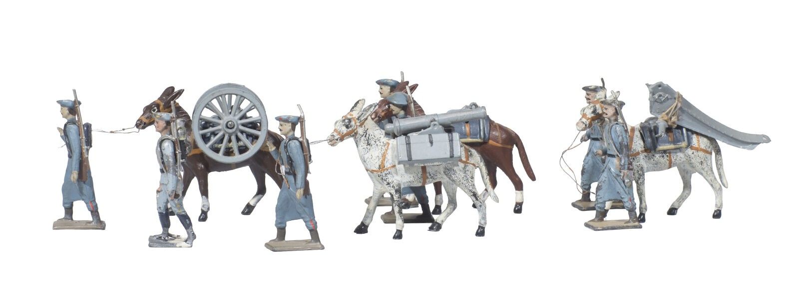 C.B.G. Mignot. 1914-18. Mountain Artillery. 7 Soldiers with Cannon and equipment on 4 Mules. Old editions (11 pieces). B.E.