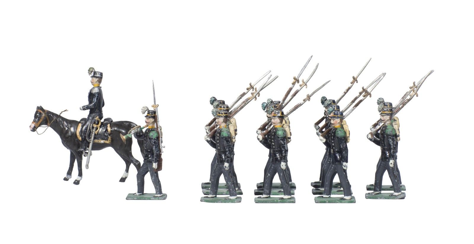 C.B.G. Mignot. Third Republic. Chasseurs à pied with Officer on horseback and Bugler. Antique Gerbeau edition circa 1885. With green terraces (13 Fig.). Medium to B.E.