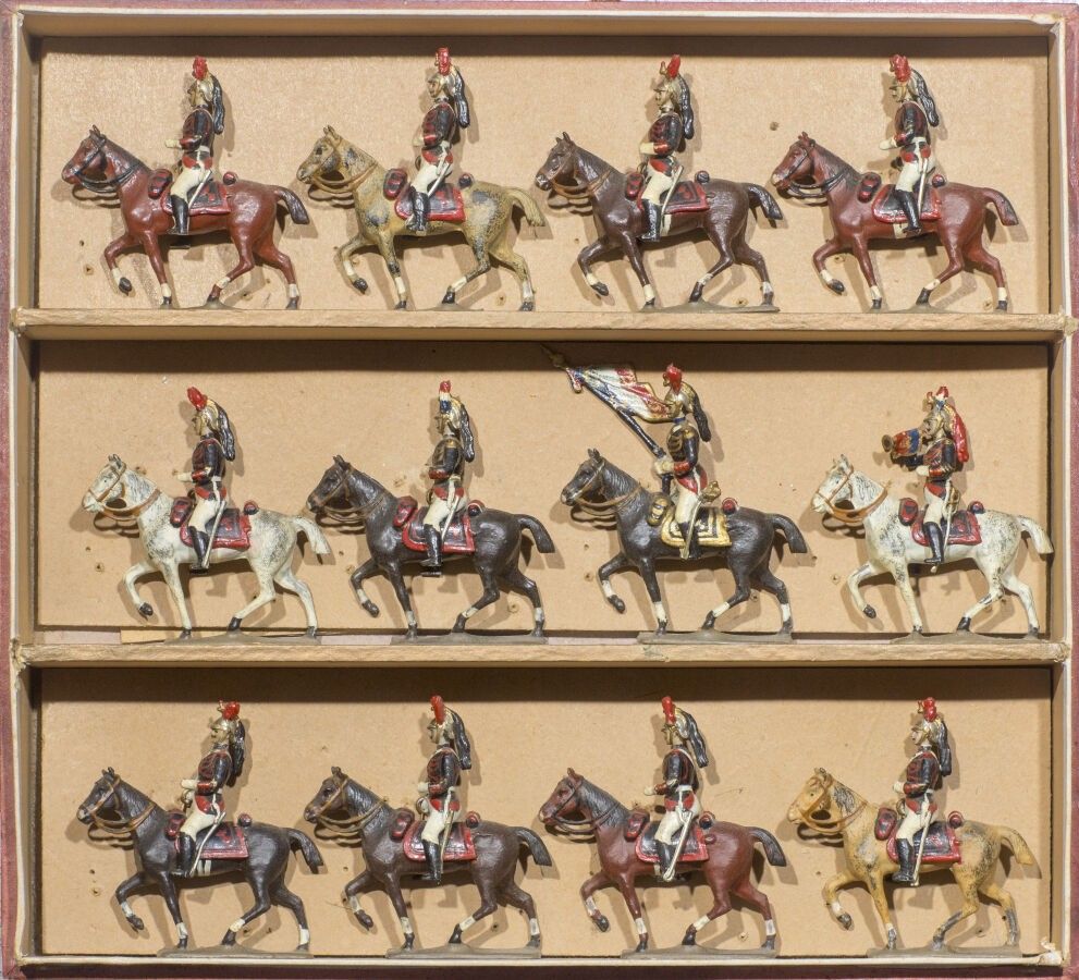 C.B.G. Mignot. Miscellaneous. Republican Guard. Officer on horseback, Flag, Drum, Trumpet and 9 Cavaliers with sabres. In a large original box (without lid). Old edition. (12 Fig.). B.E.