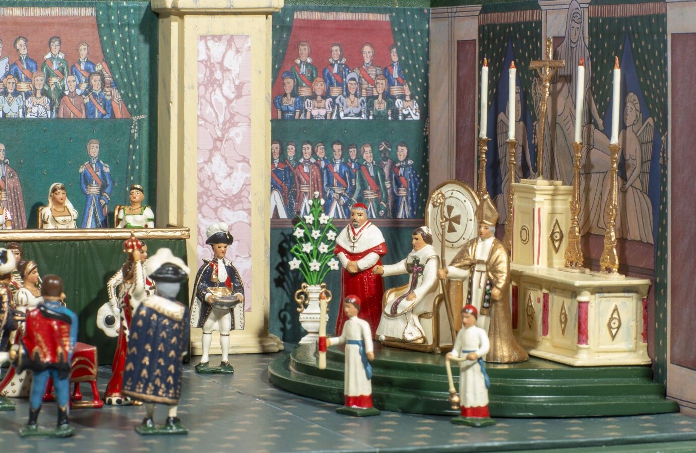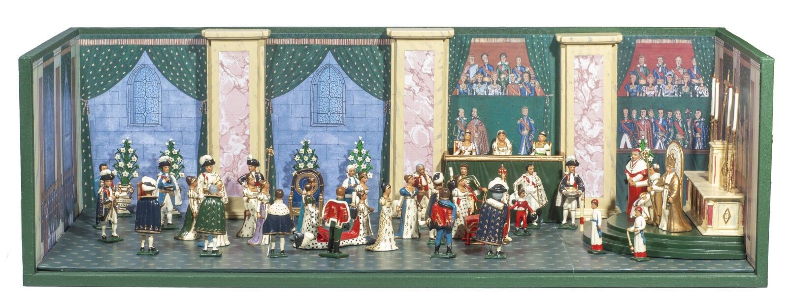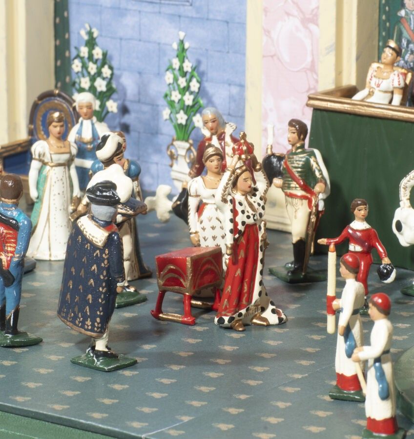 C.B.G. Mignot. 1st Empire. The coronation of Napoleon. Large Diorama box showing the interior of Notre-Dame-de-Paris cathedral. With Napoleon and Josephine, the Pope, the Archbishop of Paris and the choirboys, Eugène and Hortense de Beauharnais, Murat, Moncey, Louis and Caroline Bonaparte, Duroc, Cambacérès, etc... (38 Fig. + candlesticks and accessories). Mint condition.