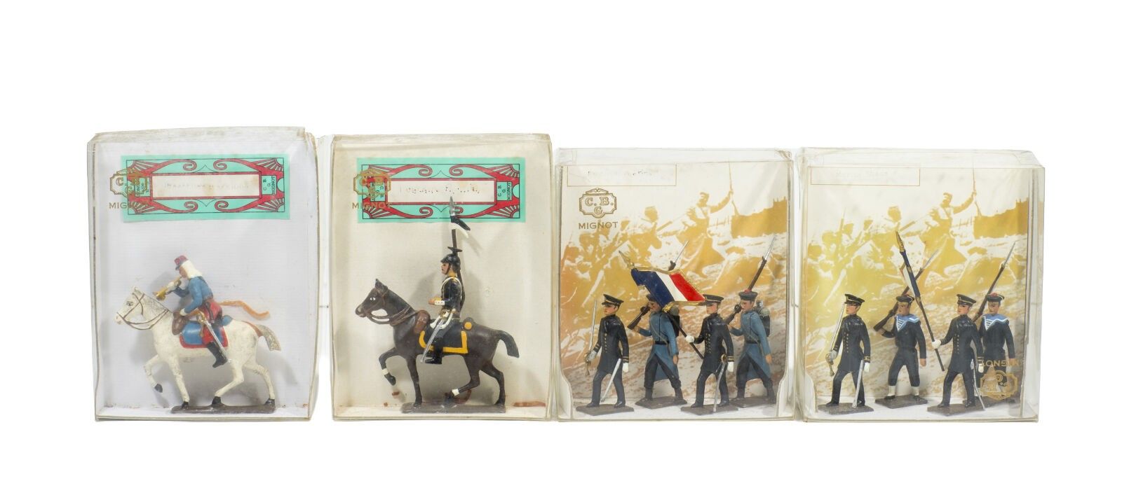 C.B.G. Mignot. 1900-18. Marines and Fusiliers Marins. 2 Officers, 6 Sailors including a Flag, Legionnaire and Prussian Uhlan on horseback (10 Fig.). Brand new in 4 boxes.