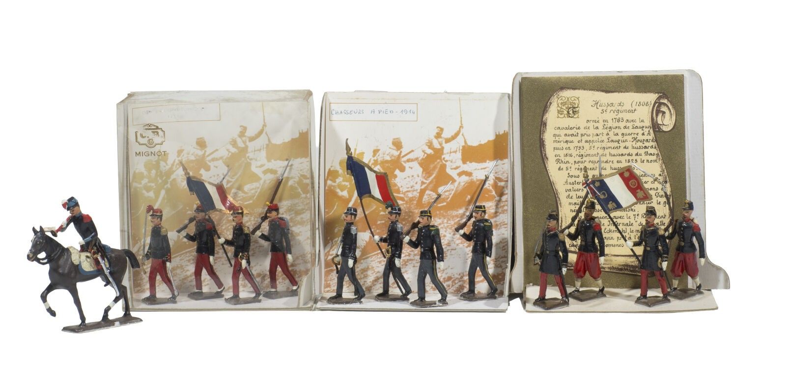 C.B.G. Mignot. 1852-70. Infantry, various and Saint-Cyr. 12 Foot-soldiers including 3 Flags and a Cavalier. (13 Fig.). New in 4 Boxes.