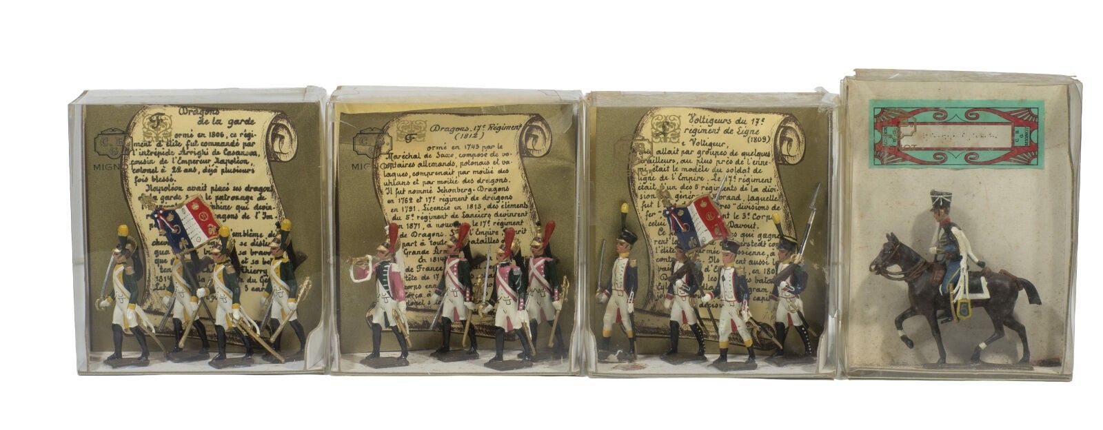 C.B.G. Mignot. 1st Empire. Foot Dragoons and Voltigeurs, one Hussar (broken plume). 12 Foot soldiers including 2 Flags and a Cavalier. (13 Fig.). Brand new in 4 boxes.