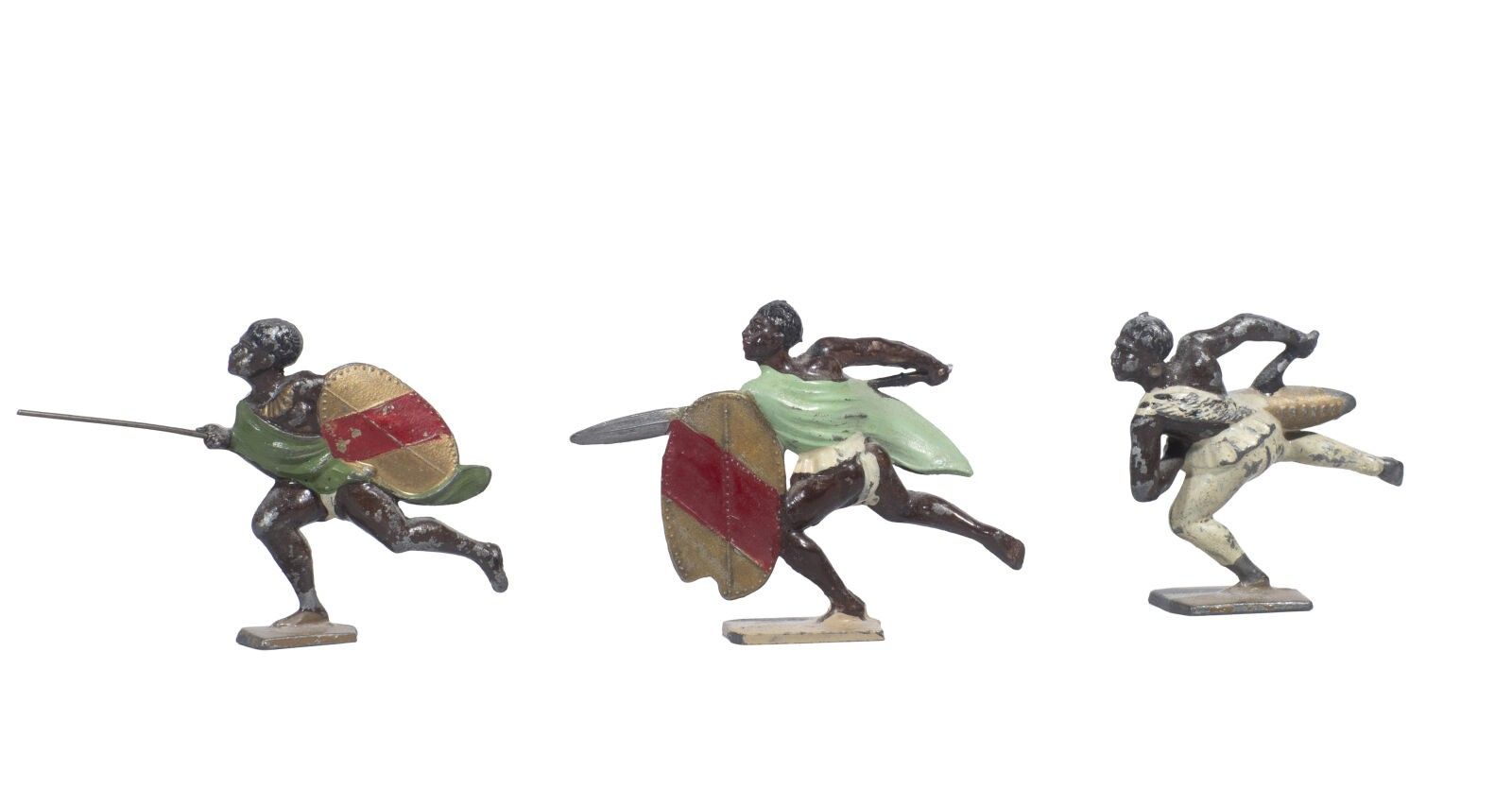 G.M. The Africans /2. In 60 mm. Warriors with drum, assegais and shield. (3 Fig.). B.E.