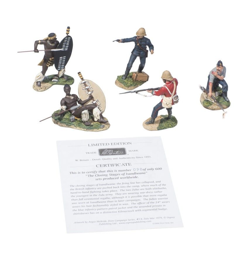William Britain. Zulu War 1879/9. Osprey Art Series. Out of print set called "The Closing Stages of Isandlwana". Limited edition numbered 098/600 with certificate. Ref. 20024. (5 Fig. + Accessory). Brand new in box.