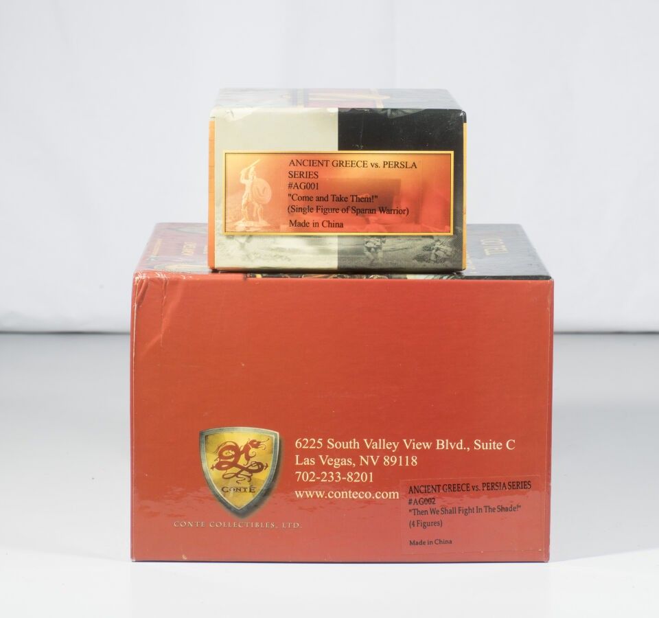Conté. Spartans (300) versus Persians /1. Greek warriors and chiefs in combat. Sets sold out. Ref. AG001 and AG002. (5 Fig.). In 2 boxes. T.B.E.