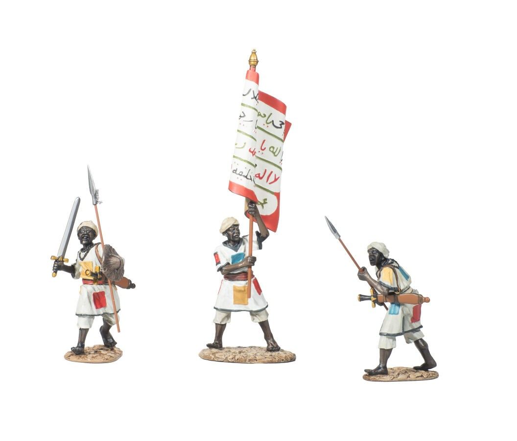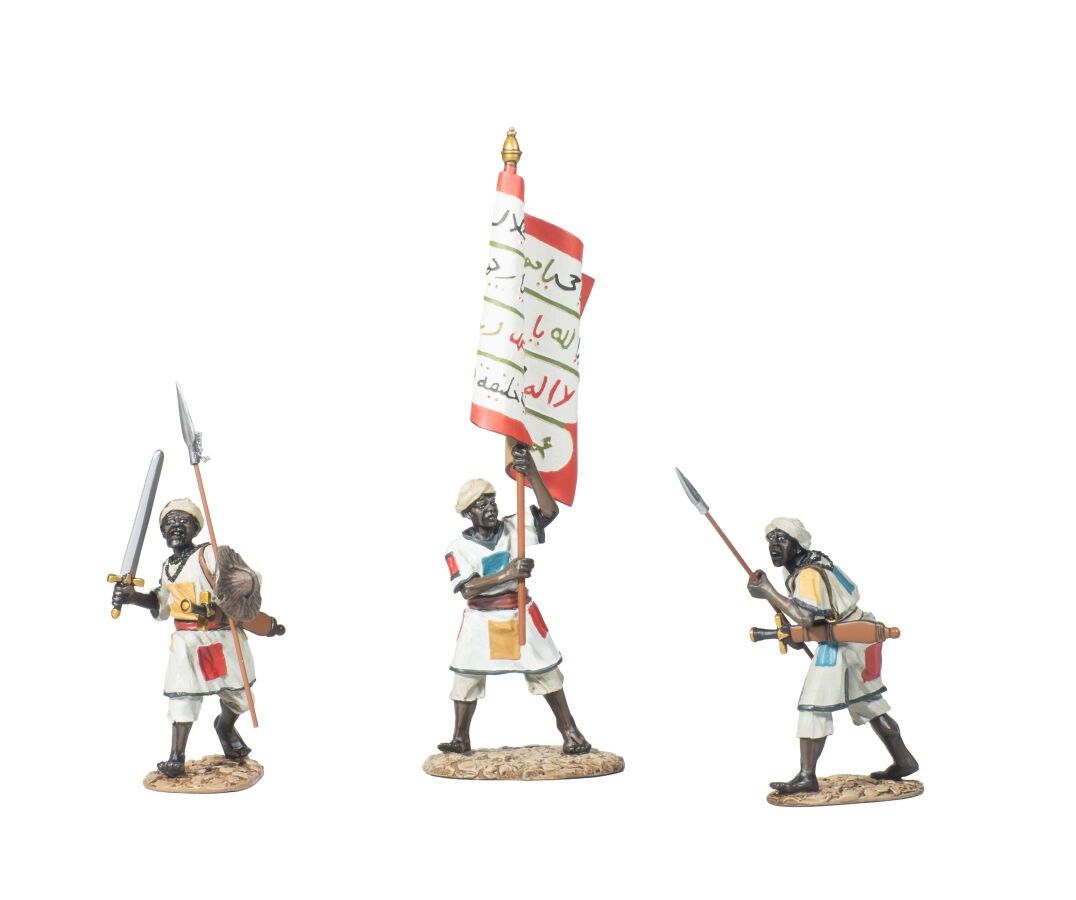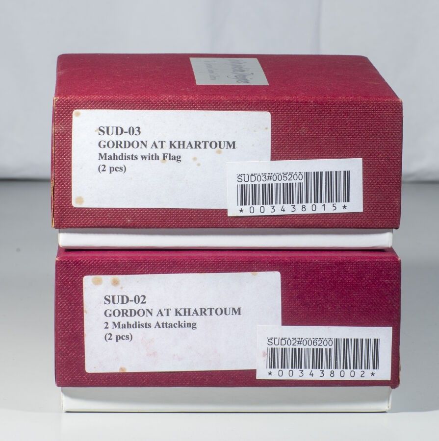 John Jenkins. Sudan War 1884-85. Gordon at Khartoum /2. Mahdists attacking with Flag and Sagaies. Sets sold out. Ref SUD-02 and SUD-03. (3 Fig.). 2 new boxes.