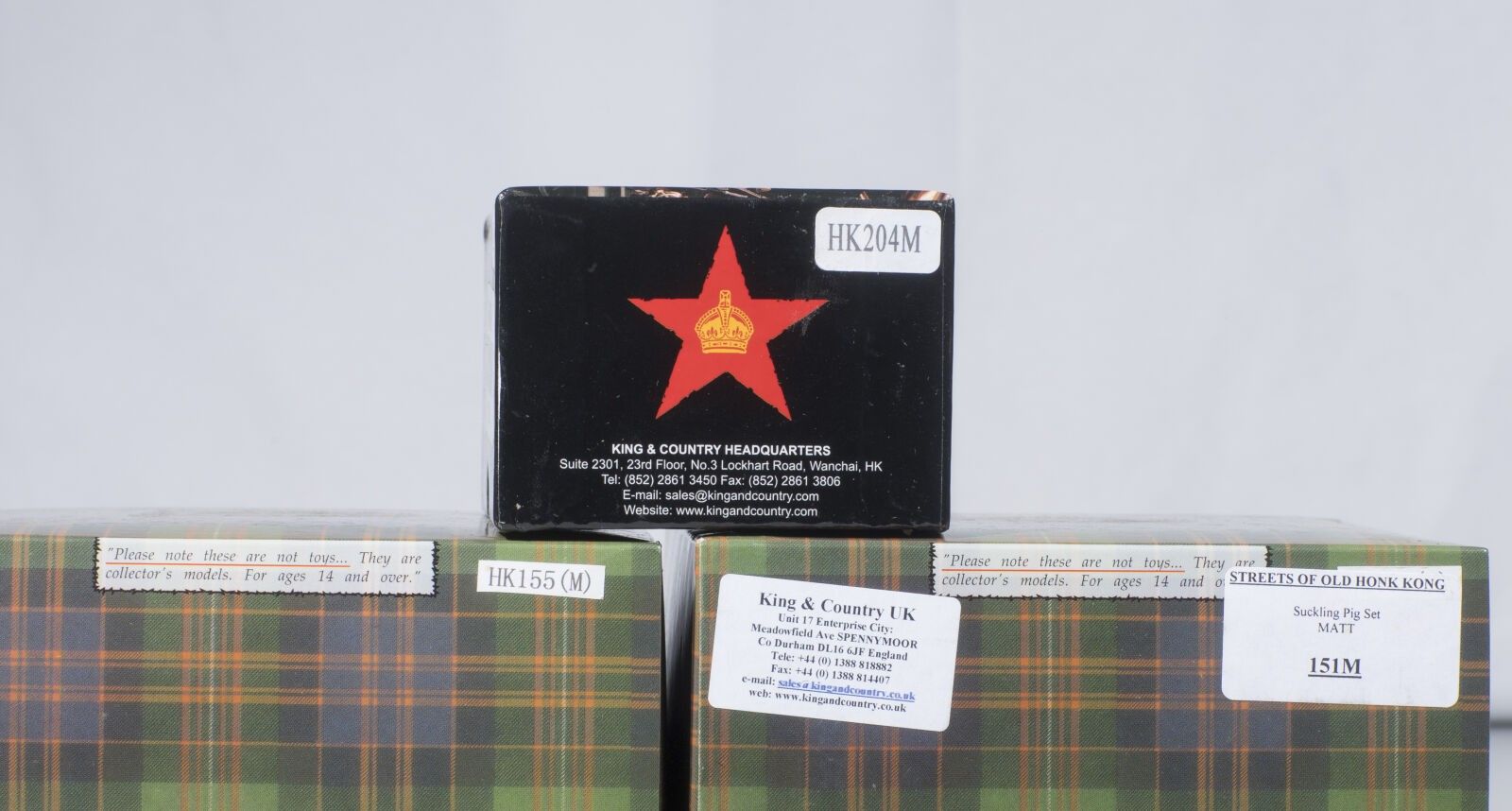 King & Country. Streets of old Hong Kong. Shoeshine stand, Sailor at-ease, Suckling pig. 4 figures with accessories. Sets sold out. Ref. HK155 M, HK204 M and HK 151 M Mate versions. 3 new boxes.