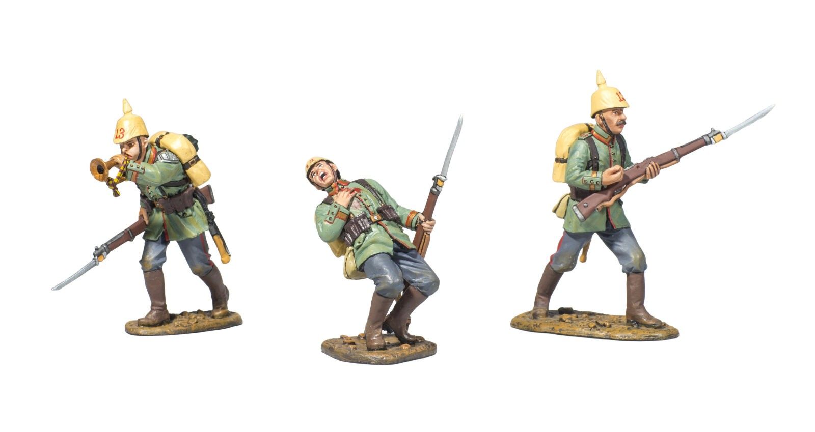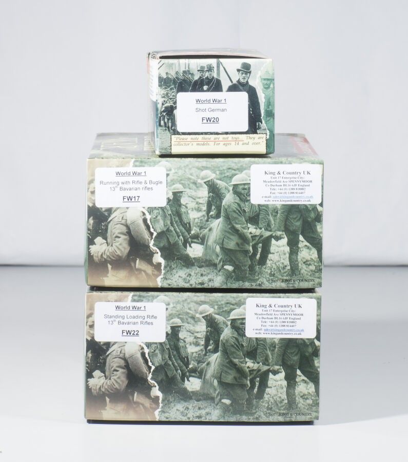 King & Country. First World War. German Infantry /2. 3 Bavarian Soldiers including Bugler and wounded. References sold out. Ref FW017, FW020 and FW022. 3 new boxes.