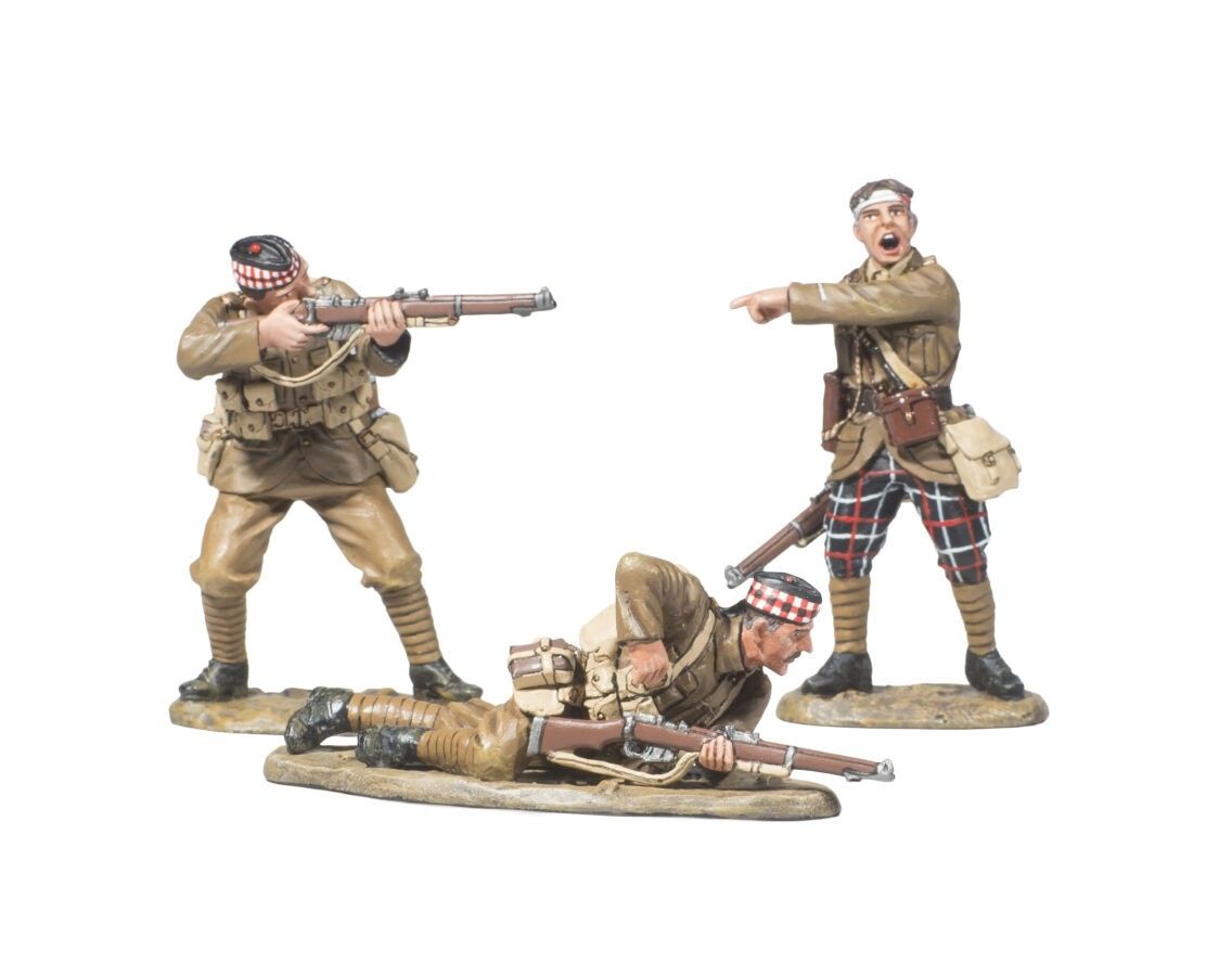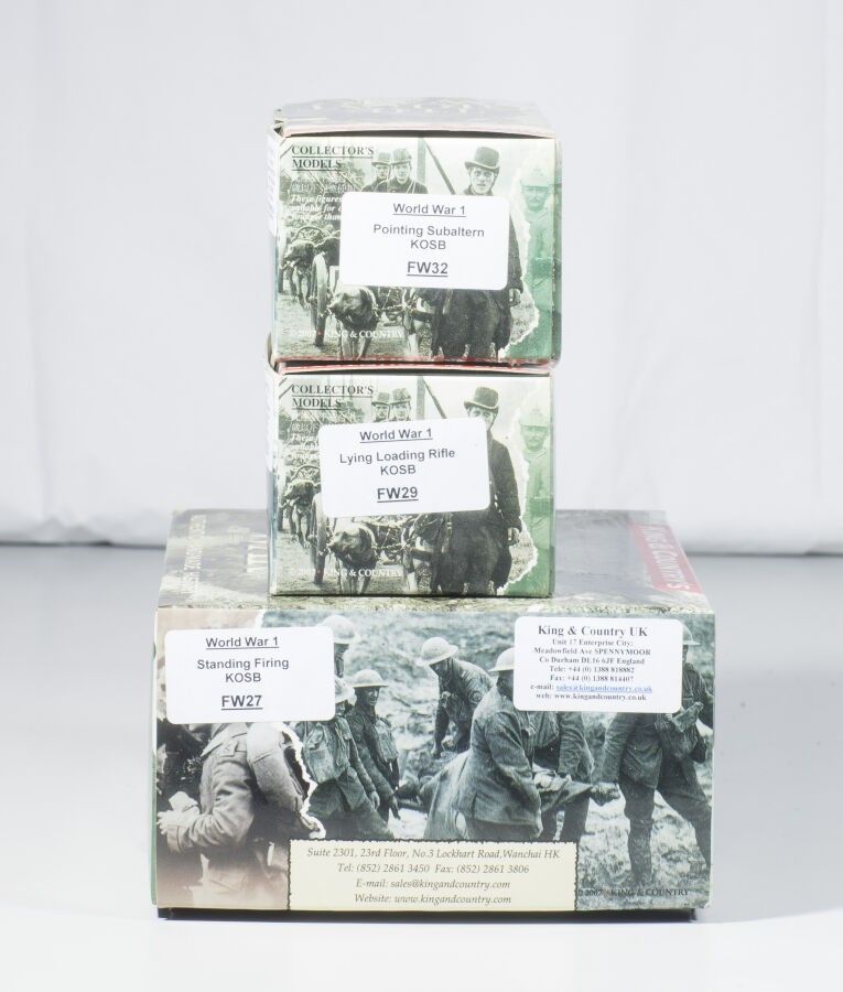 King & Country. First World War. Scottish Infantry /2. NCO and 2 Soldiers at the Front. References sold out. Ref FW027, FW029 and FW032. 3 new boxes.
