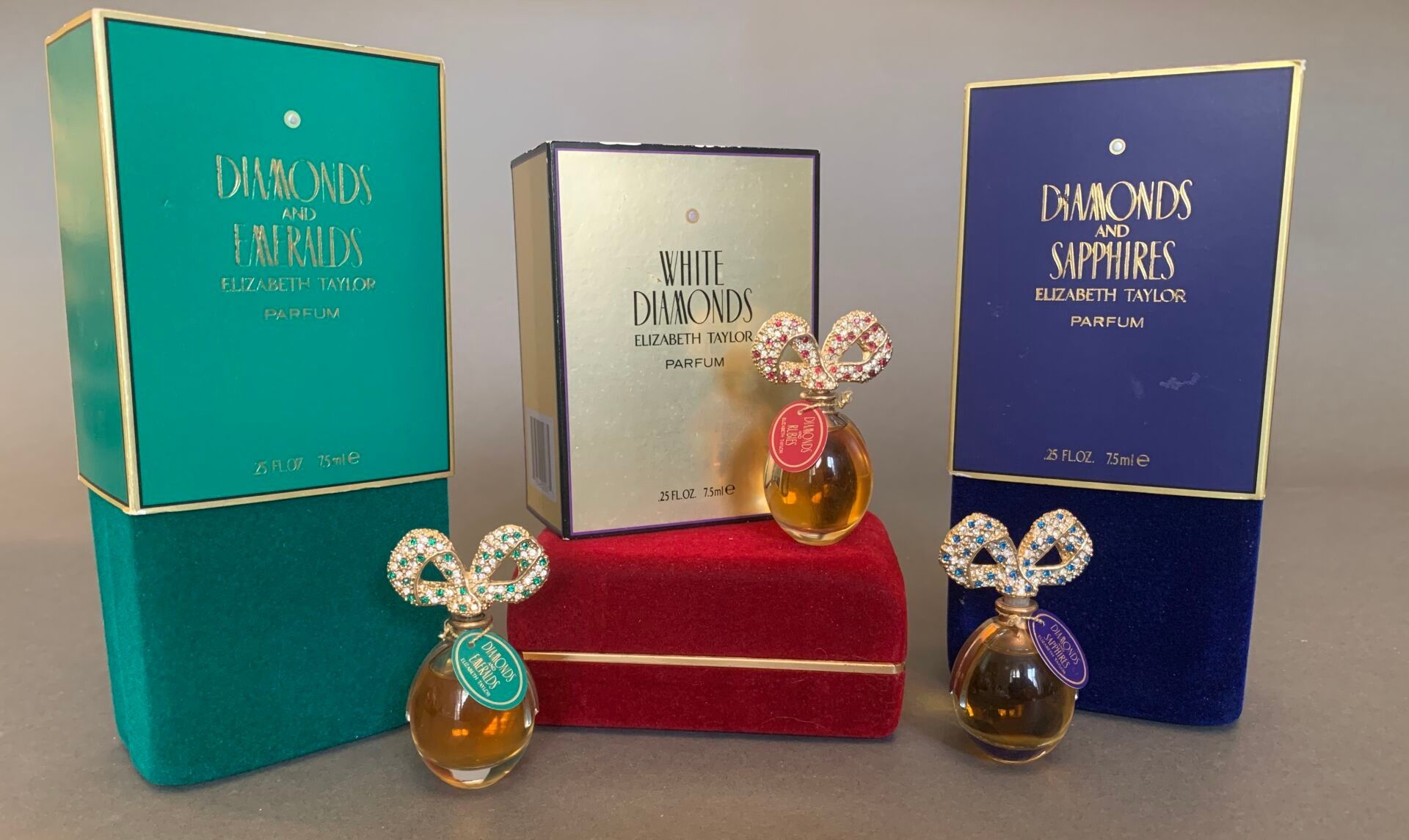 Presented in a velvet-covered jewellery box protected by a titled gold cardboard sleeve, three jewelled bottles, each featuring an Egg in imitation of the Fabergé eggs, topped with a gold zamac stopper set with coloured imitation precious stone crystals, each containing 7.5ml of extract. "Diamonds & Rubis", "Diamonds and Sapphires", and "Diamonds and Emeralds" perfumes.