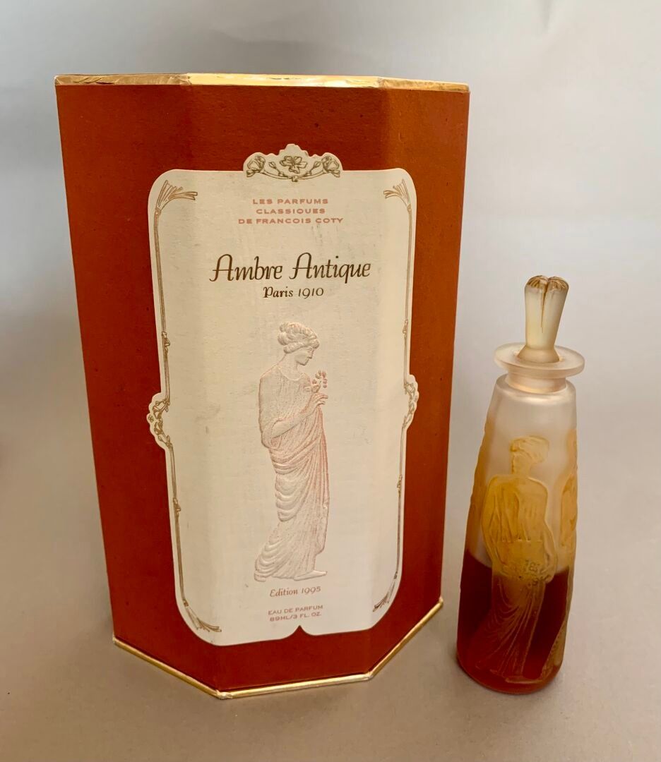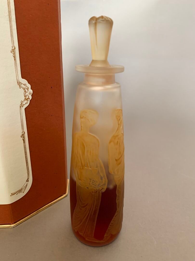 Reissue dating from 1995, limited to 3500 copies of the famous bottle created in 1910 by René Lalique (1860-1945) in colourless pressed glass with satin frosting, cylindrical in cross-section, its body with moulded sepia patina decoration of four draped vestals, neck with protruding carnette, topped with a sepia-toned "pistil" stopper, presented in a luxurious cardboard box sheathed in gold and buff paper, with embossed decoration of a draped vestal, and a triptych in mirror paper, containing 89ml of eau de parfum (opened - stopper blocked), numbered 3239/3500.