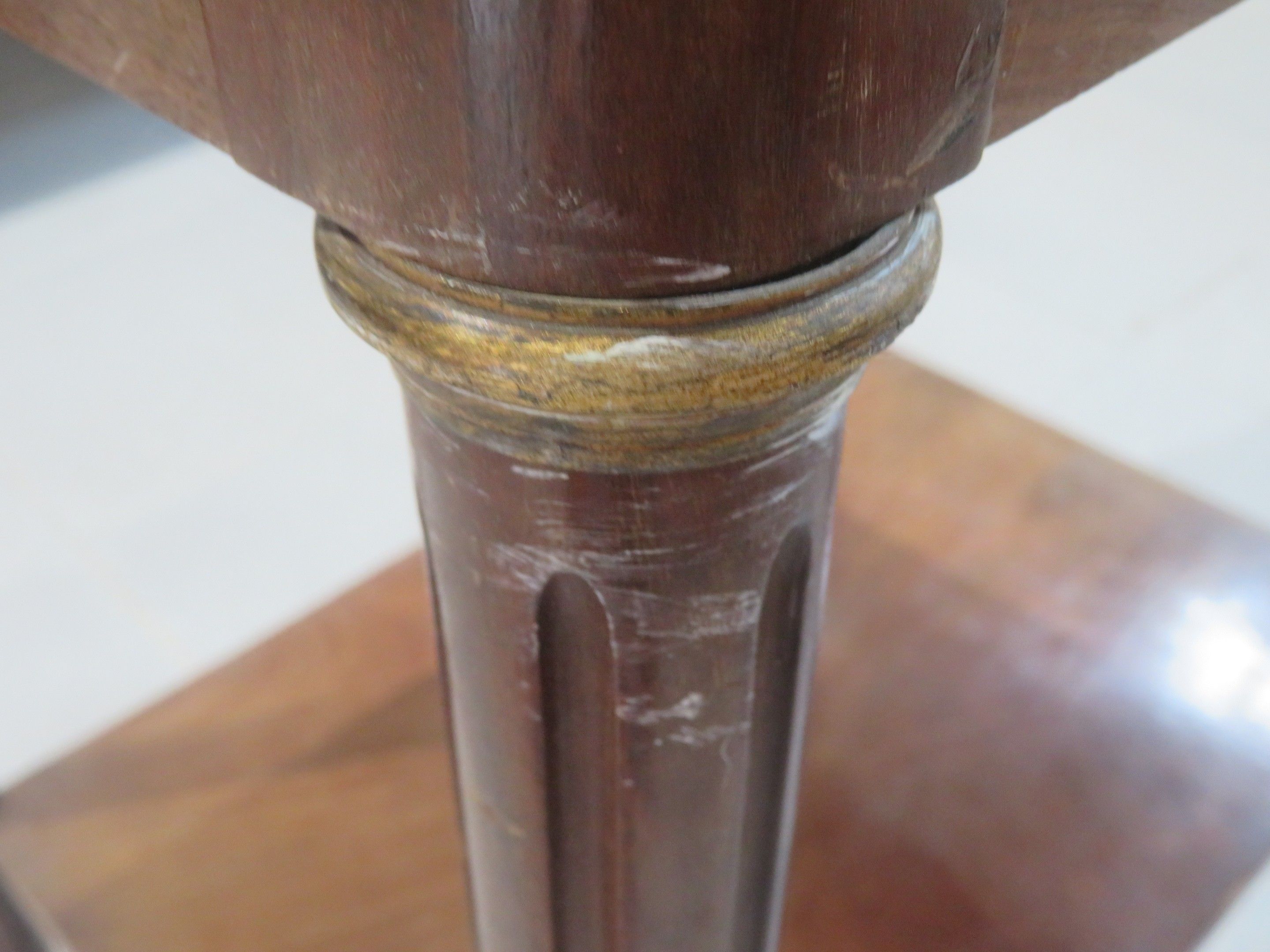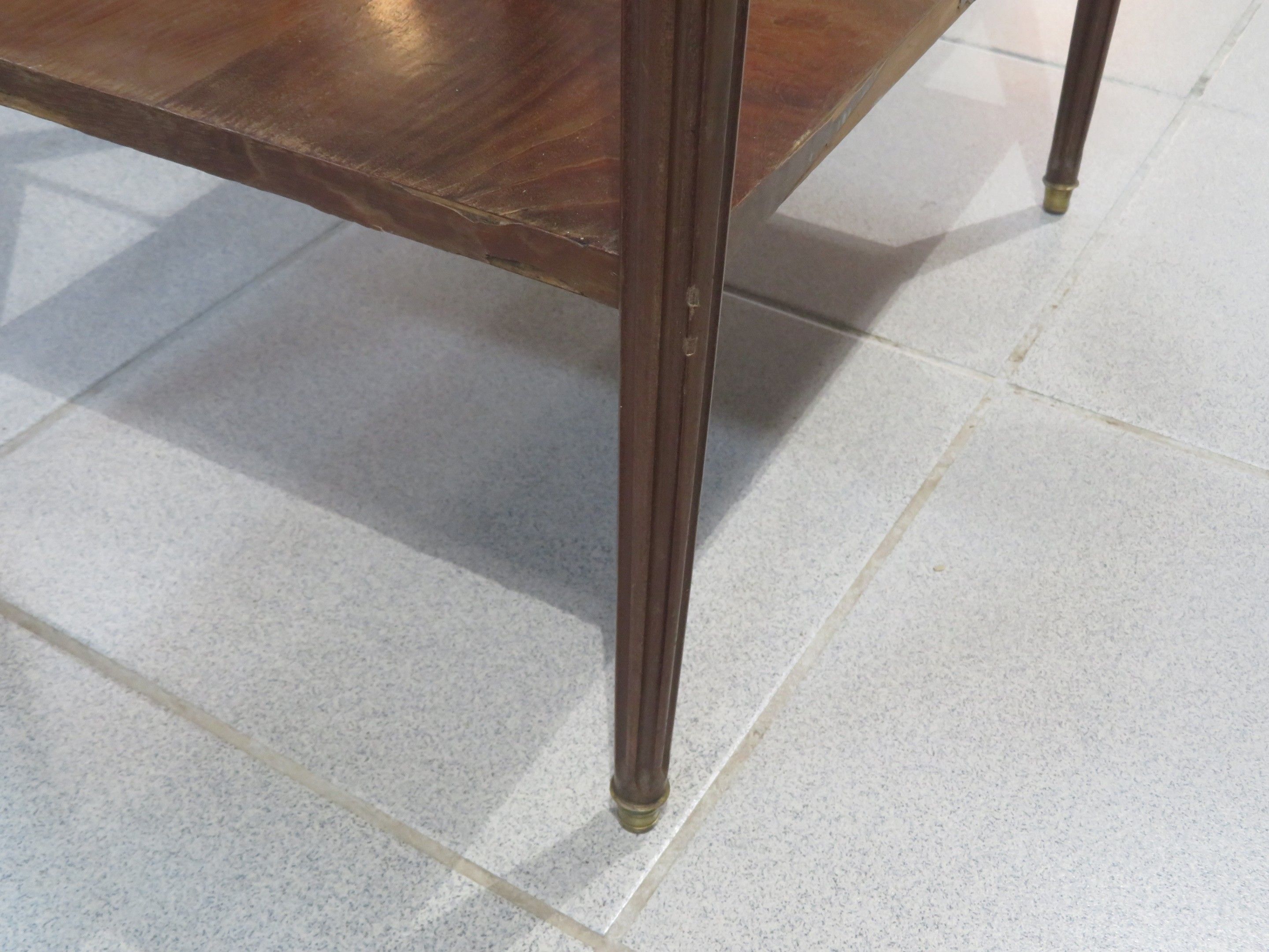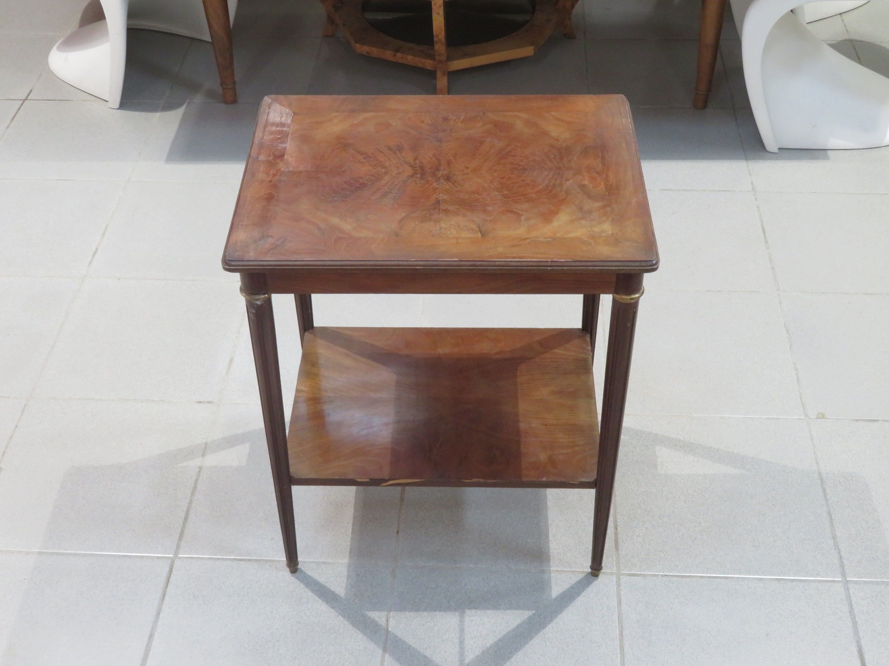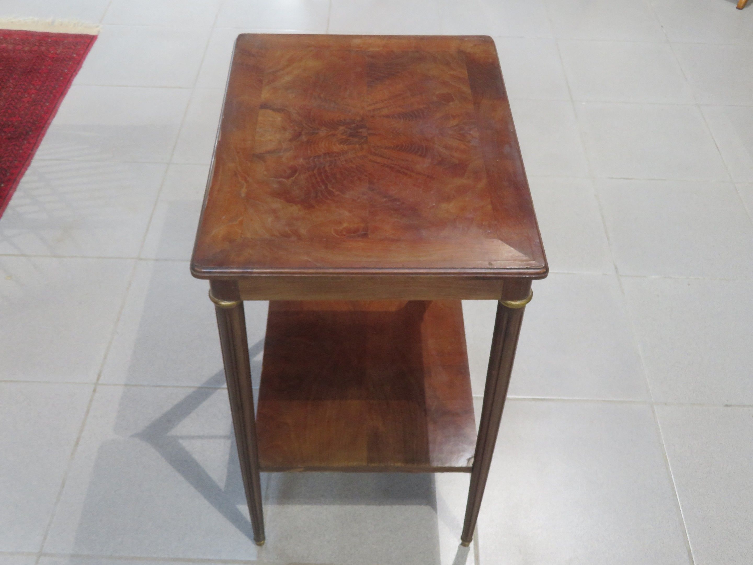 Walnut veneered coffee table, the top inlaid with butterfly wings, resting on four fluted legs linked by a brace top. Louis XVI style. Dimensions 74 x 61 x 46 cm (missing veneer, cracks, insolation)