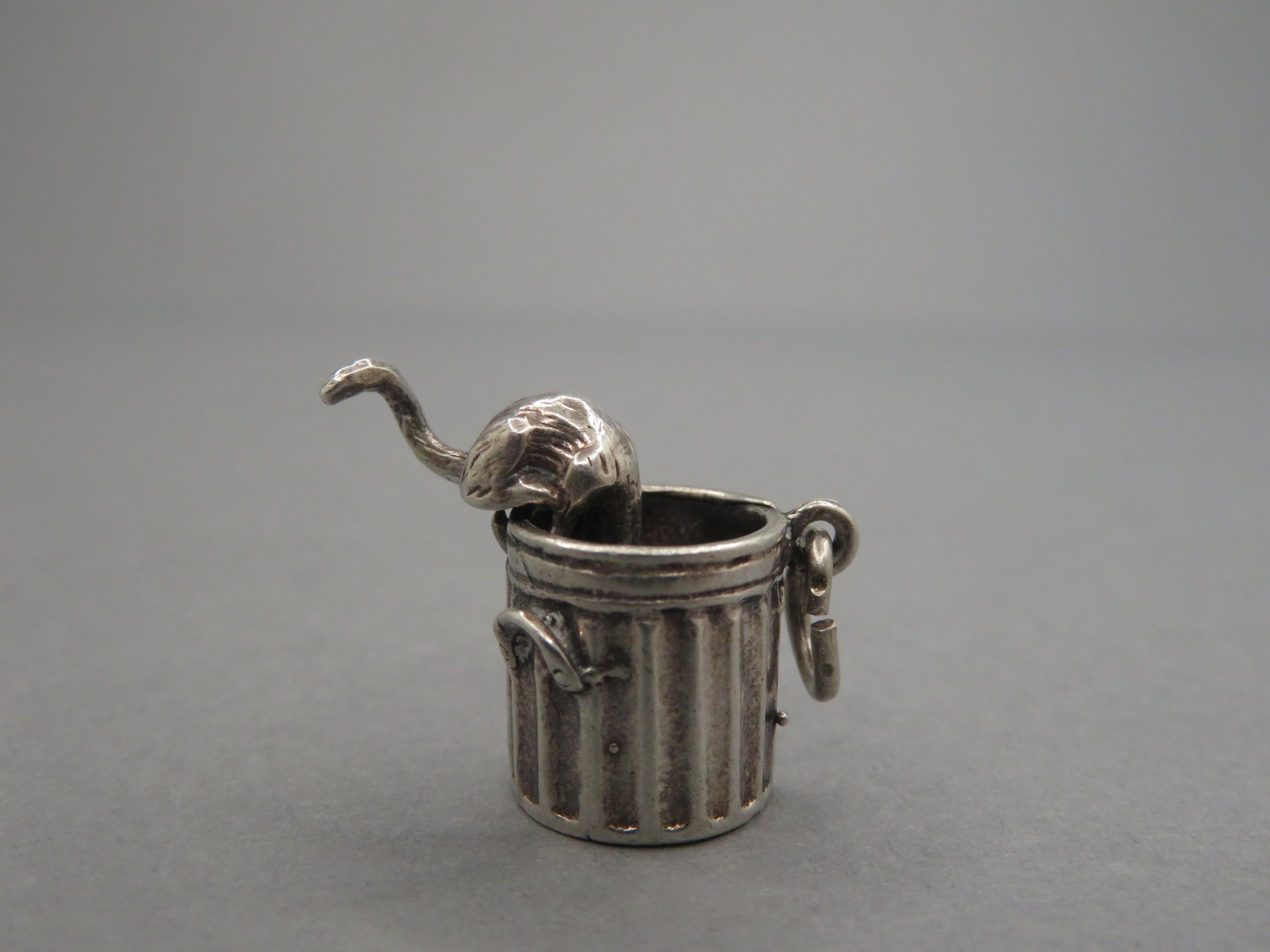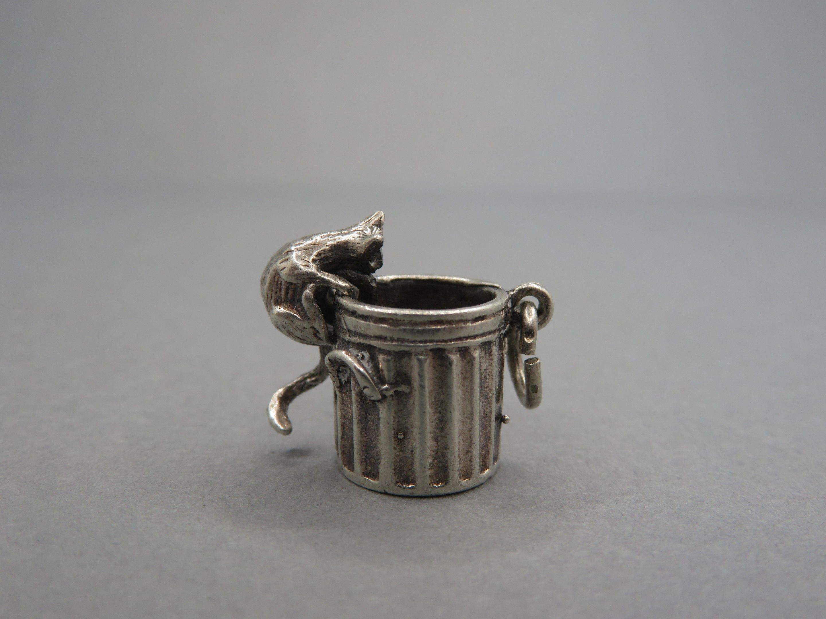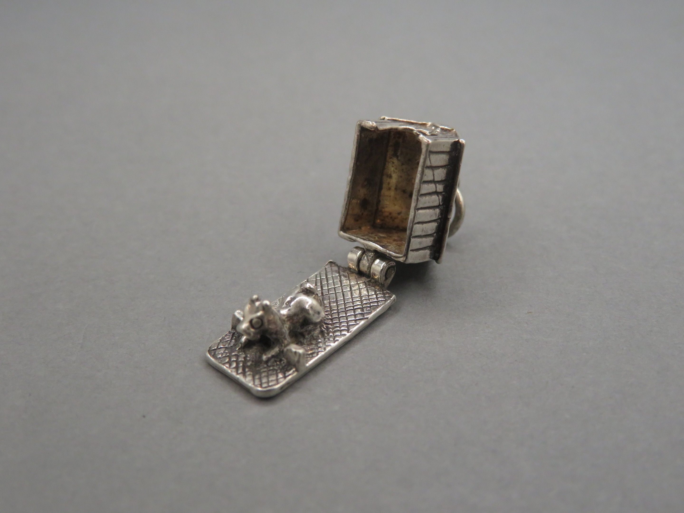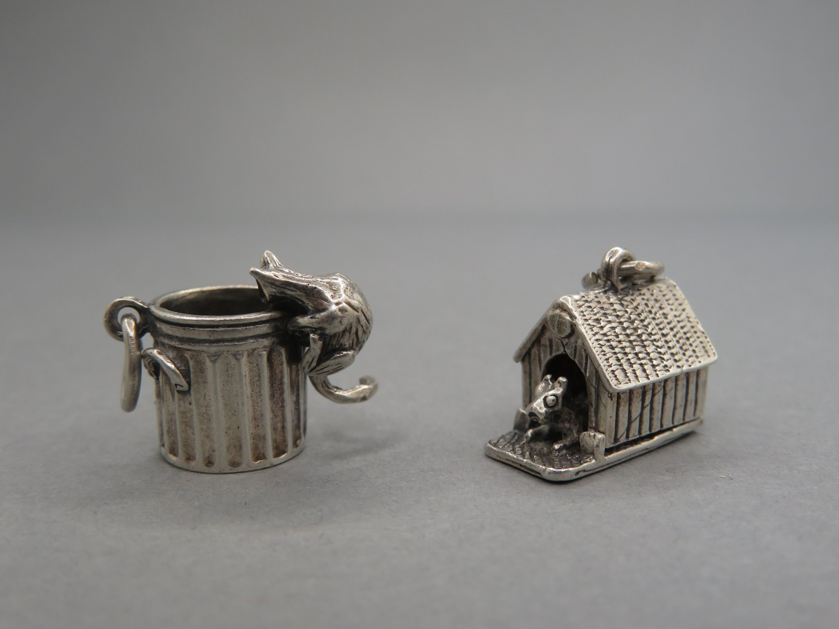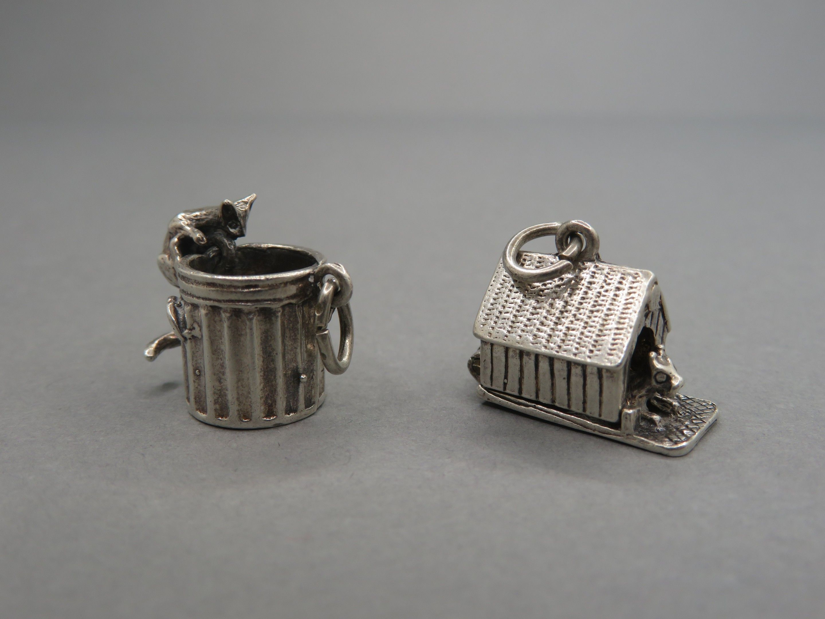 Charming articulated charms or pendants in silver 800/1000, featuring a cat in a dustbin and a dog in its kennel. Both have a system allowing the cat to go into the bin and the dog's kennel to be uncovered. Height 1.2 cm, length 2.8 cm. Weight: 8.30 g
