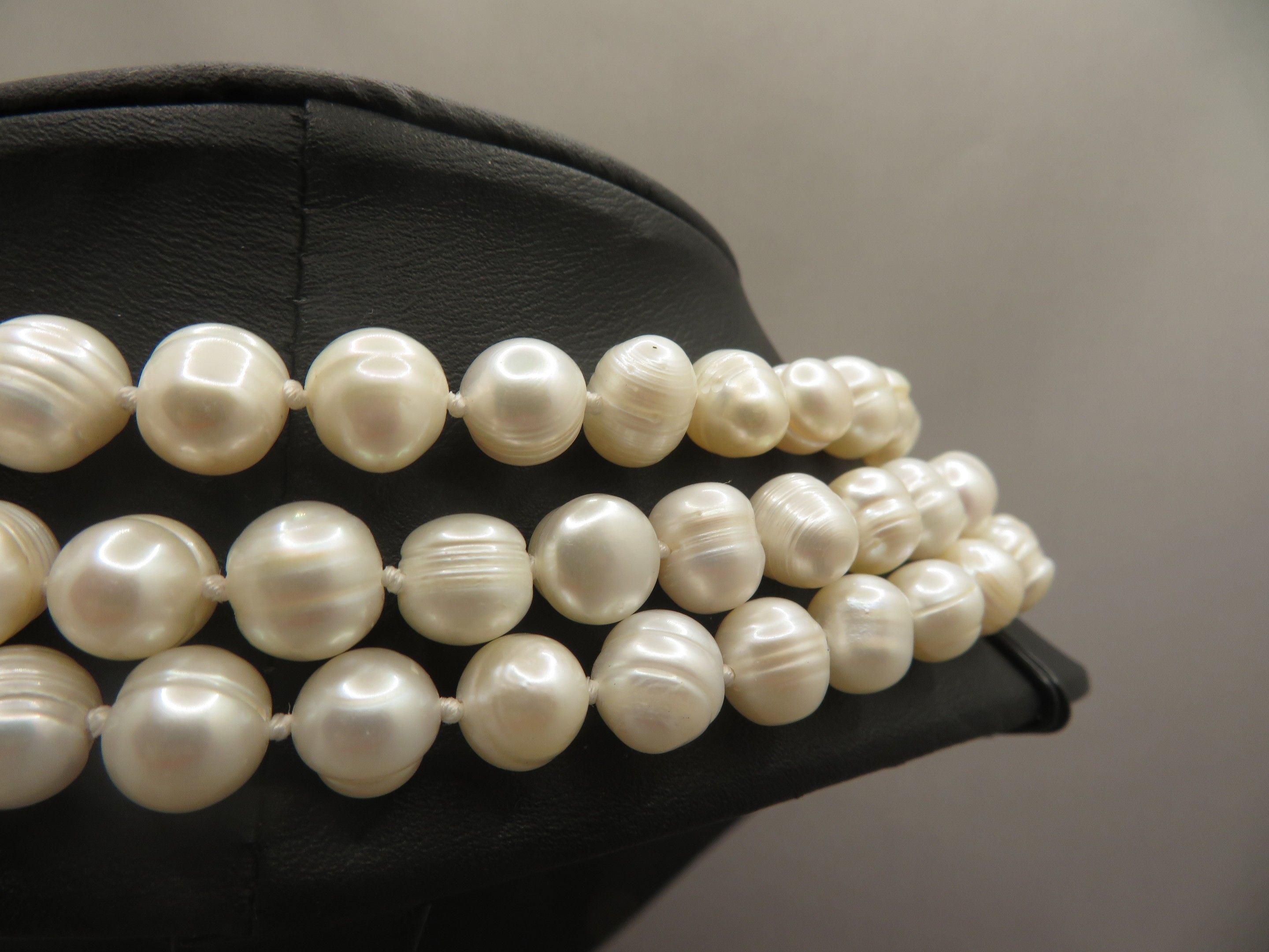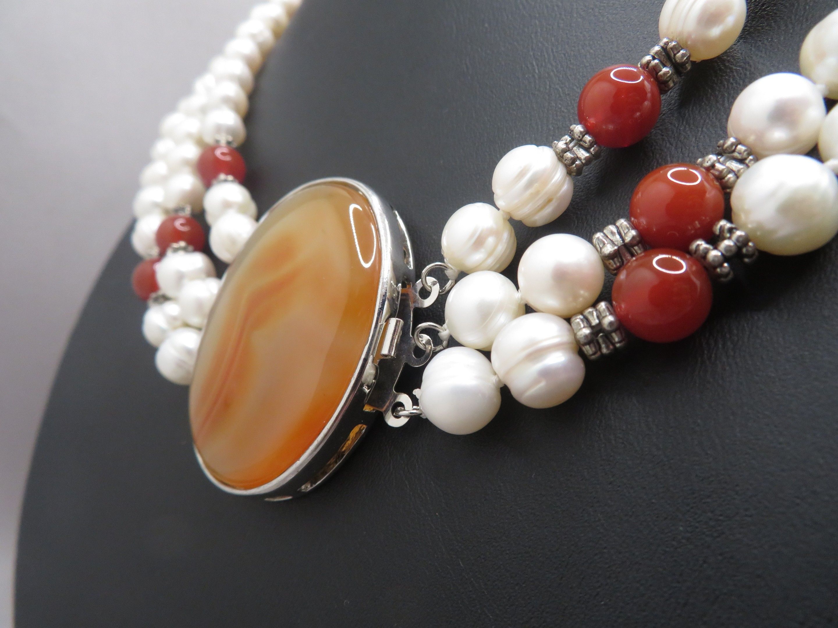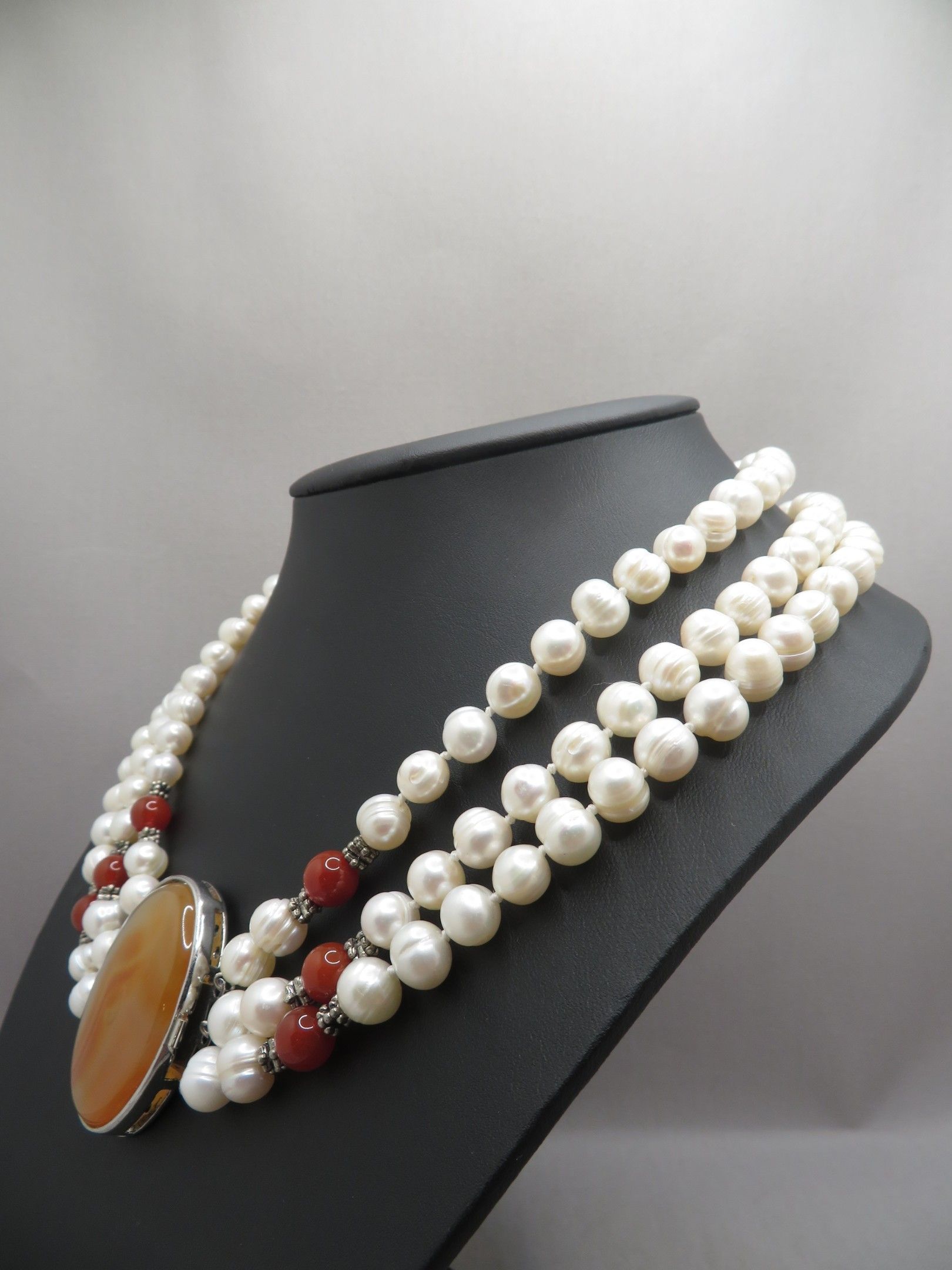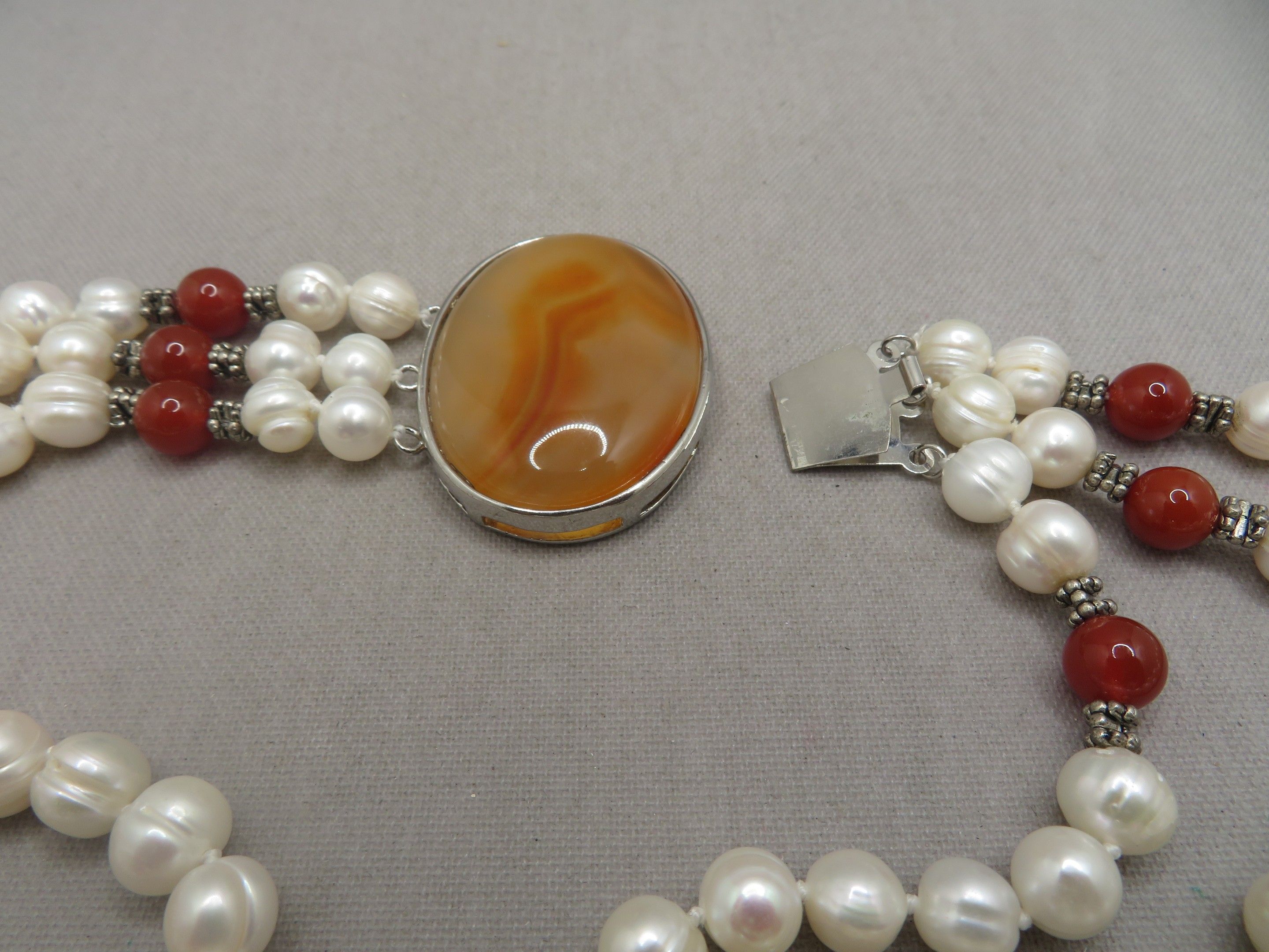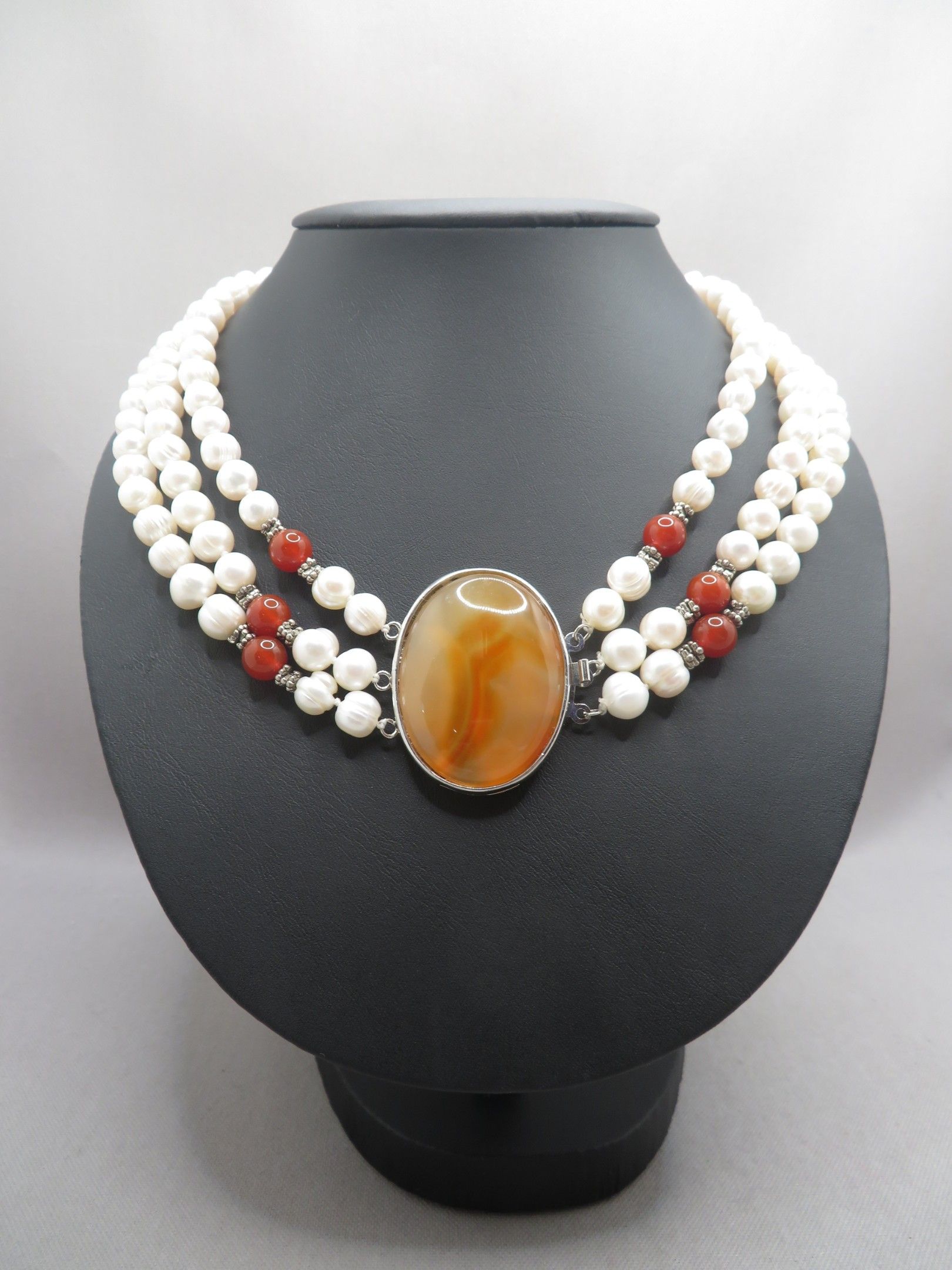 Necklace with three strands of freshwater pearls, agate cabochon clasp. Length of neck 46 cm. As new
