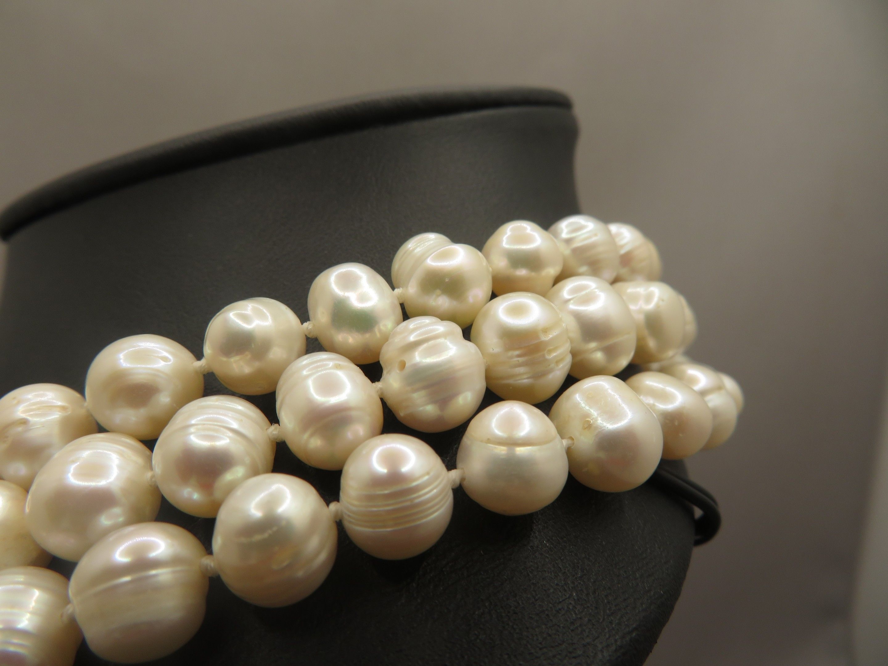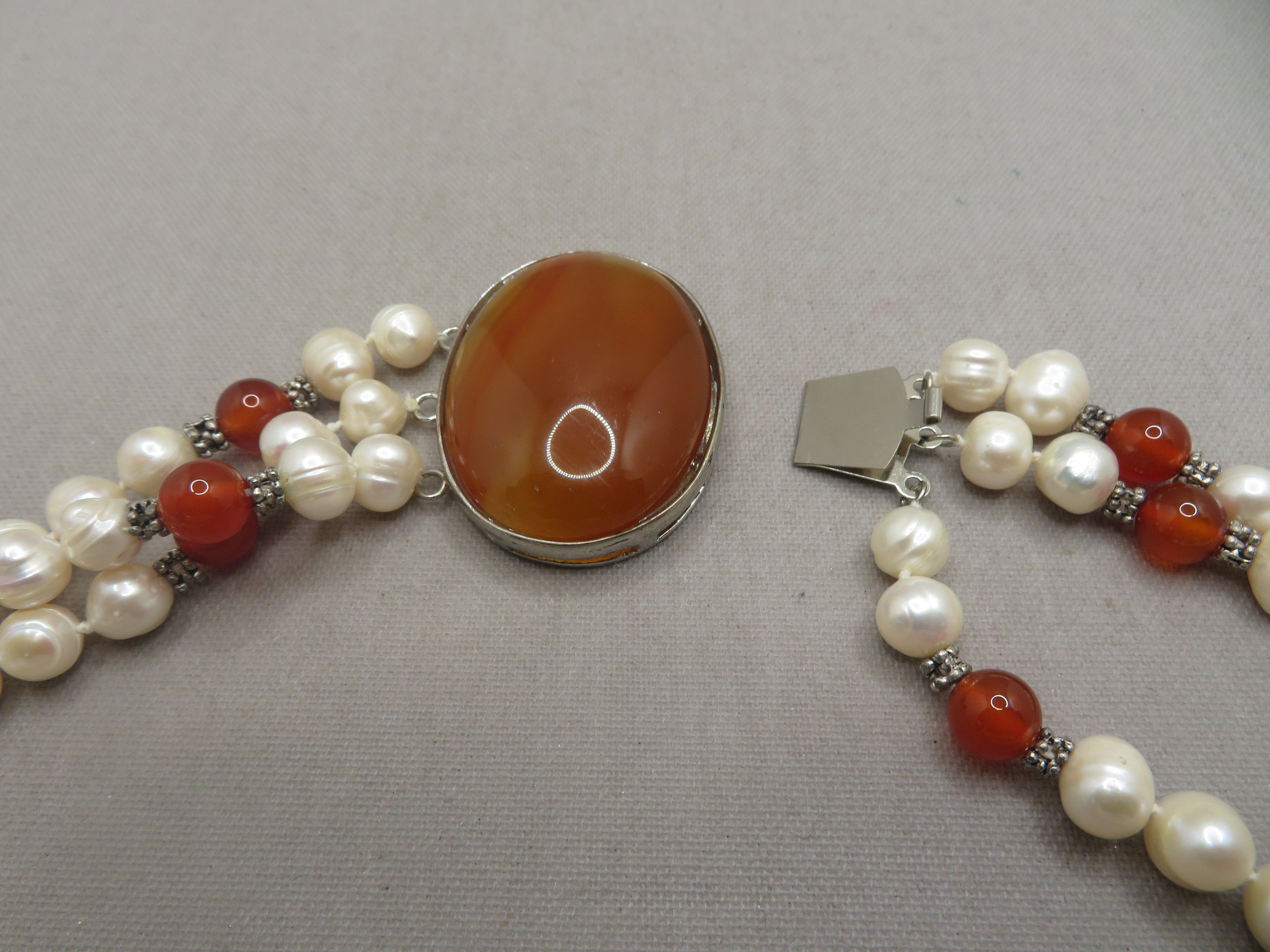 Necklace with three strands of freshwater pearls, agate cabochon clasp. Length 46 cm. As new