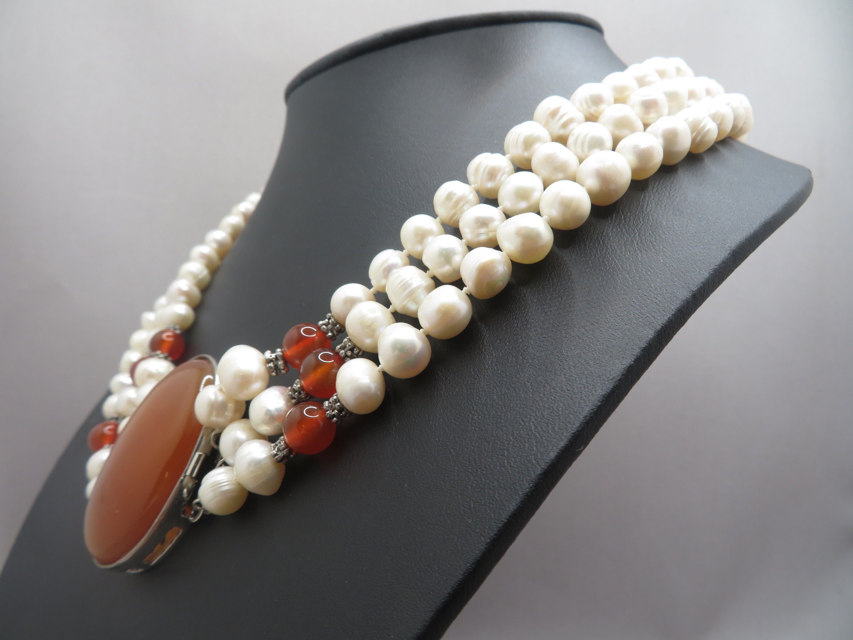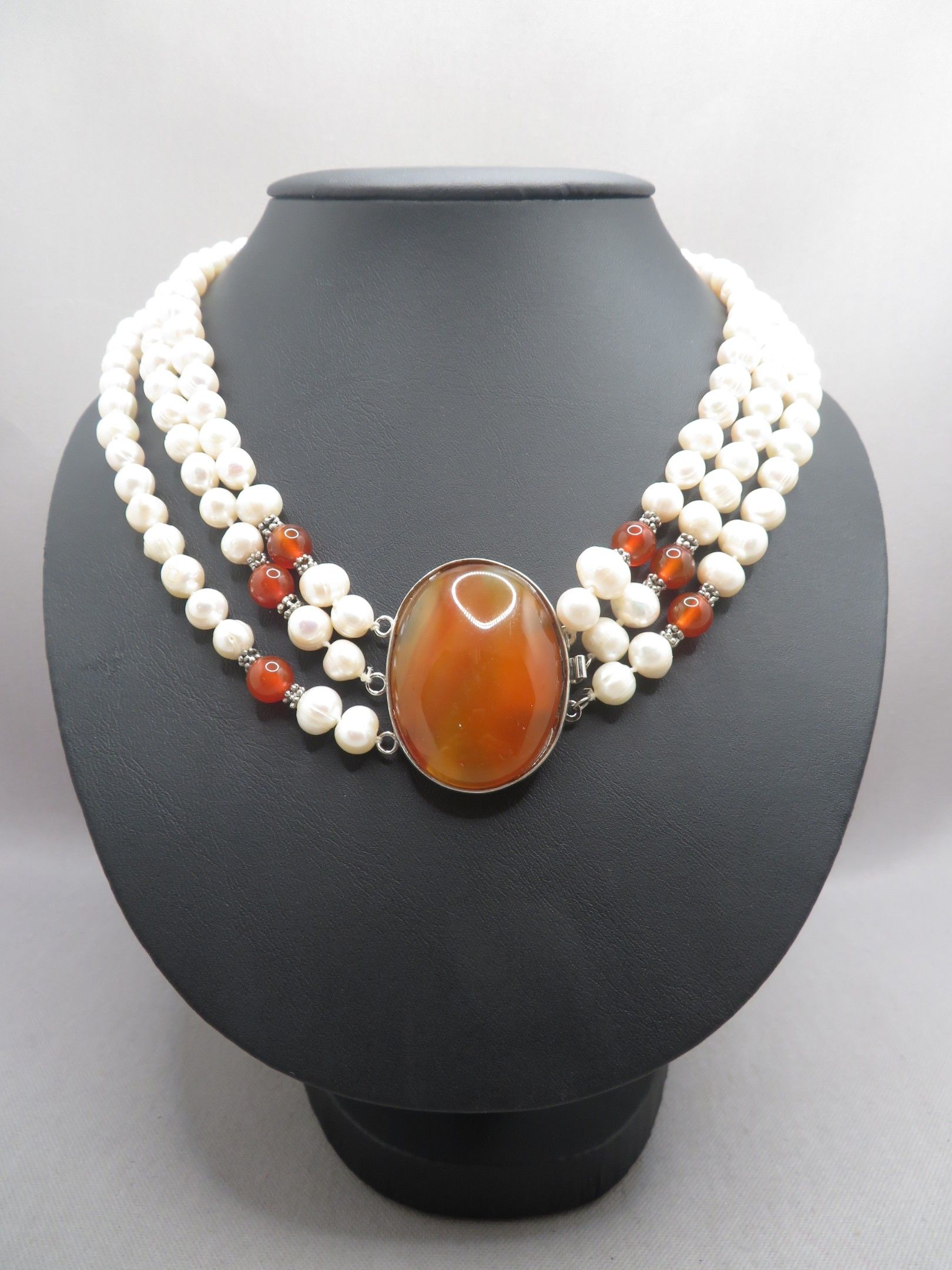 Necklace with three strands of freshwater pearls, agate cabo…