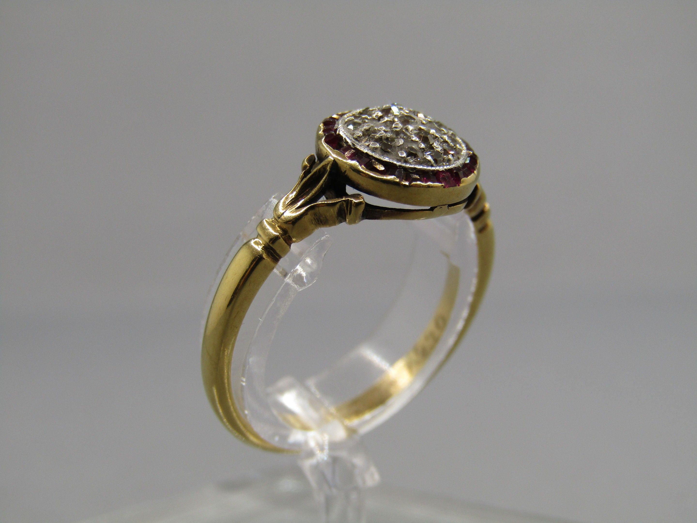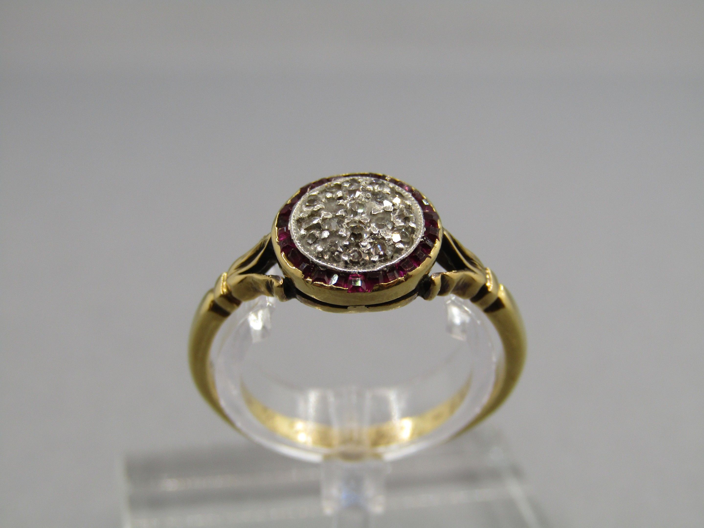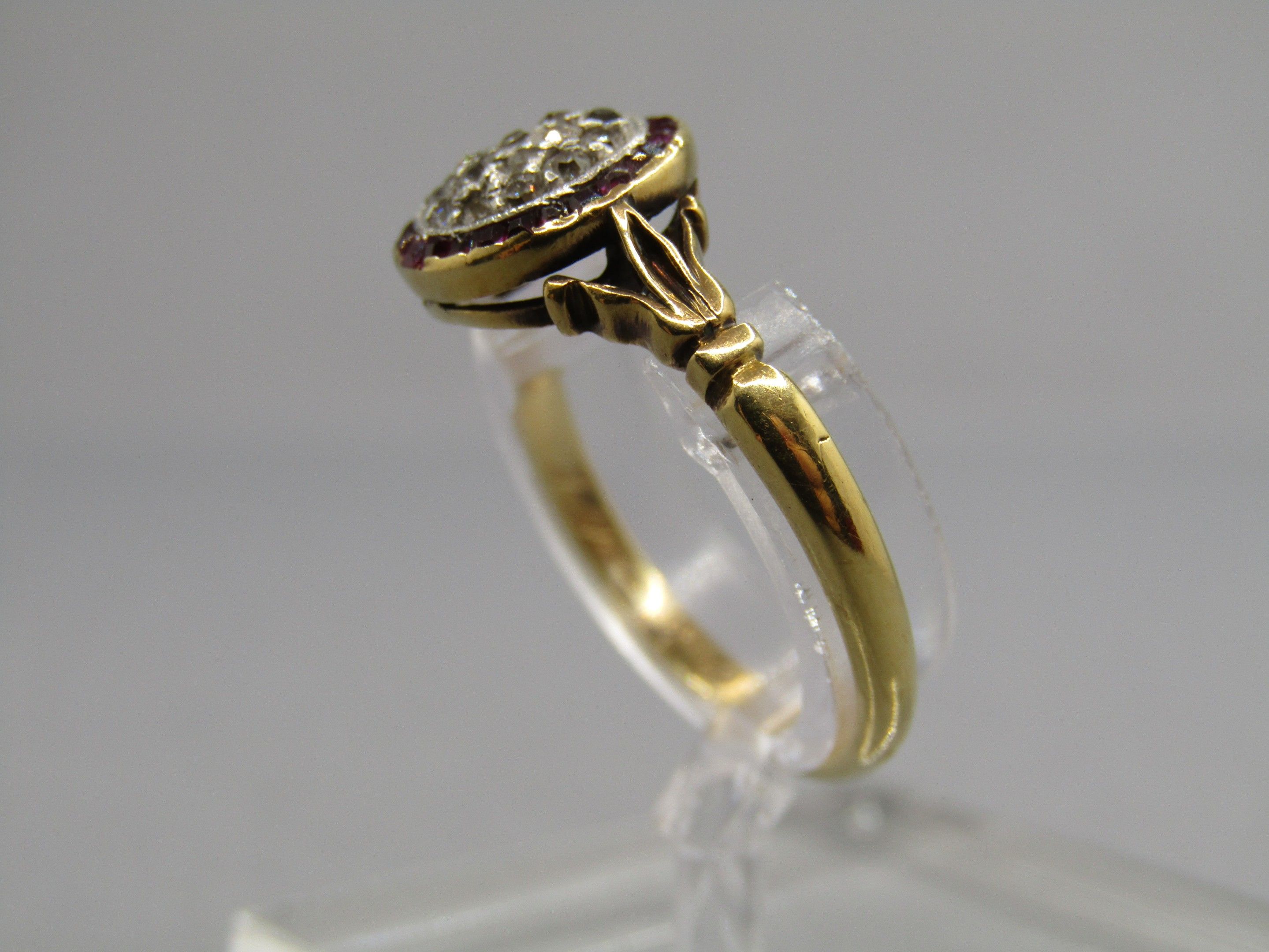 Ring in 18K gold 750/1000, Hibou hallmark and platinum Mascaron hallmark, set with diamonds and small rubies. TDD 55, Gross weight 3.06g
