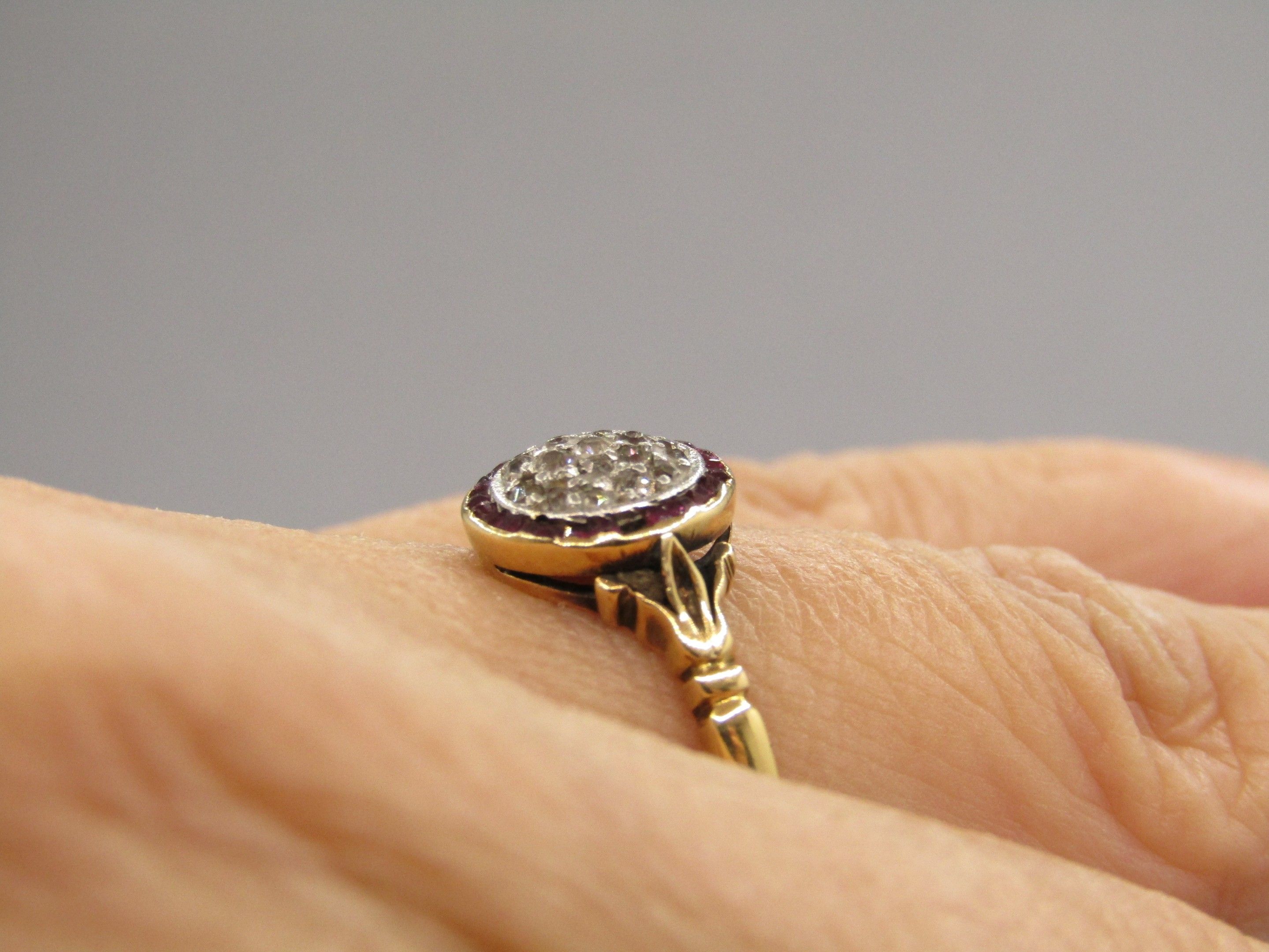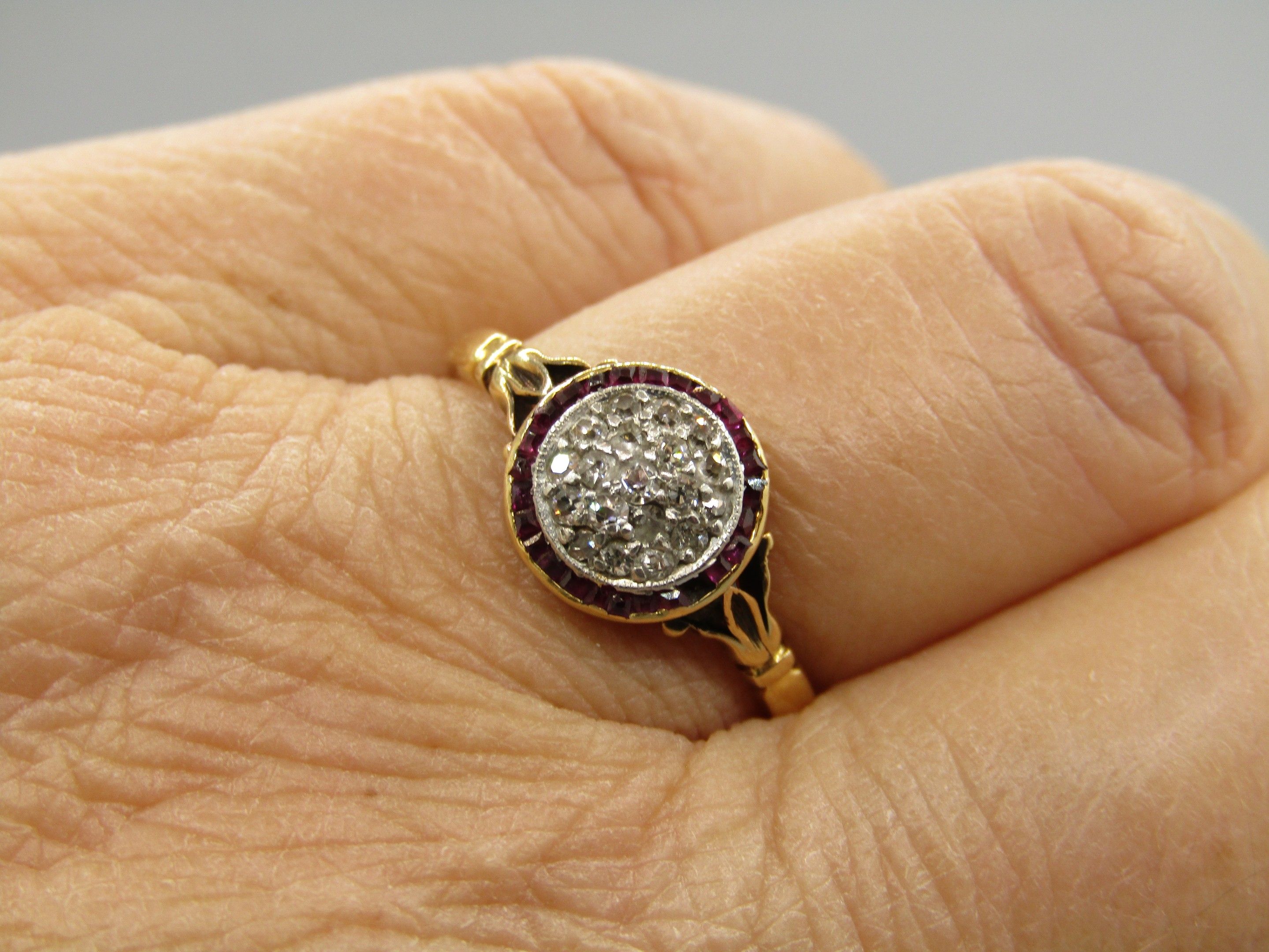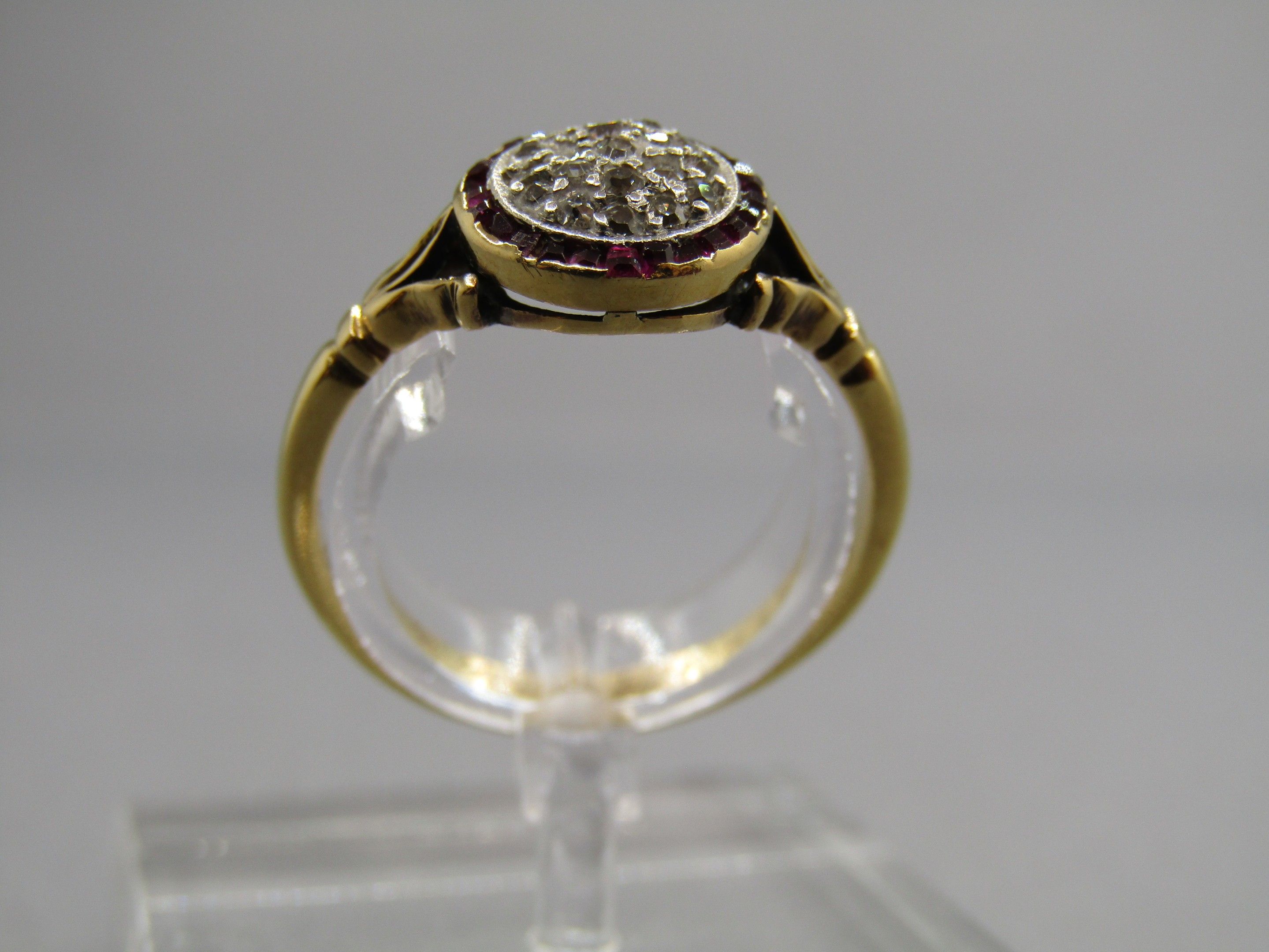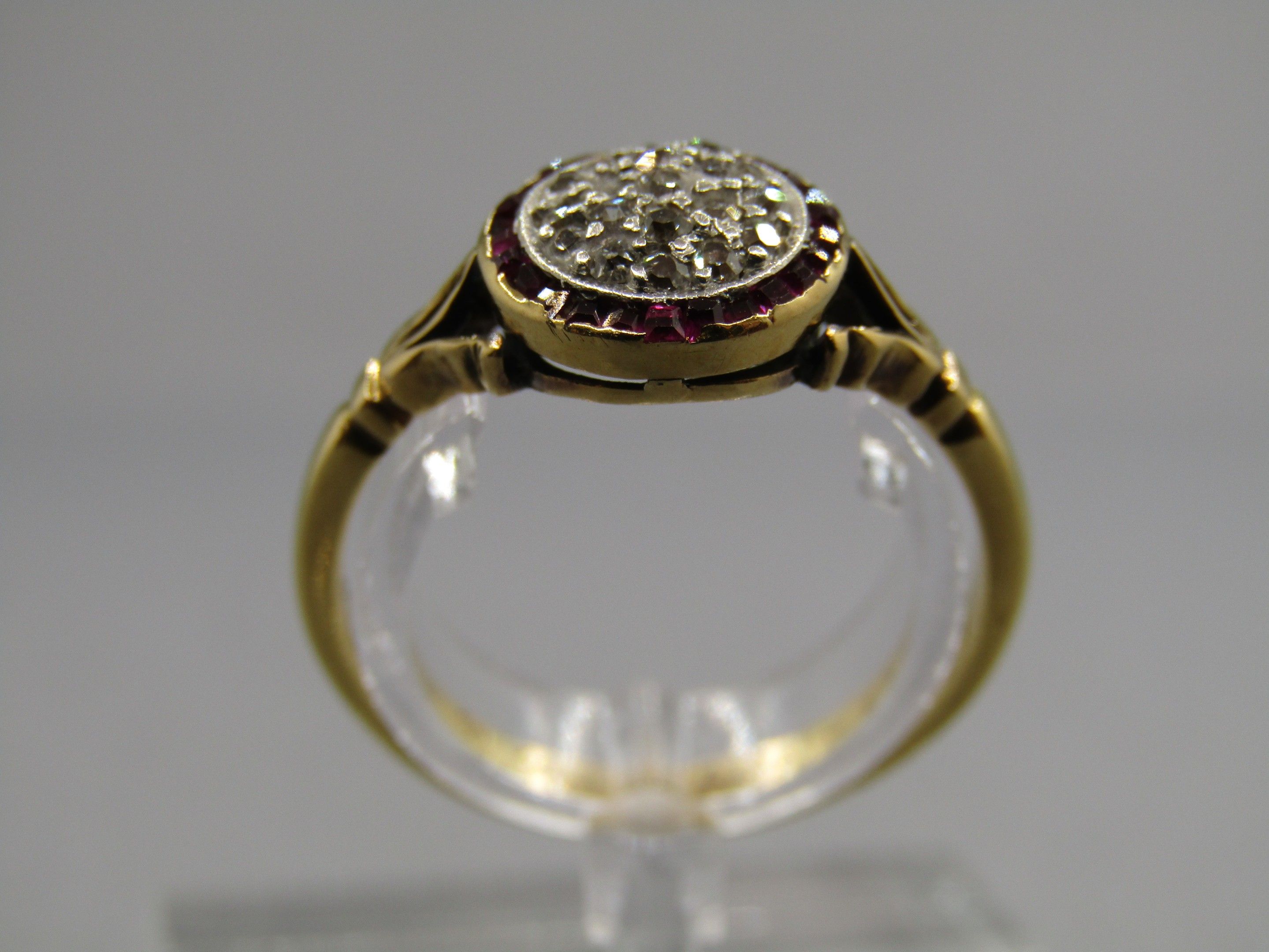 Ring in 18K gold 750/1000, Hibou hallmark and platinum Mascaron hallmark, set with diamonds and small rubies. TDD 55, Gross weight 3.06g