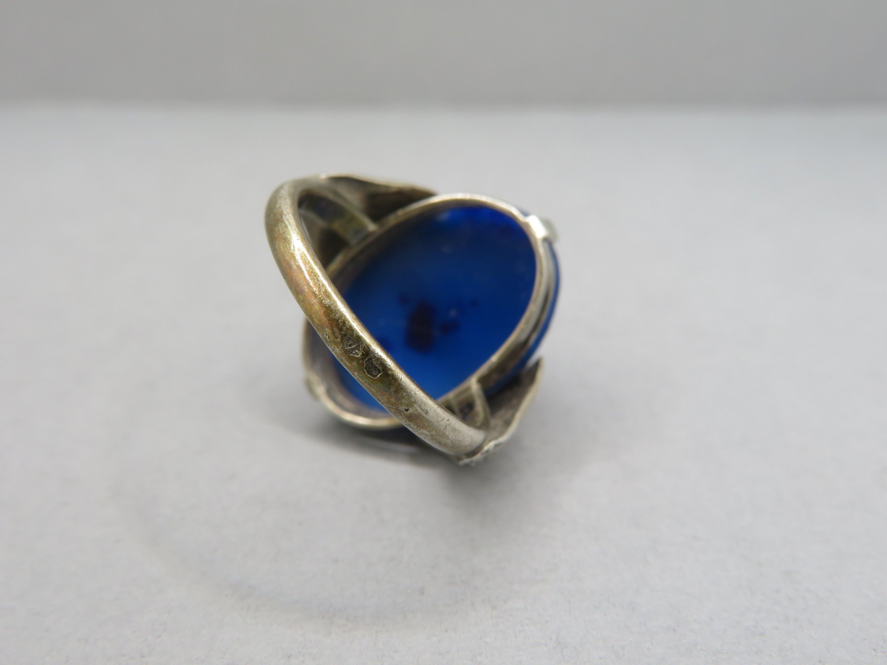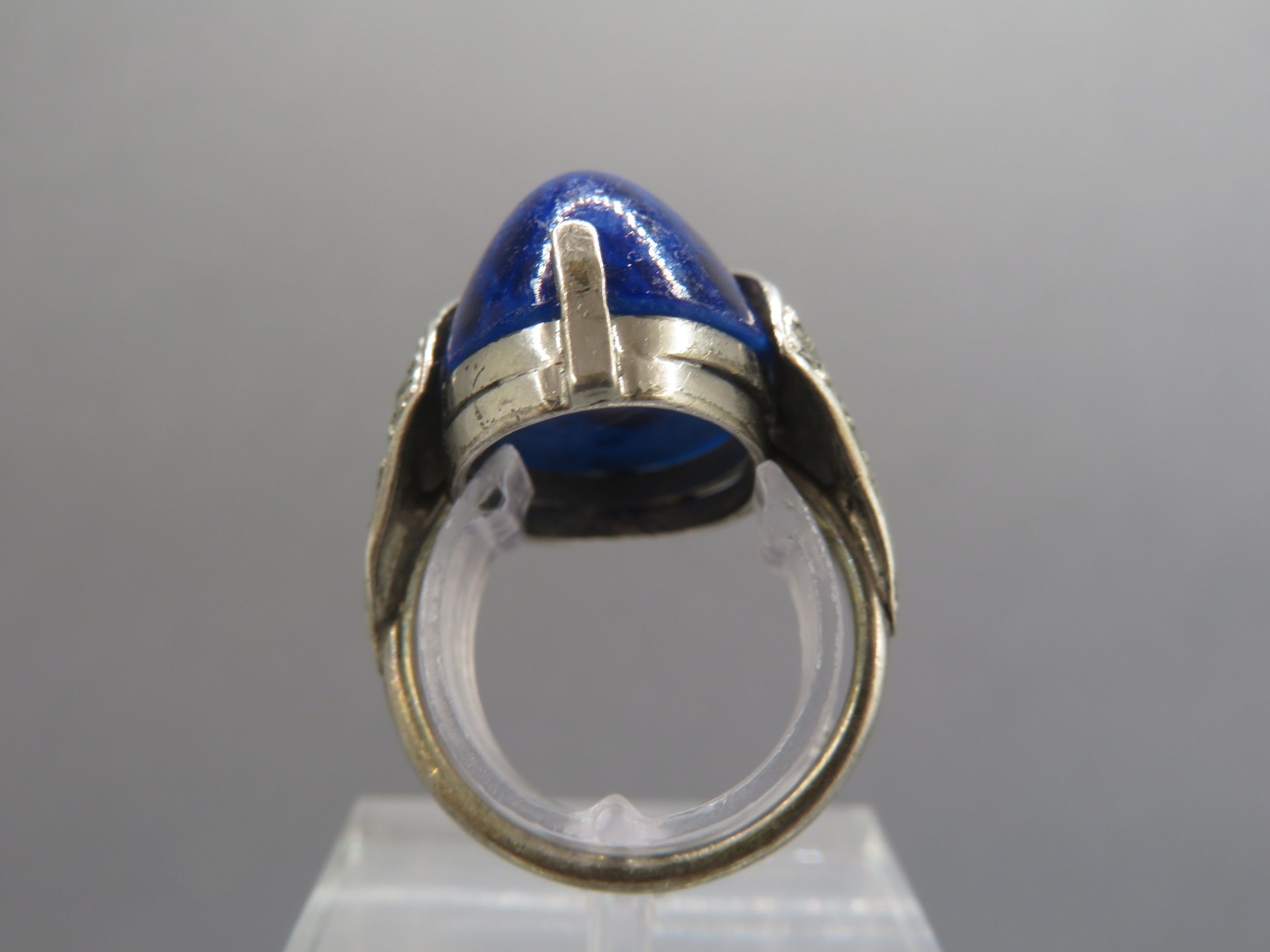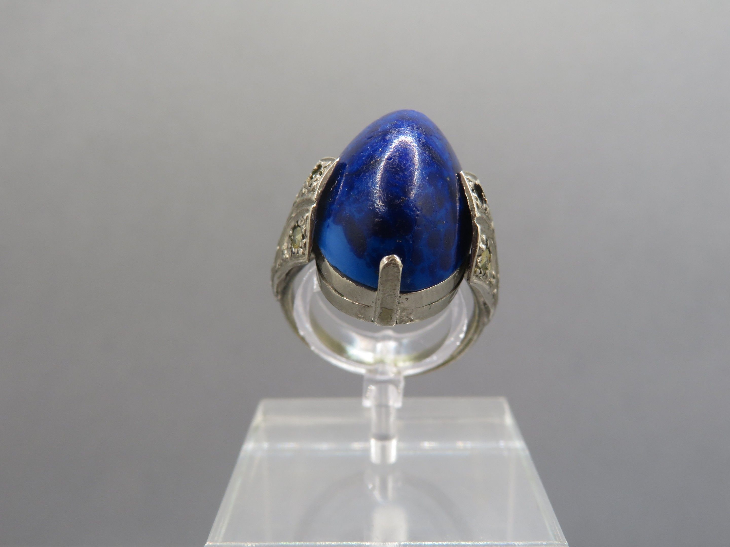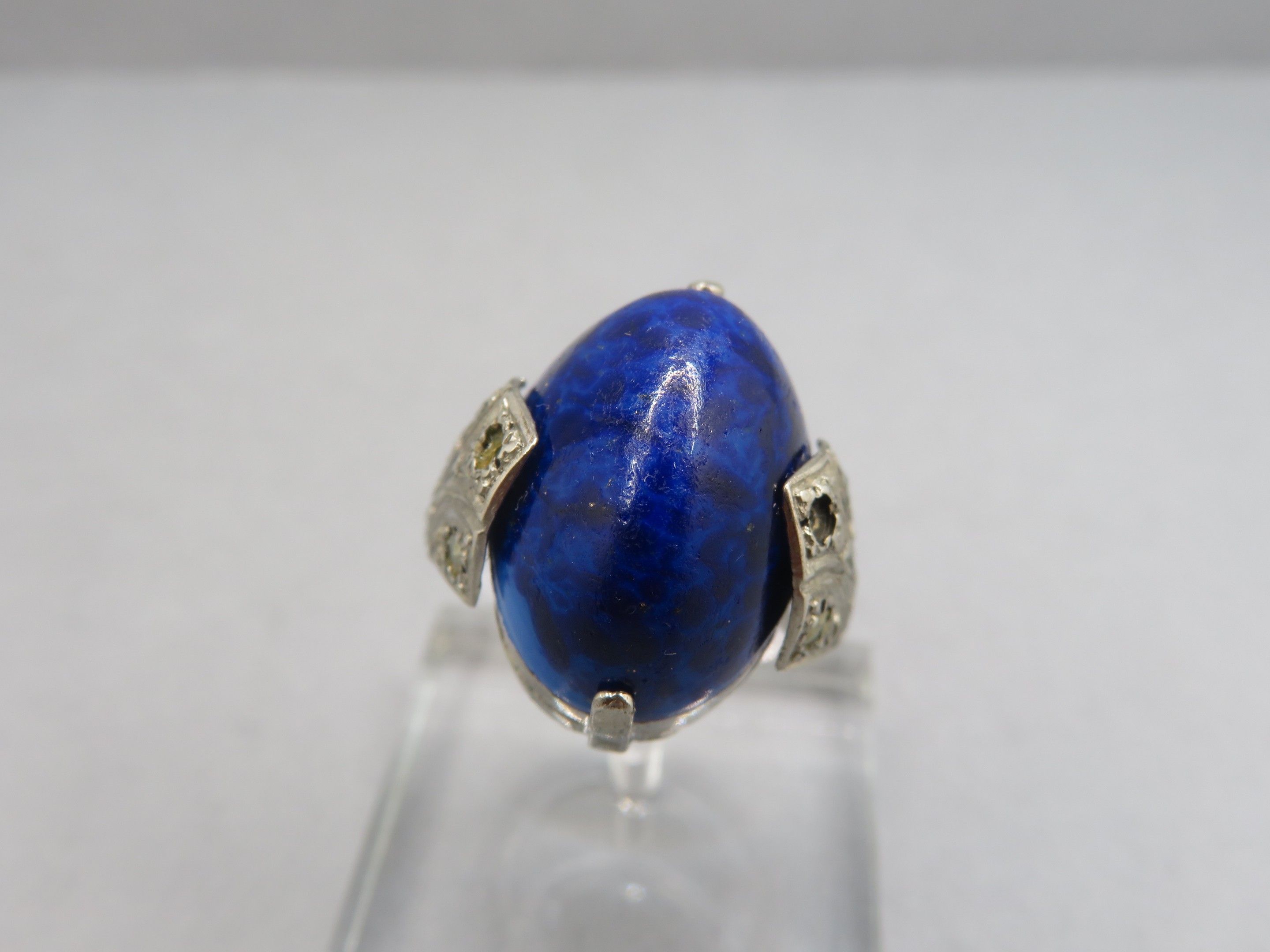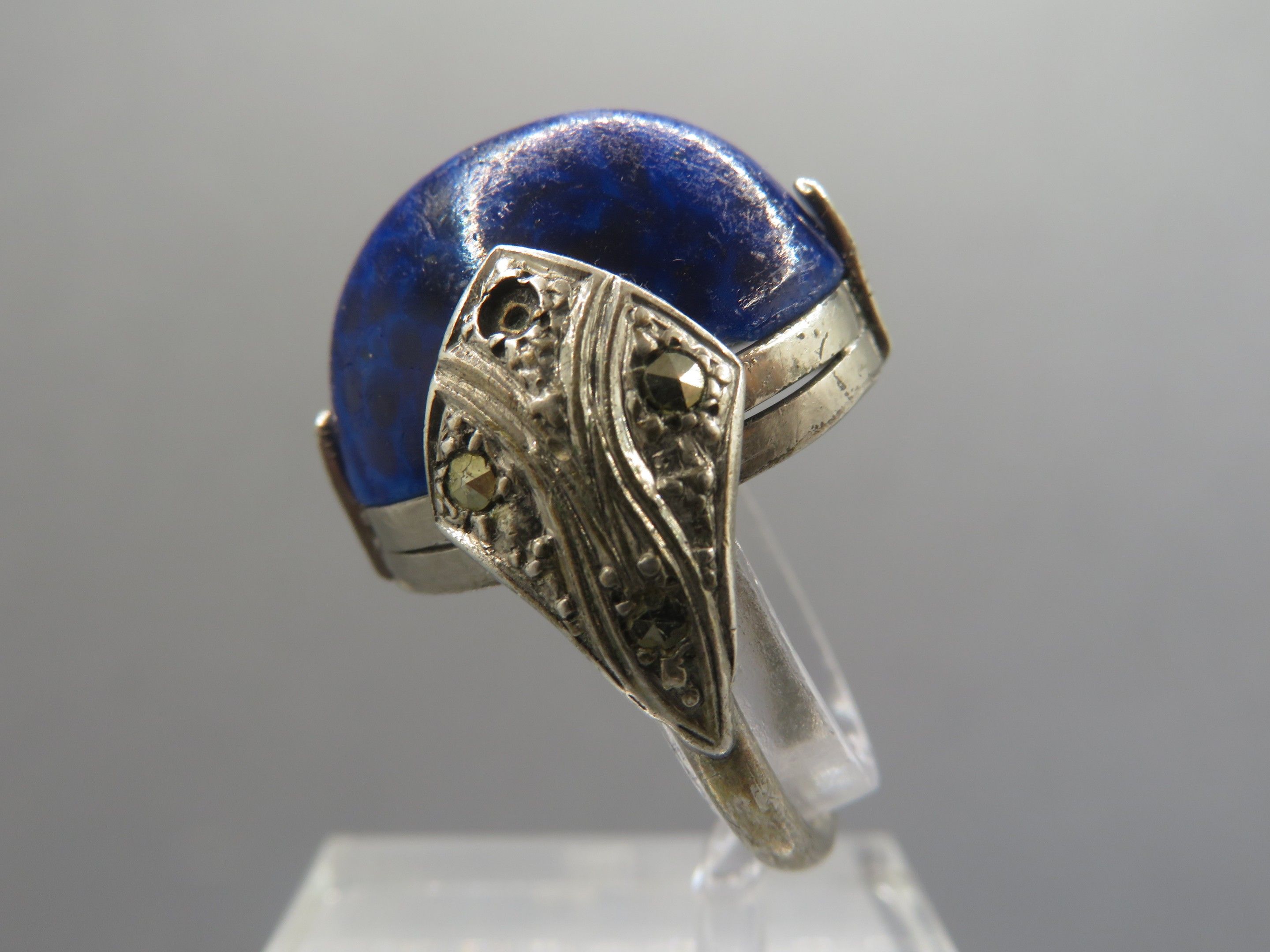 Silver ring 800/1000, boar hallmark, set with Lapis Lazuli coloured glassware (tinted) and marcasites. Gross weight 9.50g TDD 48 (2 marcasites missing)