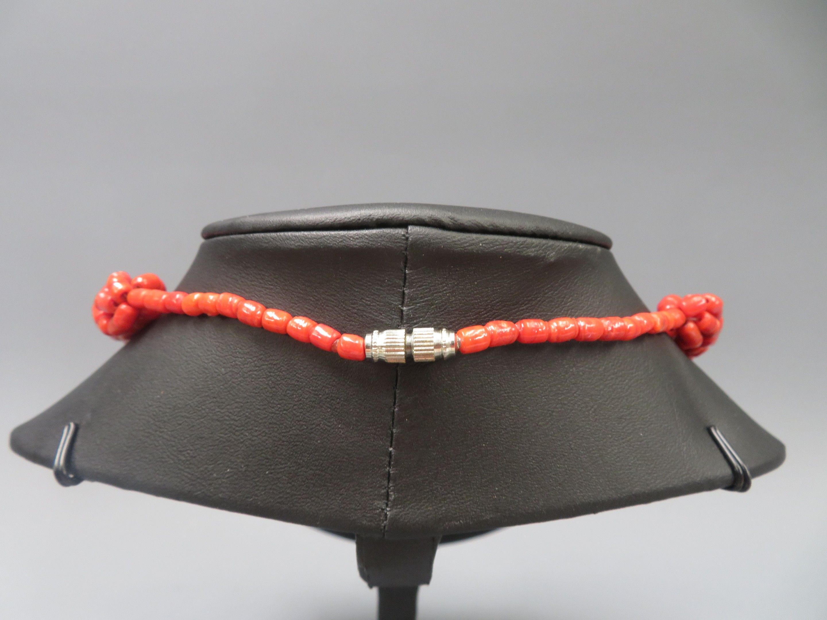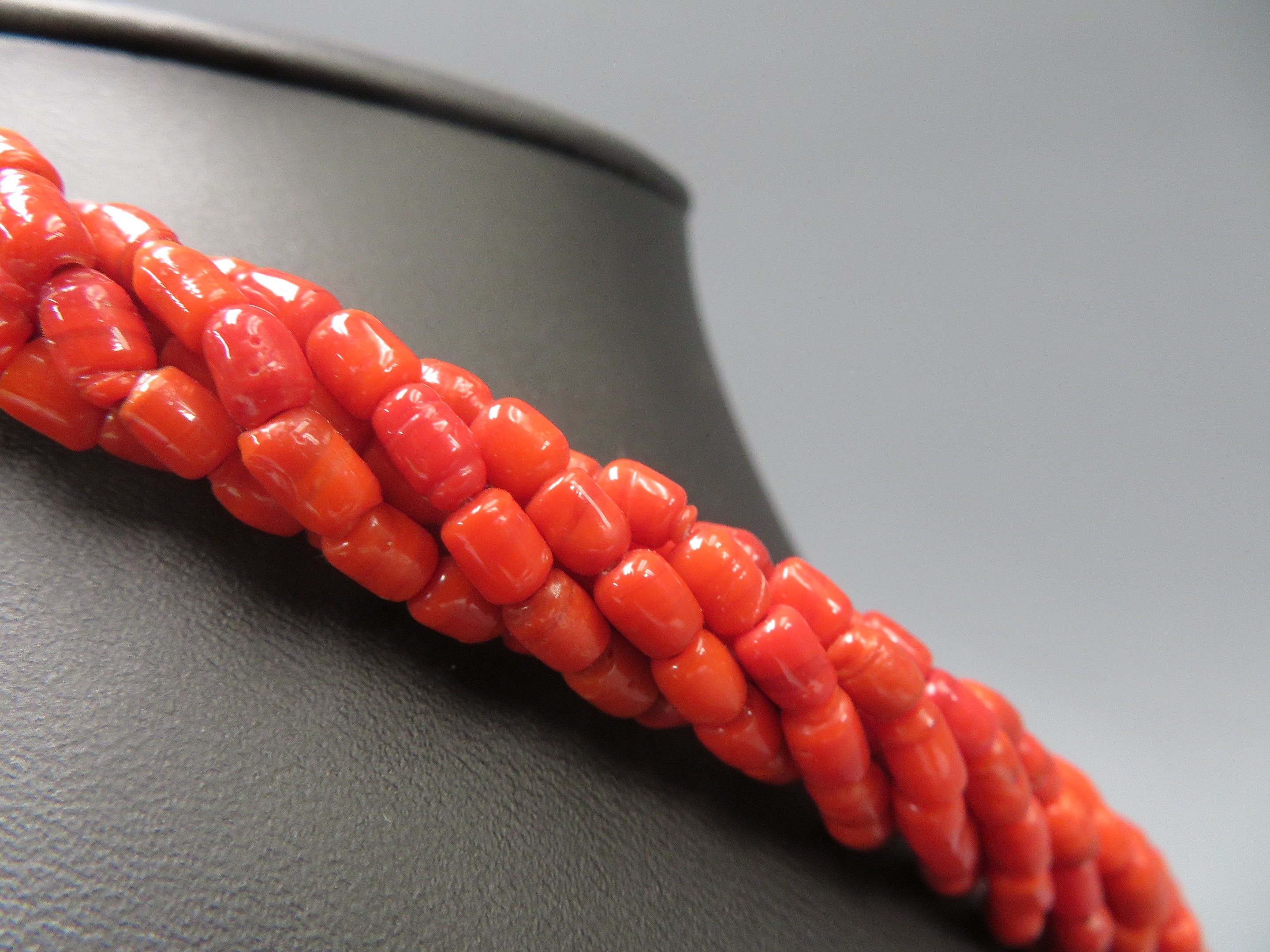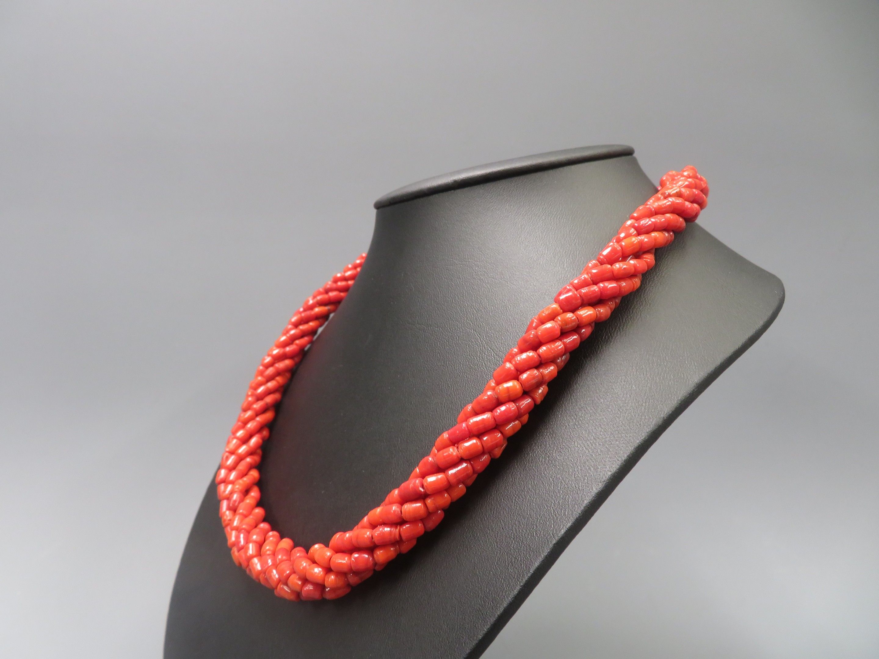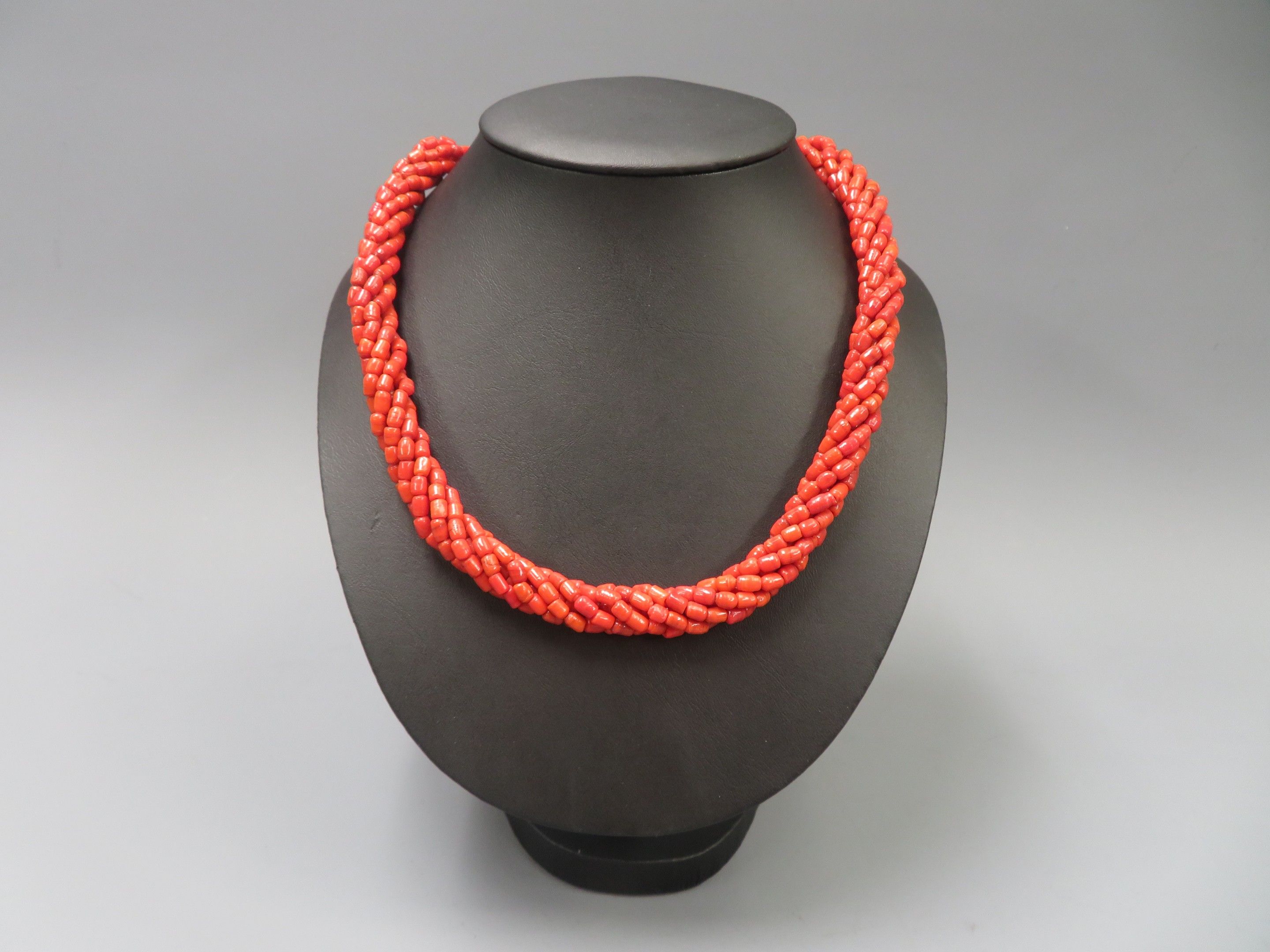 Twisted coral-coloured glass bead necklace. Length 51 cm