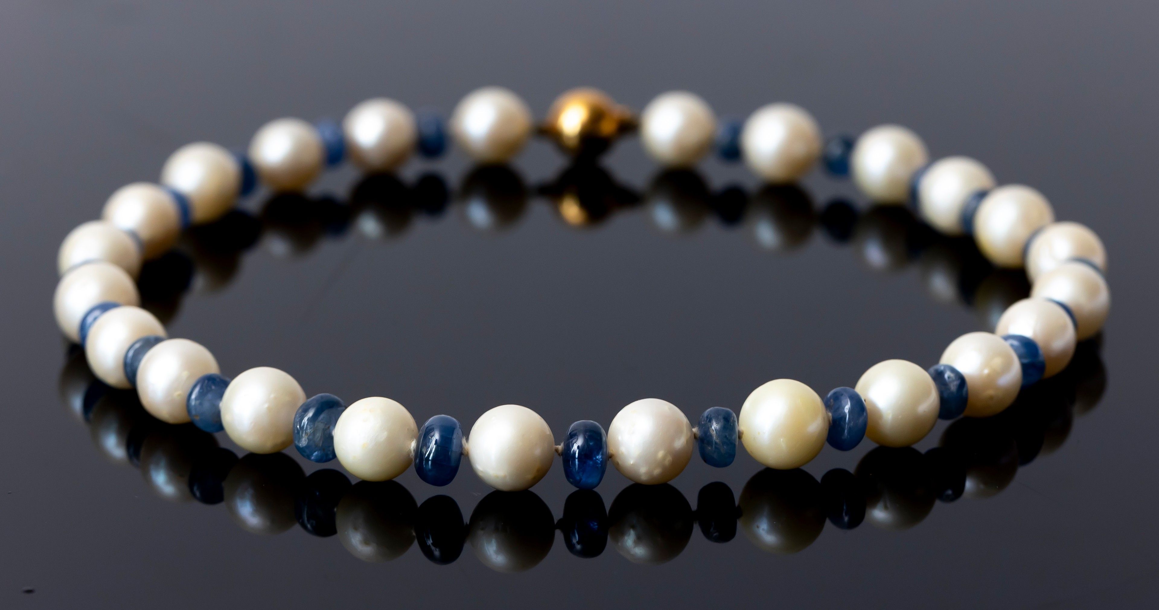 A necklace of cultured pearls and sapphire beads, clasp in y…