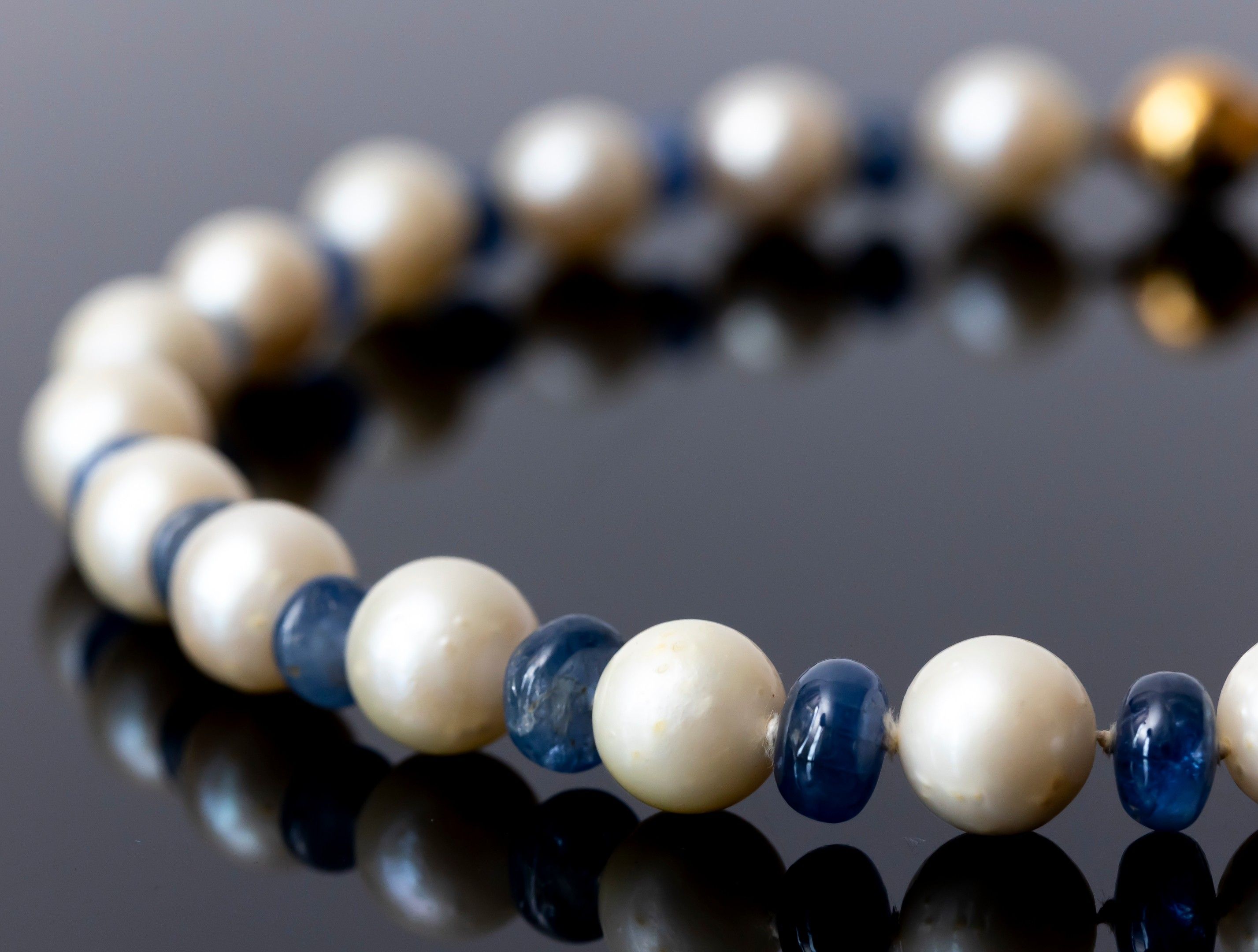 A necklace of cultured pearls and sapphire beads, clasp in yellow gold 750‰. Length: 41 cm. Gross weight: 54.19 g.