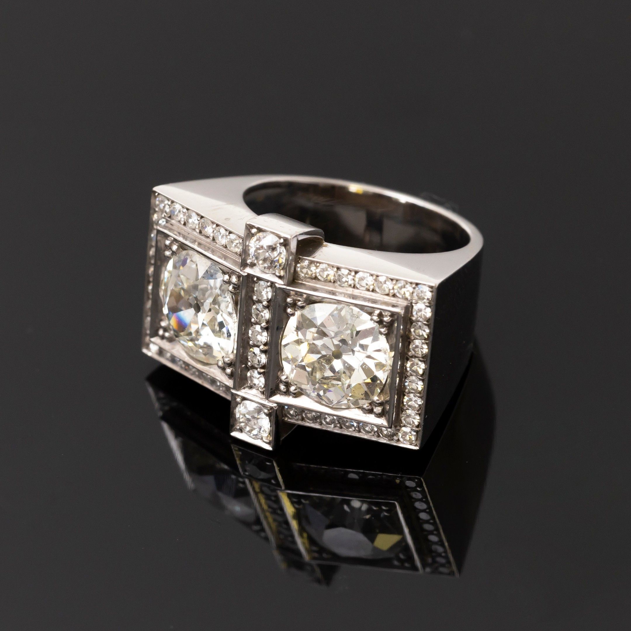 A 750‰ white gold ring set with two old-cut diamonds each weighing approximately 2 carats within a 1930-style diamond surround. T. 53. Gross weight: 17.54 g.