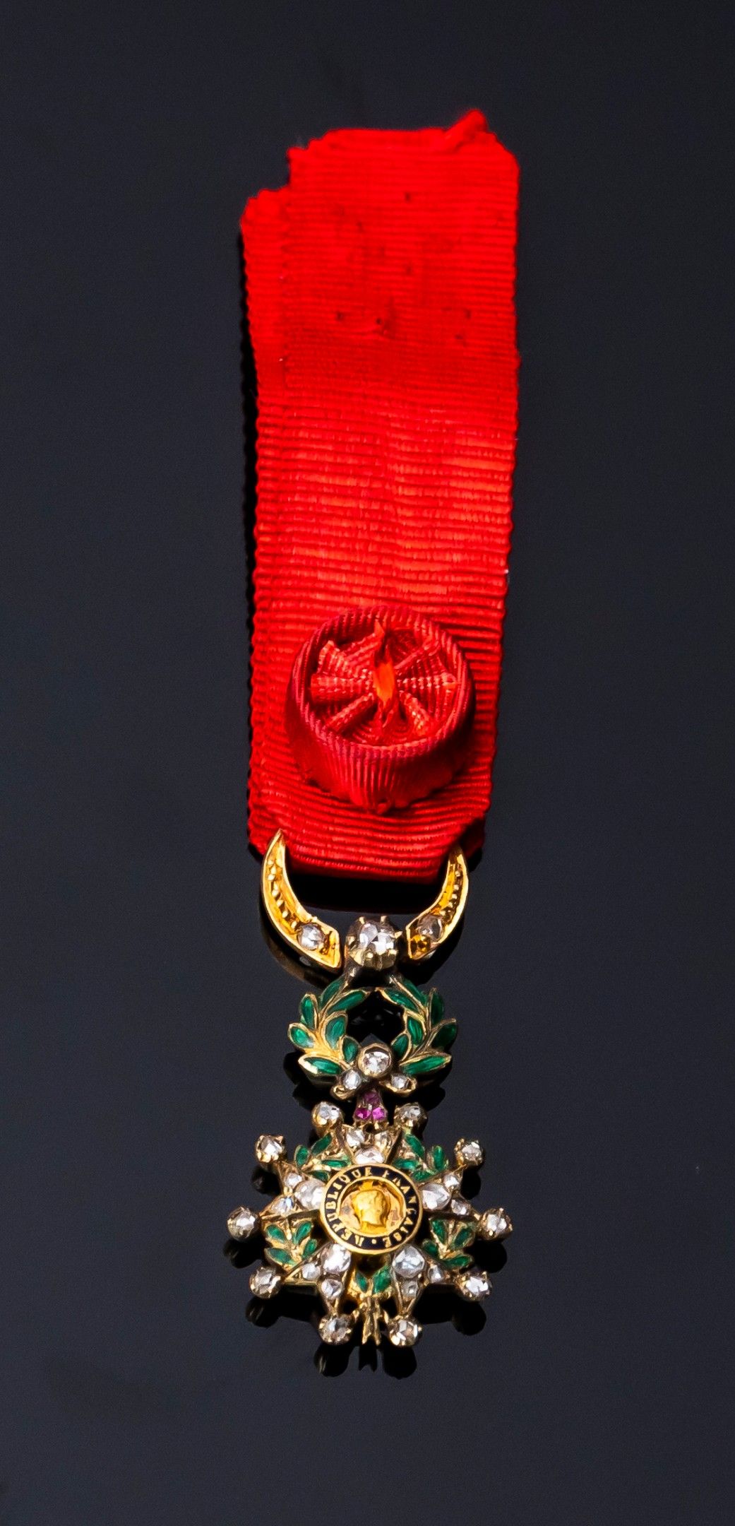 FRANCE. Miniature officer's medal of the Legion of Honour in 750‰ enamelled gold and diamonds. Height. 6.5 cm. Gross weight: 3.48 g.