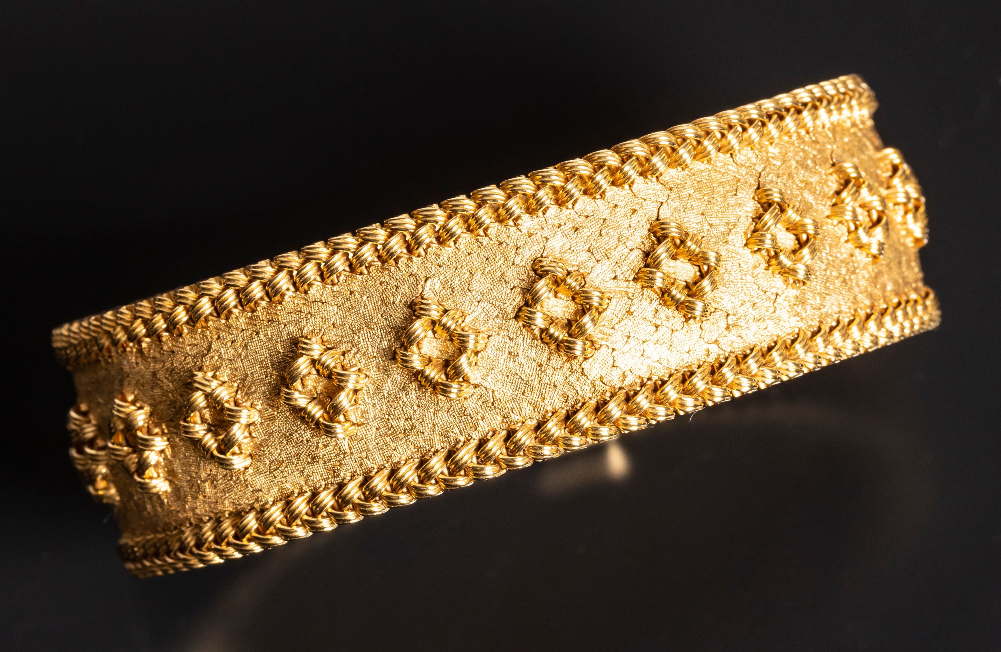 A supple ribbon bracelet in yellow gold 750‰. Eagle head hallmark. Length: 19 cm. Width: 2.2 cm. Weight: 65.53 g.