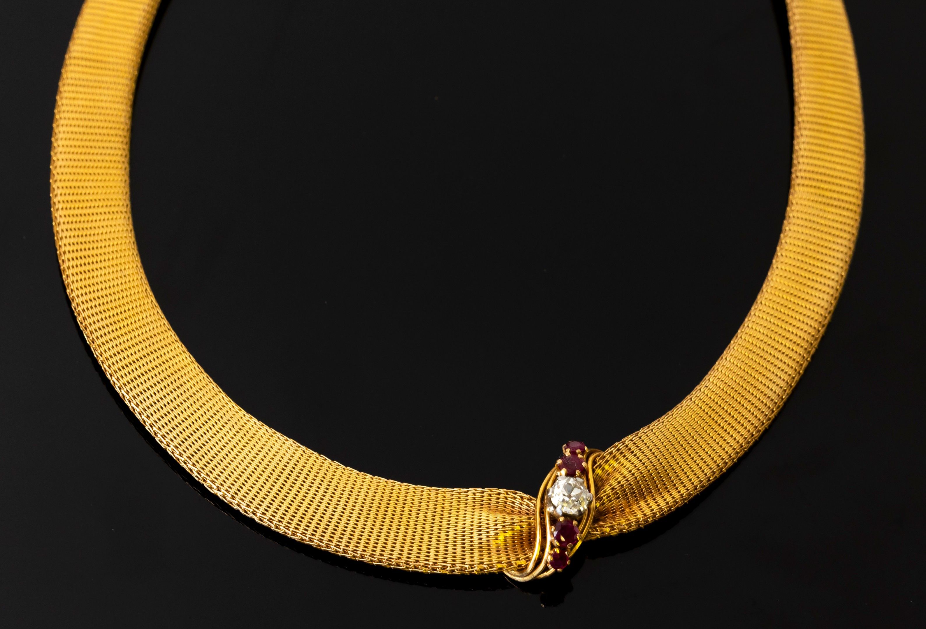 A 750‰ yellow gold necklace set at its centre with an old-cut diamond weighing approximately 0.60ct shouldered by four rubies. Eagle head hallmarks. French work, 1950-1960. Length : 43 cm. Gross weight: 74.98 g.