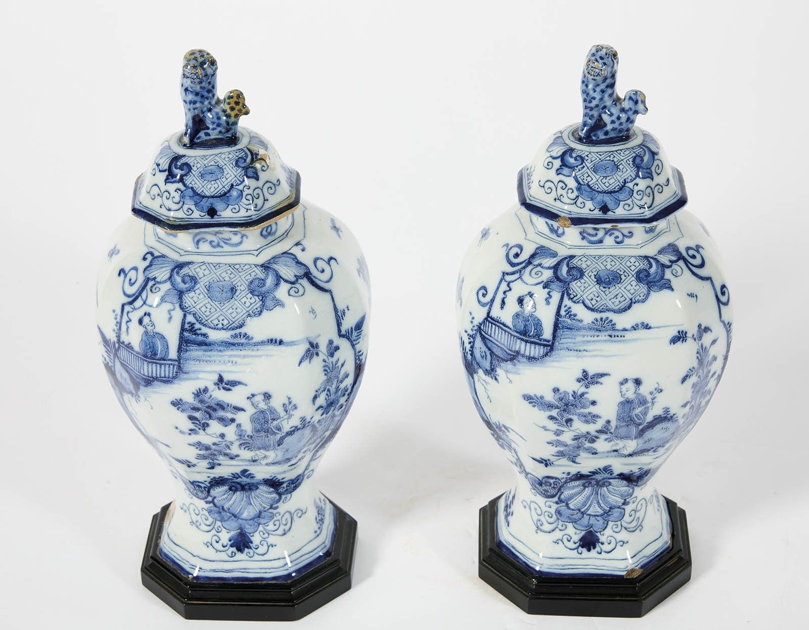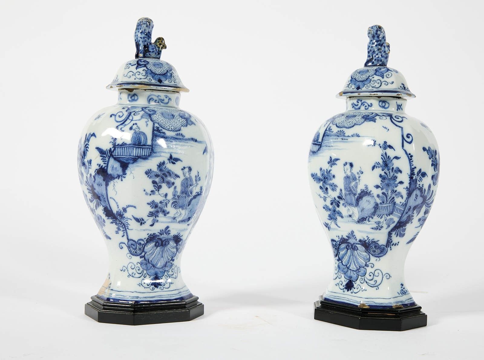 A pair of tin-glazed earthenware covered vases decorated with Chinese figures in landscapes. Period: second half of the 18th century. On later wooden bases. Condition: chips