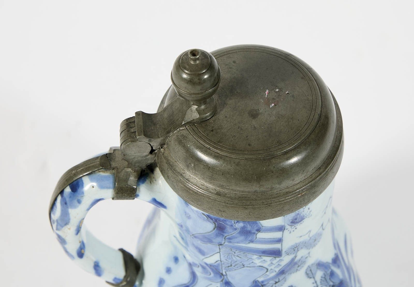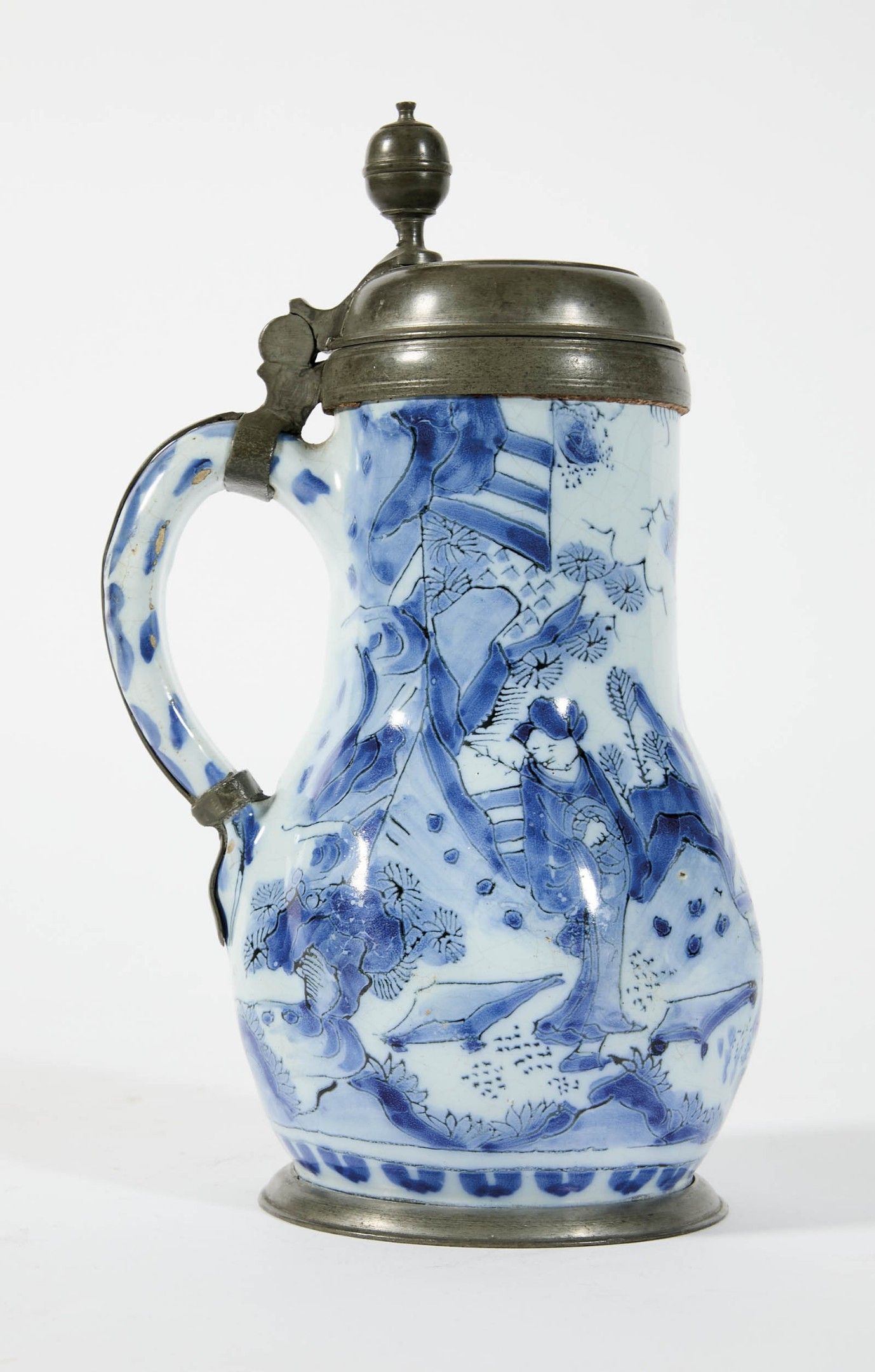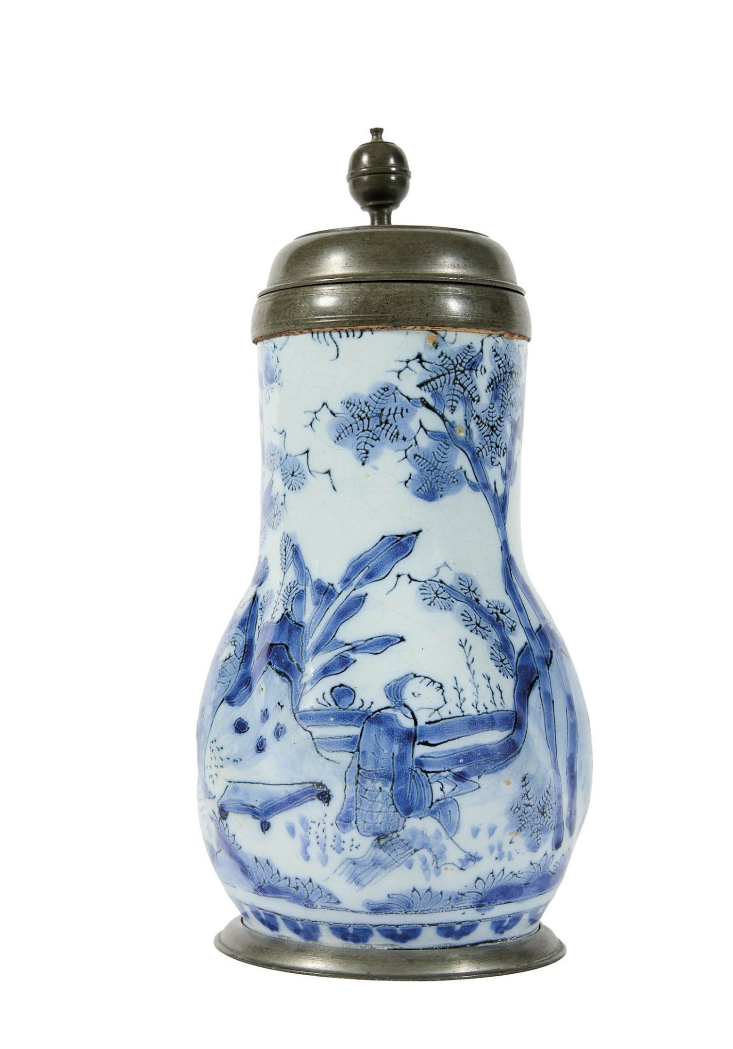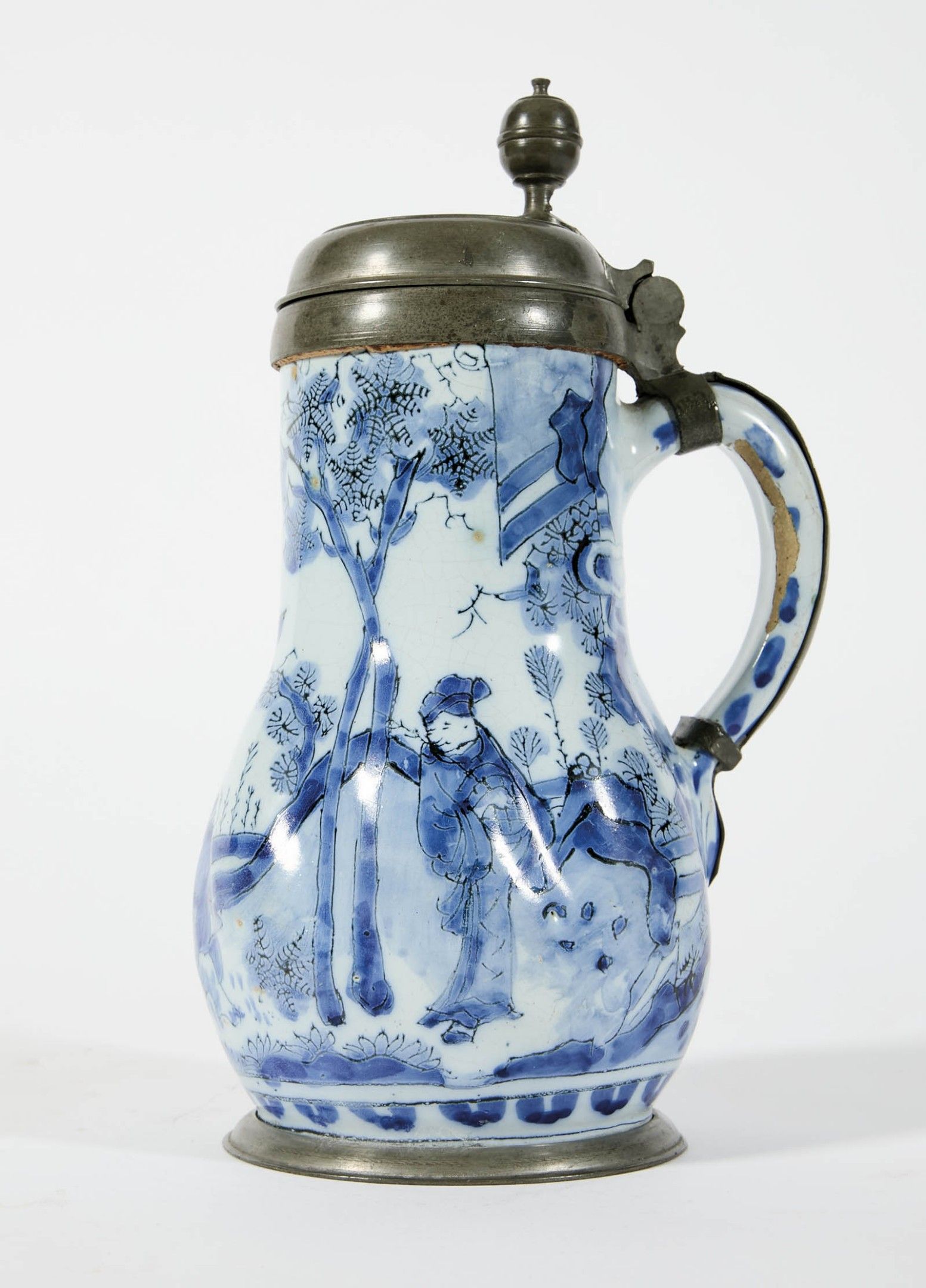 33 Delft: Twisted tin-glazed earthenware jug with Chinese decoration. Pewter frame. Period: late 17th century. Height: 26.5 cm. Condition: old restoration to the handle.