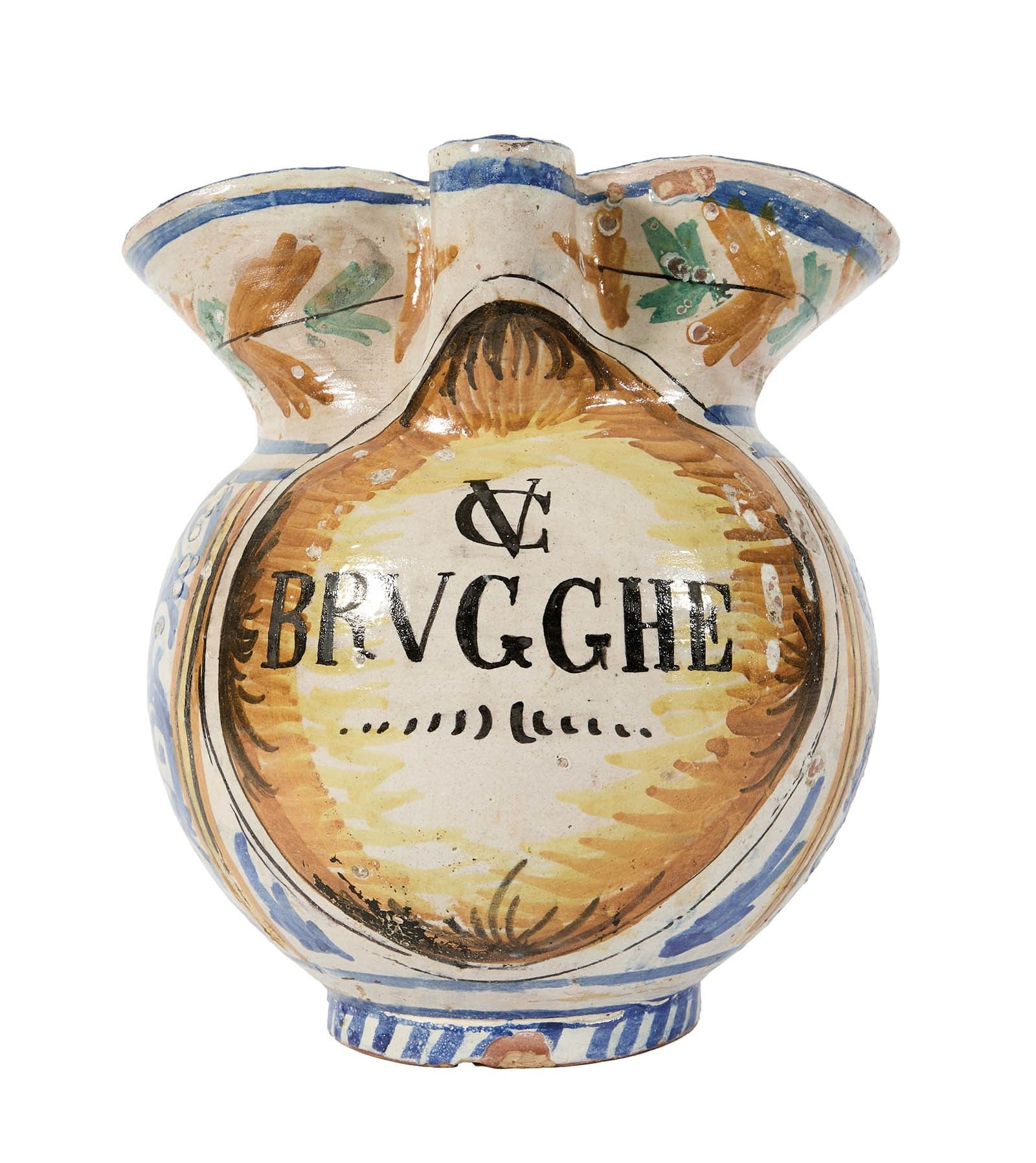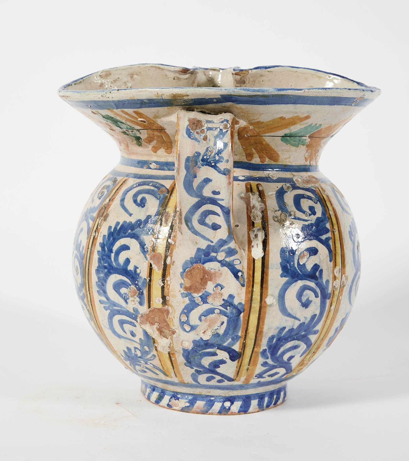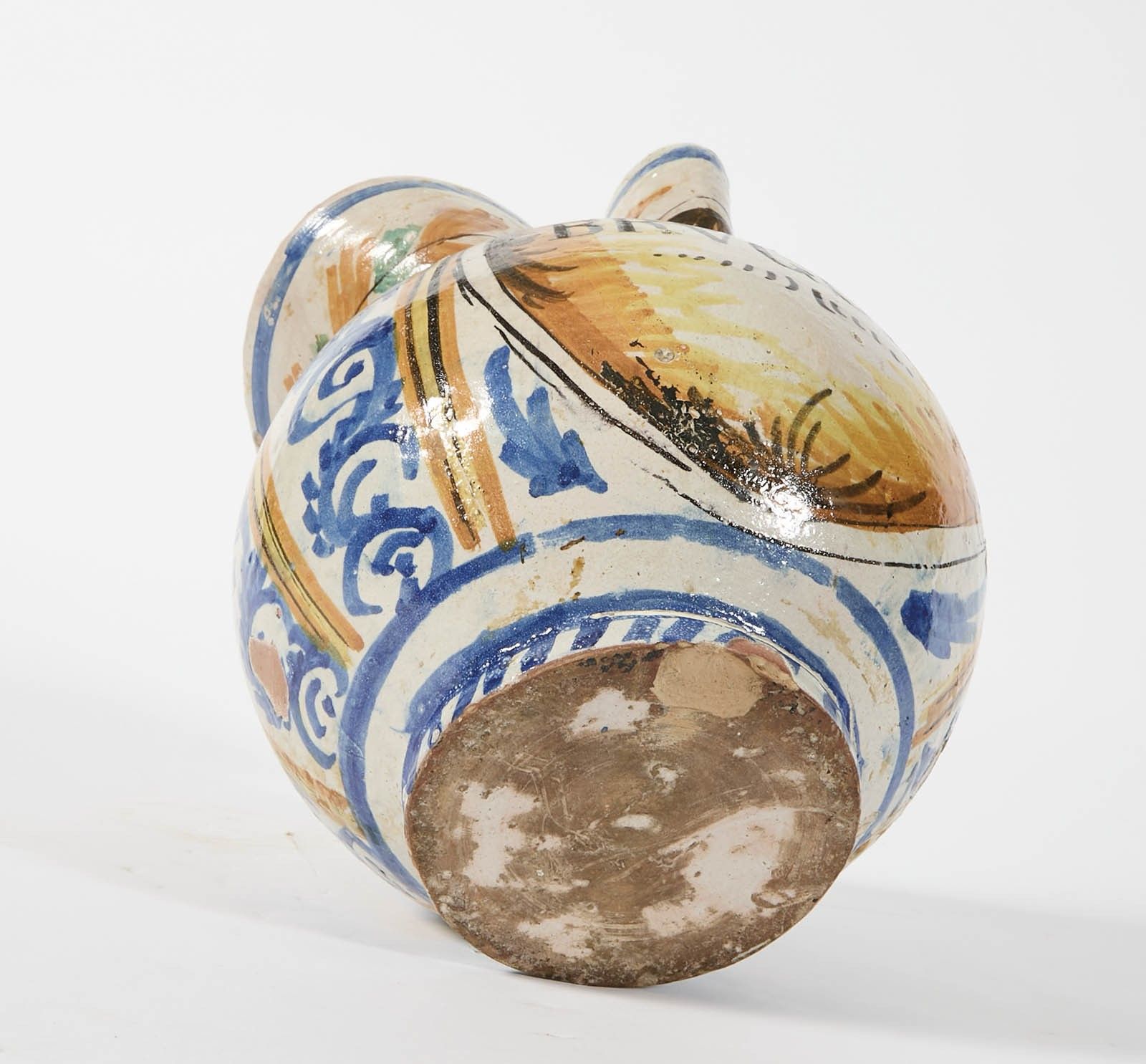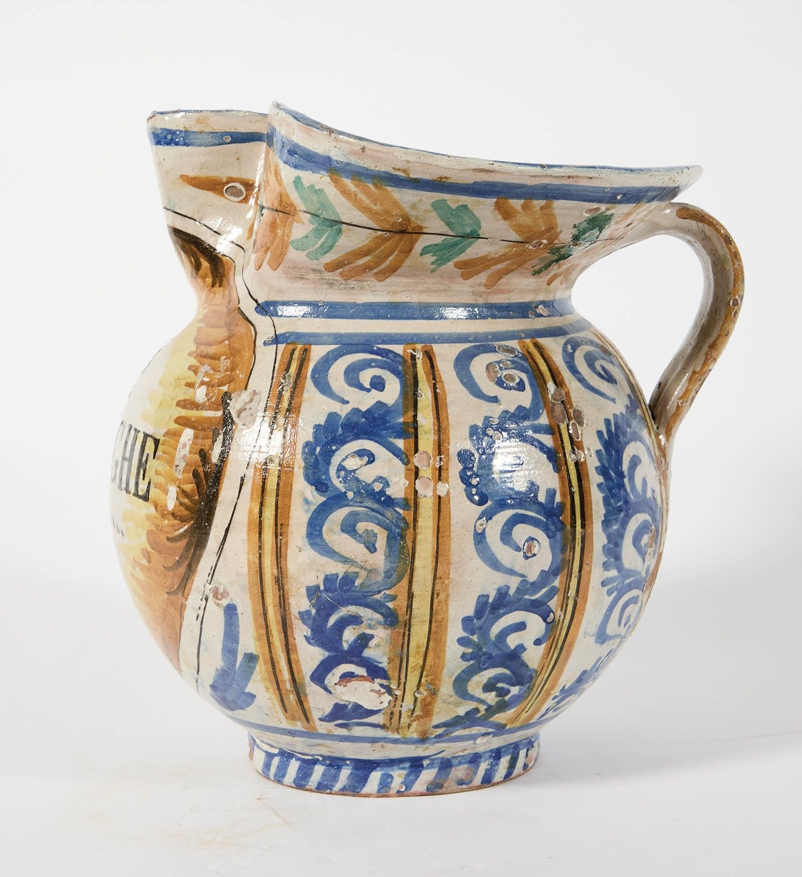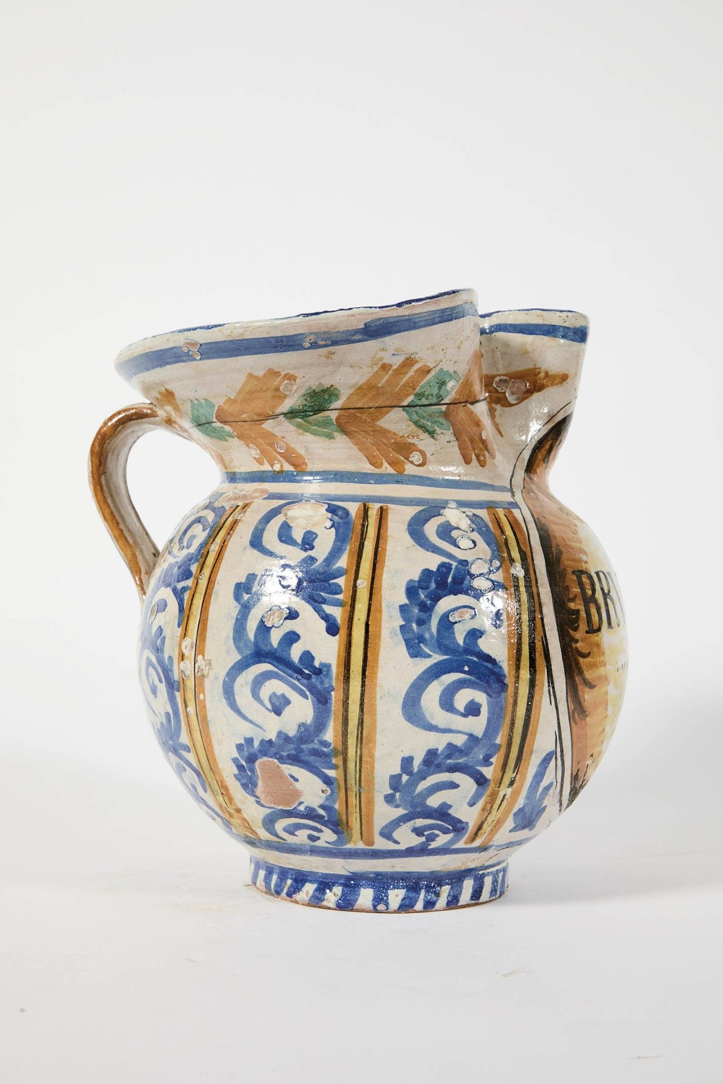 69 Pesaro : CASALI Callegari factory. Very large Brugghe jug. Late 18th - early 19th century. Size : 31 x 30 x 28.5 cm Condition : chips, firing defects of the colour.