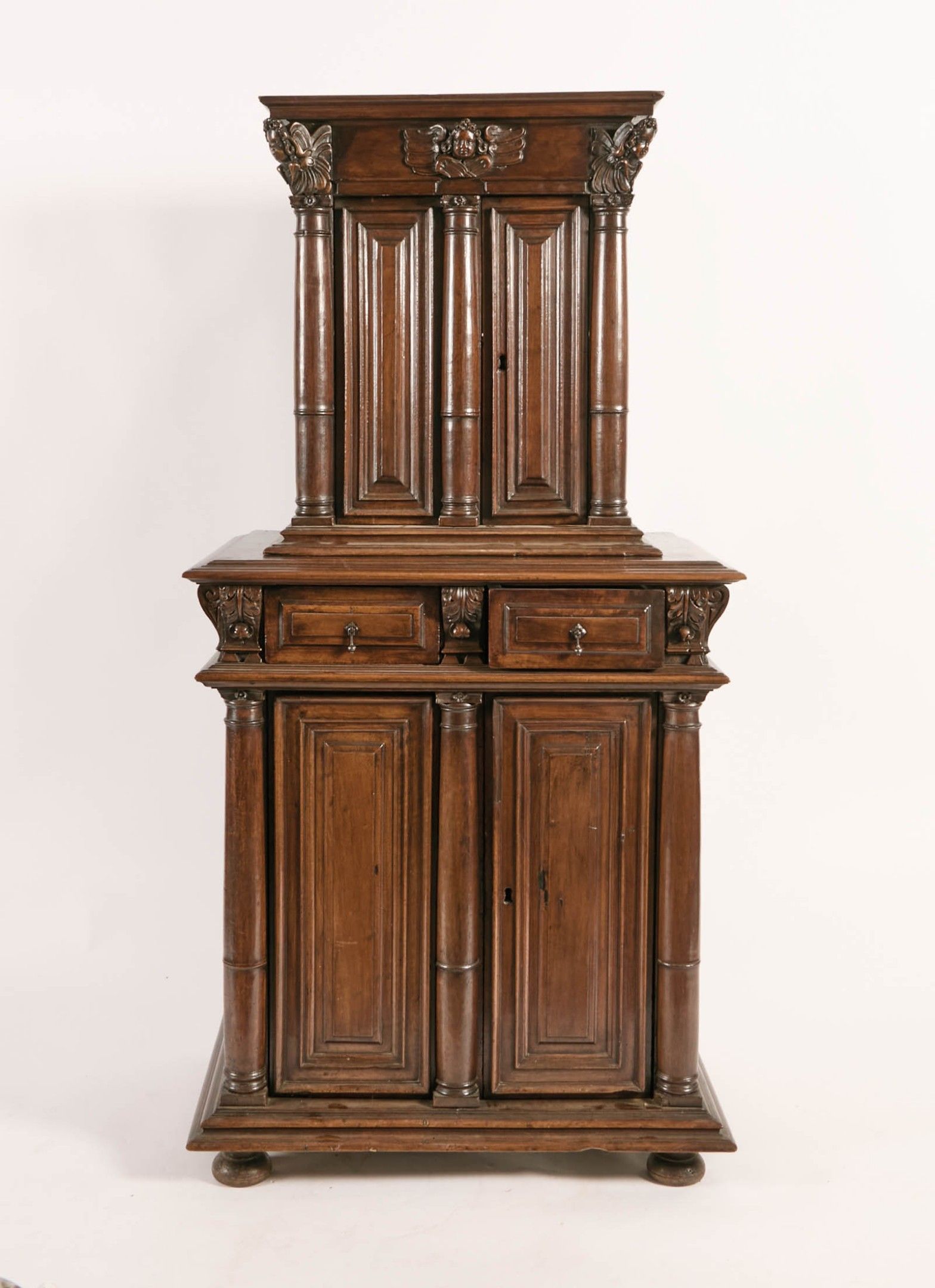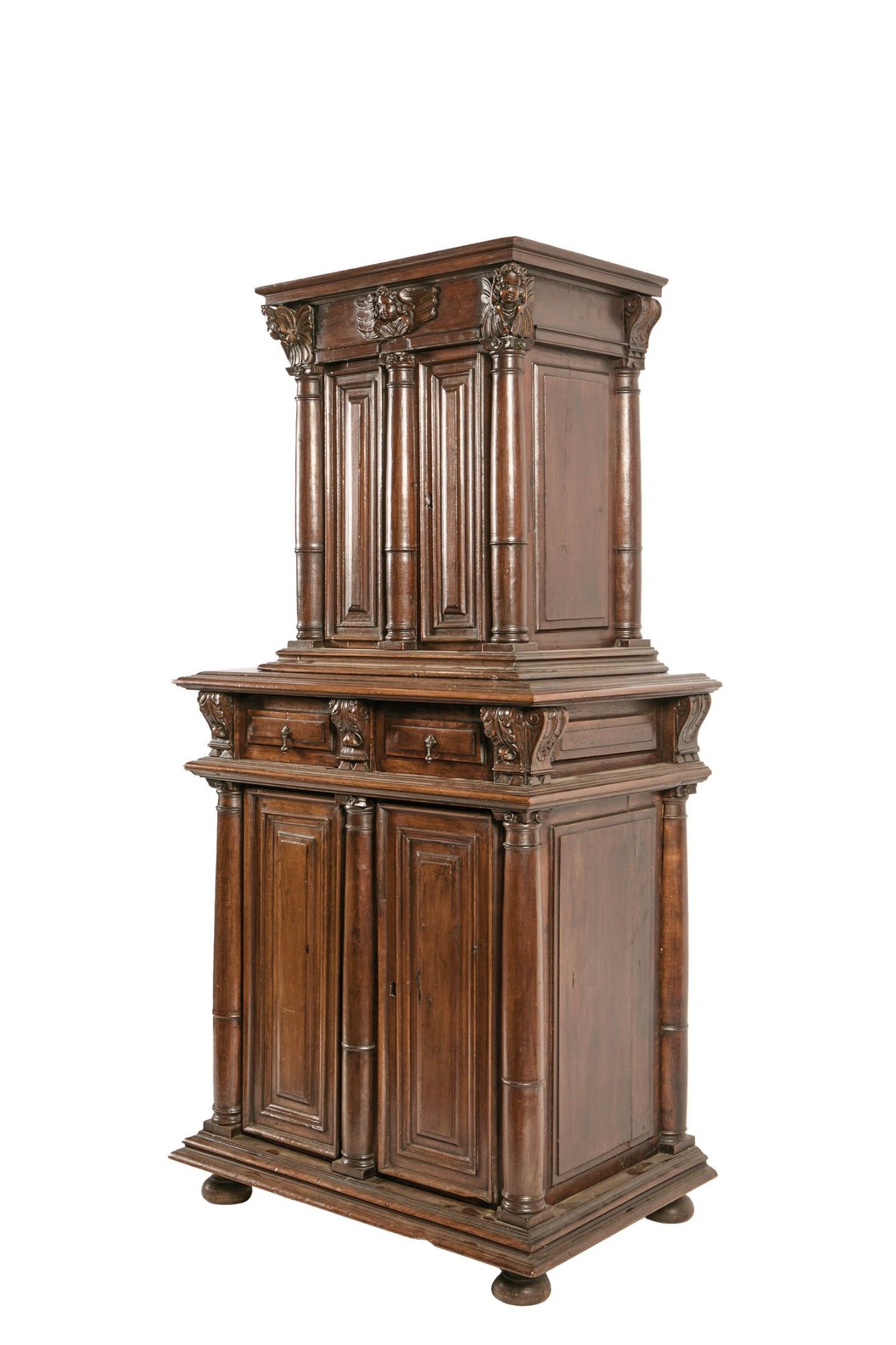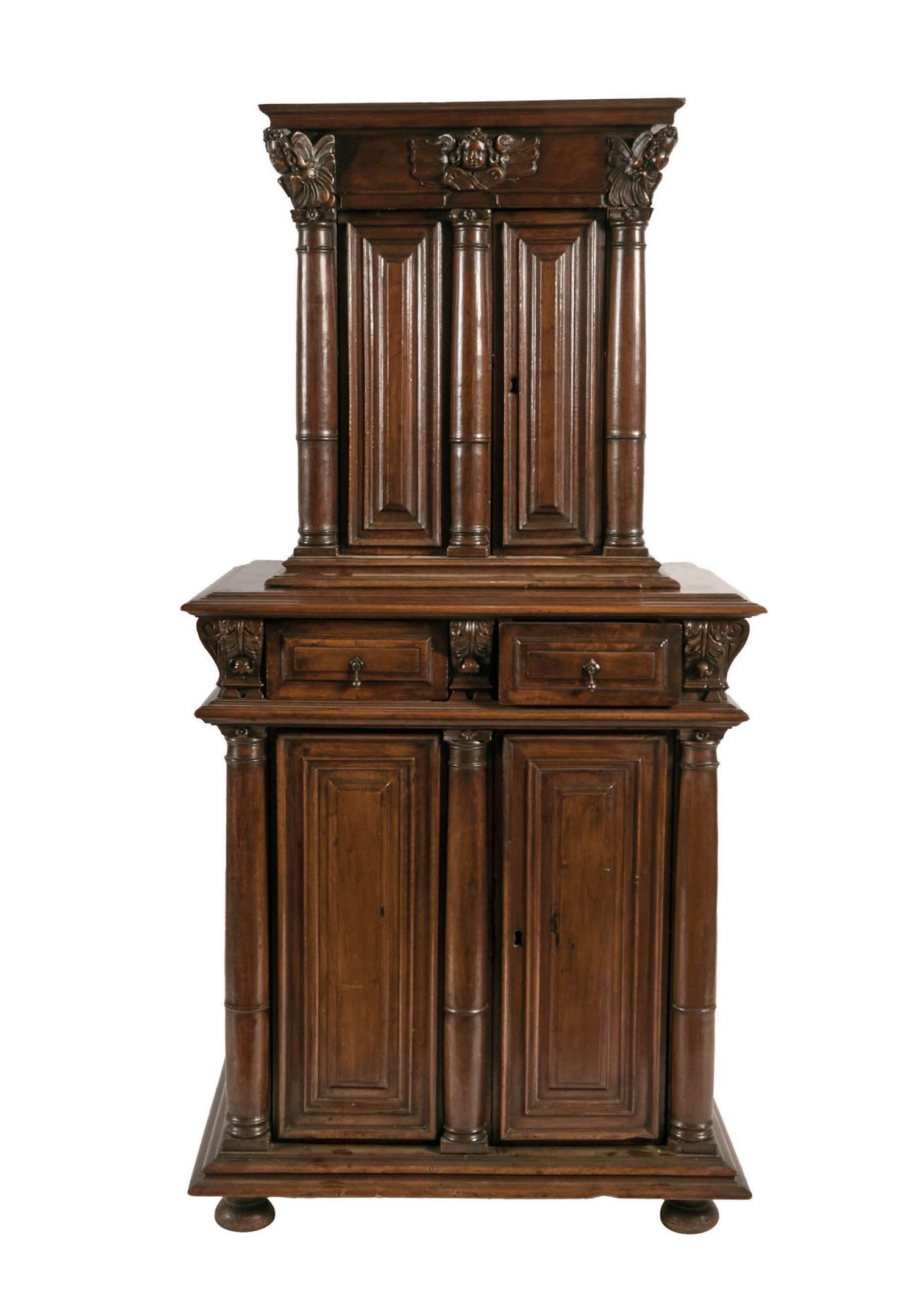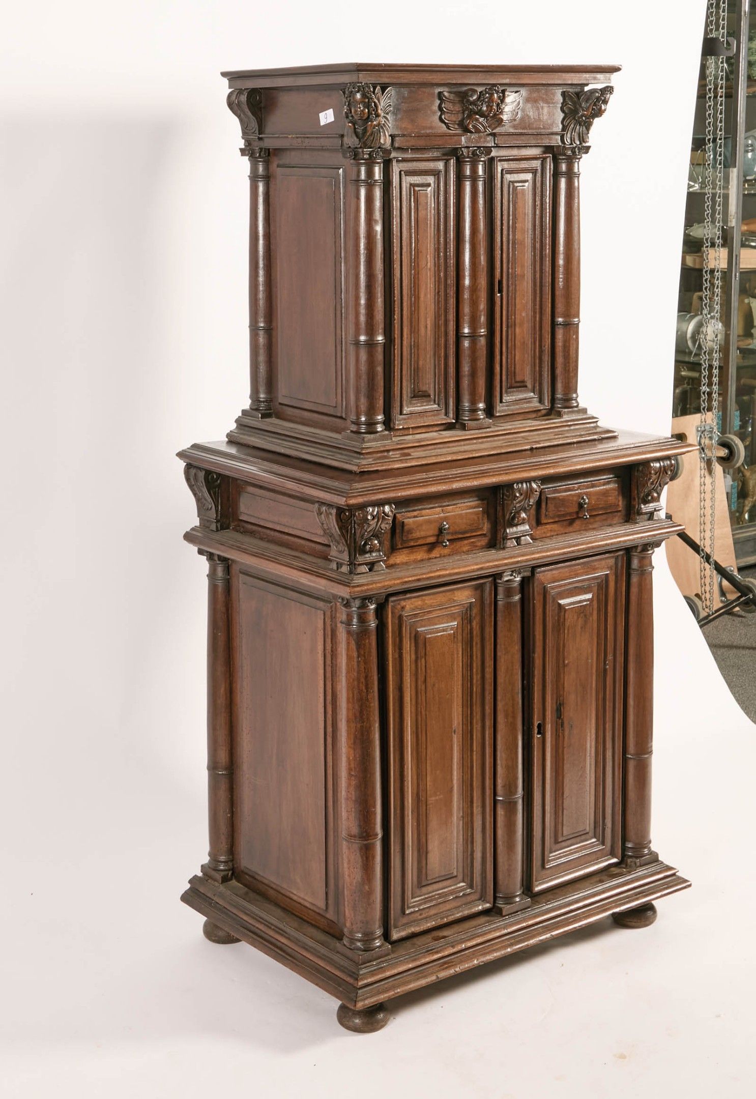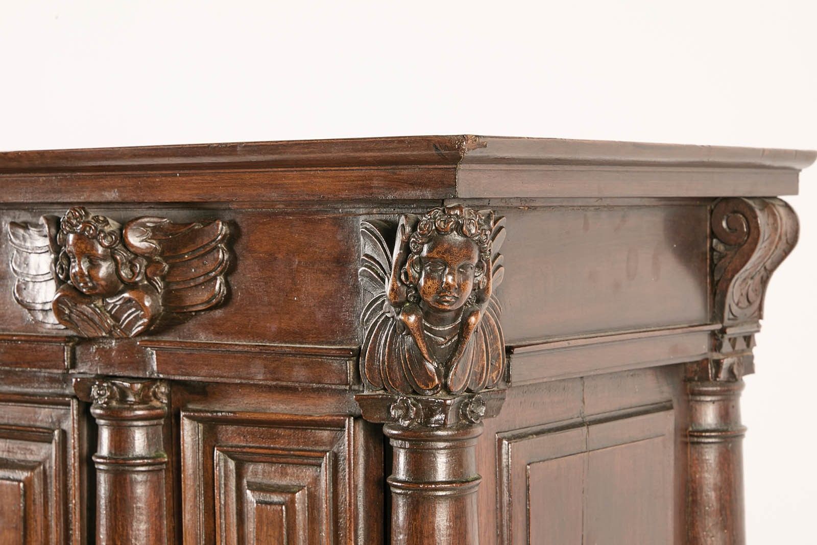 156 Two-part sideboard in moulded walnut, the fronts punctuated with half-columns, angels' heads and foliage, opening to four leaves and two drawers.