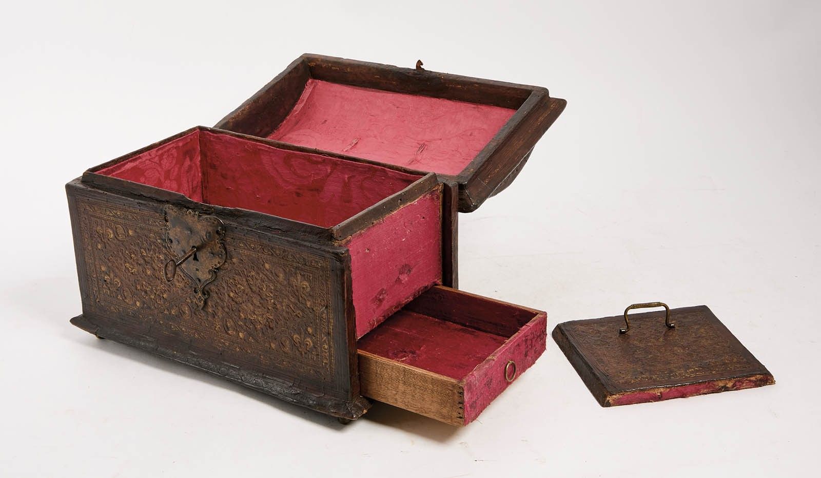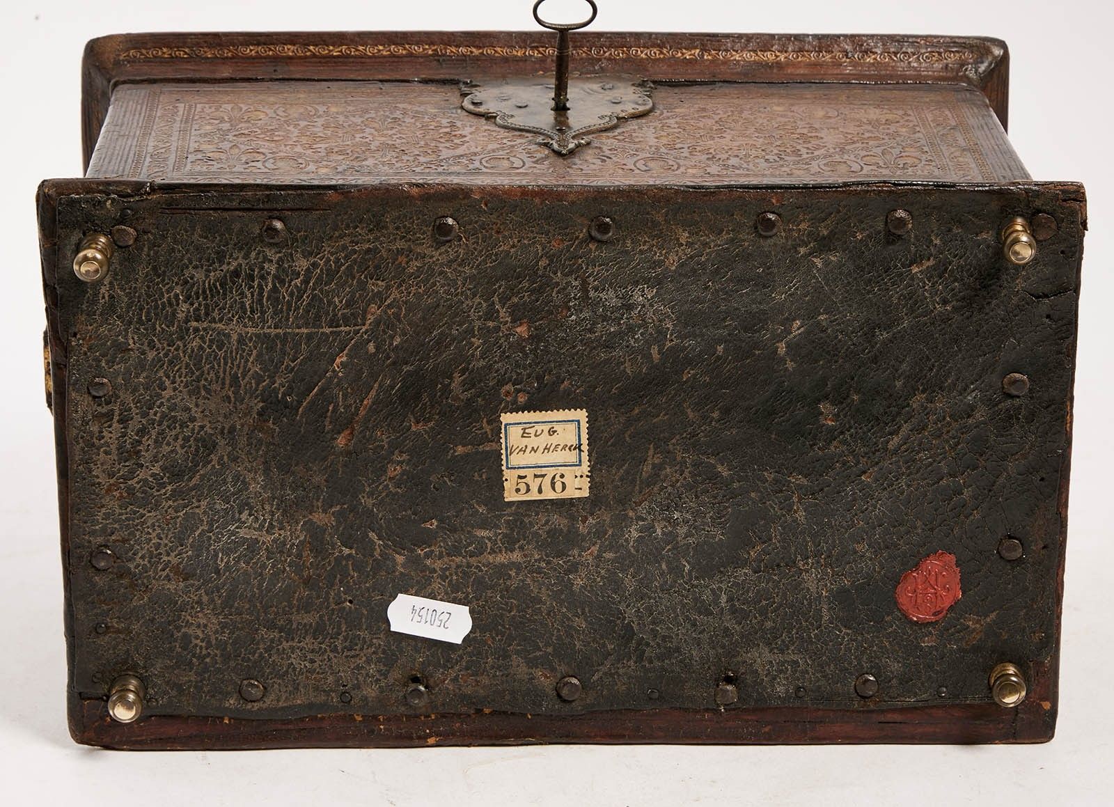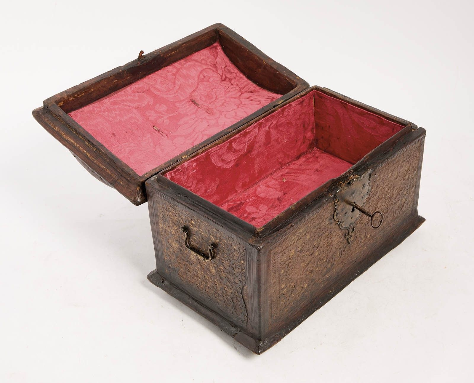 161 A handsome chest upholstered in embossed morocco with gi…
